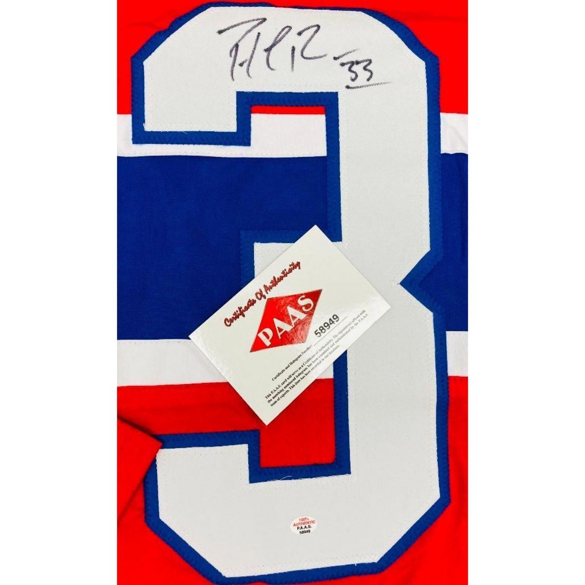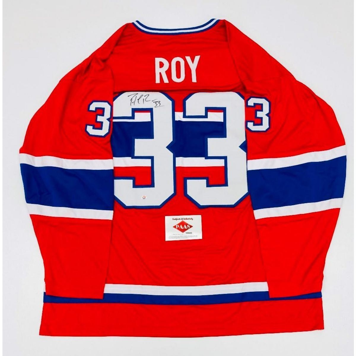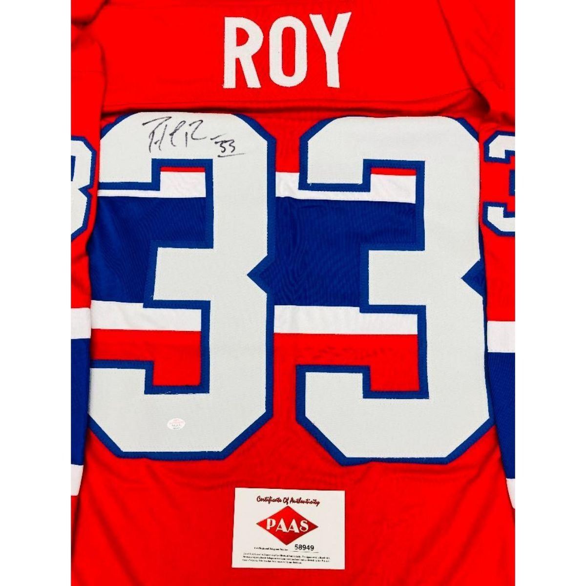 A Professionally Authenticated Patrick Roy Montreal Canadians Home Jersey Accompanied With PAAS Certificate Of Authenticity.  He has as glittering a goaltending resume as any man who has ever strapped on pads, and eccentricities to match. Patrick Roy won four Stanley Cup titles, and talked to his goal posts. He was named the Conn Smythe winner as playoff MVP three times -- the only player in NHL annals who can say that -- and wrote the names of his kids on his goalie stick. He won more than 200 games with two teams, had his famous No. 33 retired by each of them, and for years made it a practice never to skate over a red line or blue line. Please View Photos For Further Details. Â