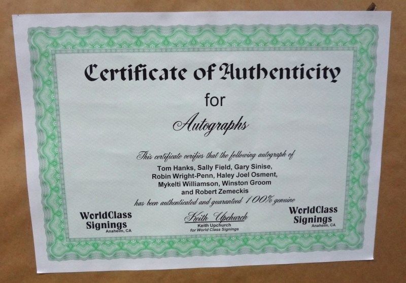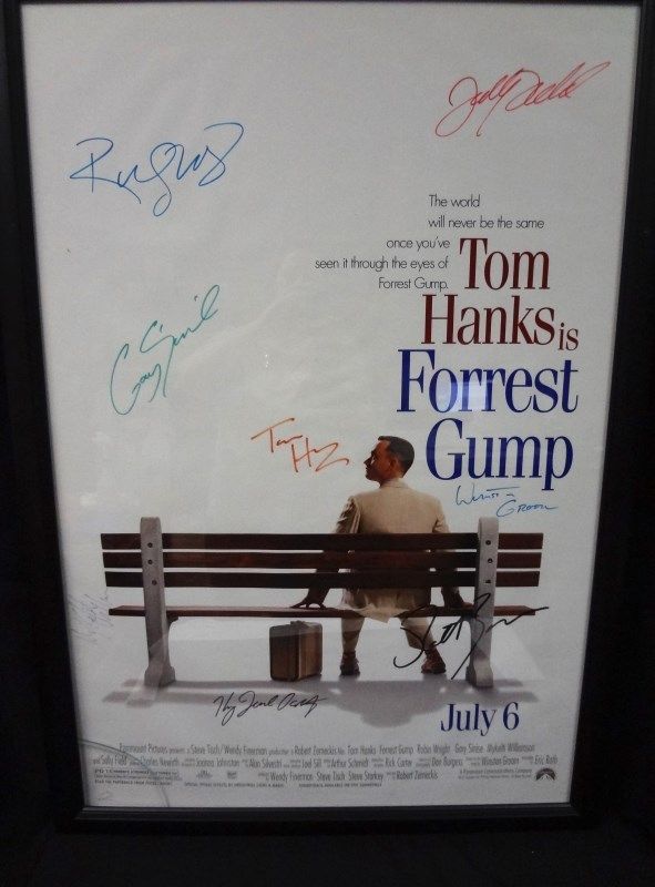 AUTOGRAPHED BY TOM HANKS, SALLY FIELD, GARY SINISE, ROBIN WRIGHT-PENN, HALEY JOEL OSMENT, MYKEITI WILLIAMSON, WINSTON GROOM & ROBERT ZEMECKIS. COA. EST 100.00-125.00