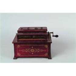 Lot # 703 AUTOMATIC MELODISTA. Made by G.H.W. Bates, Boston. Ca. 1880's 14-note paper roll, hand-operated tabletop reed organ with 5 rolls. Original finish with gold stenciling. Nice fancy Victorian S-crank. SIZE: 14" l x 9" h x 9-1/2" d. CONDITION: Generally very nice and complete. Appears to be all-original and unrestored. Currently not playing, needs bellows work. Retains original instruction decals on bottom. 1-29091 (500-700)