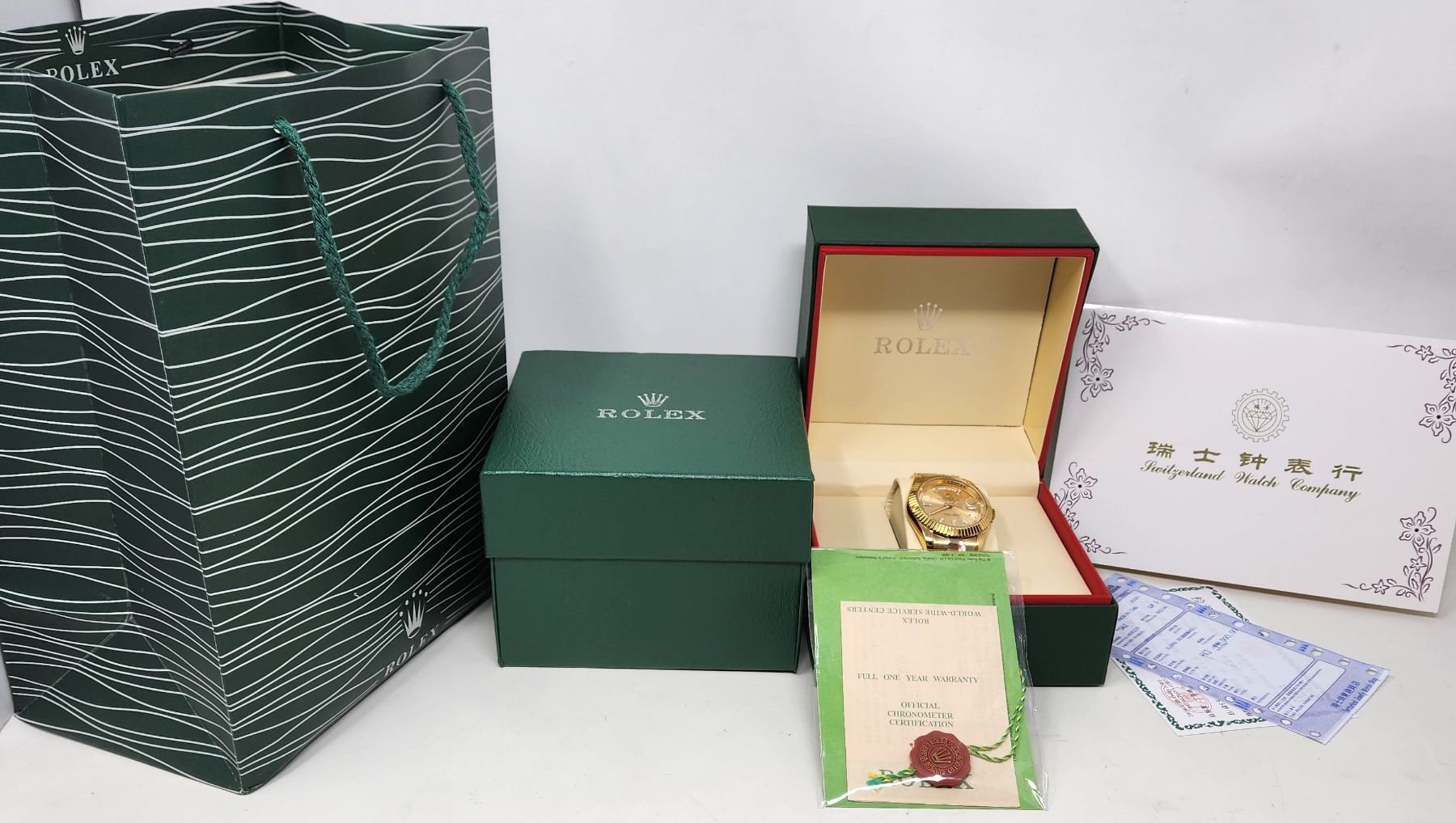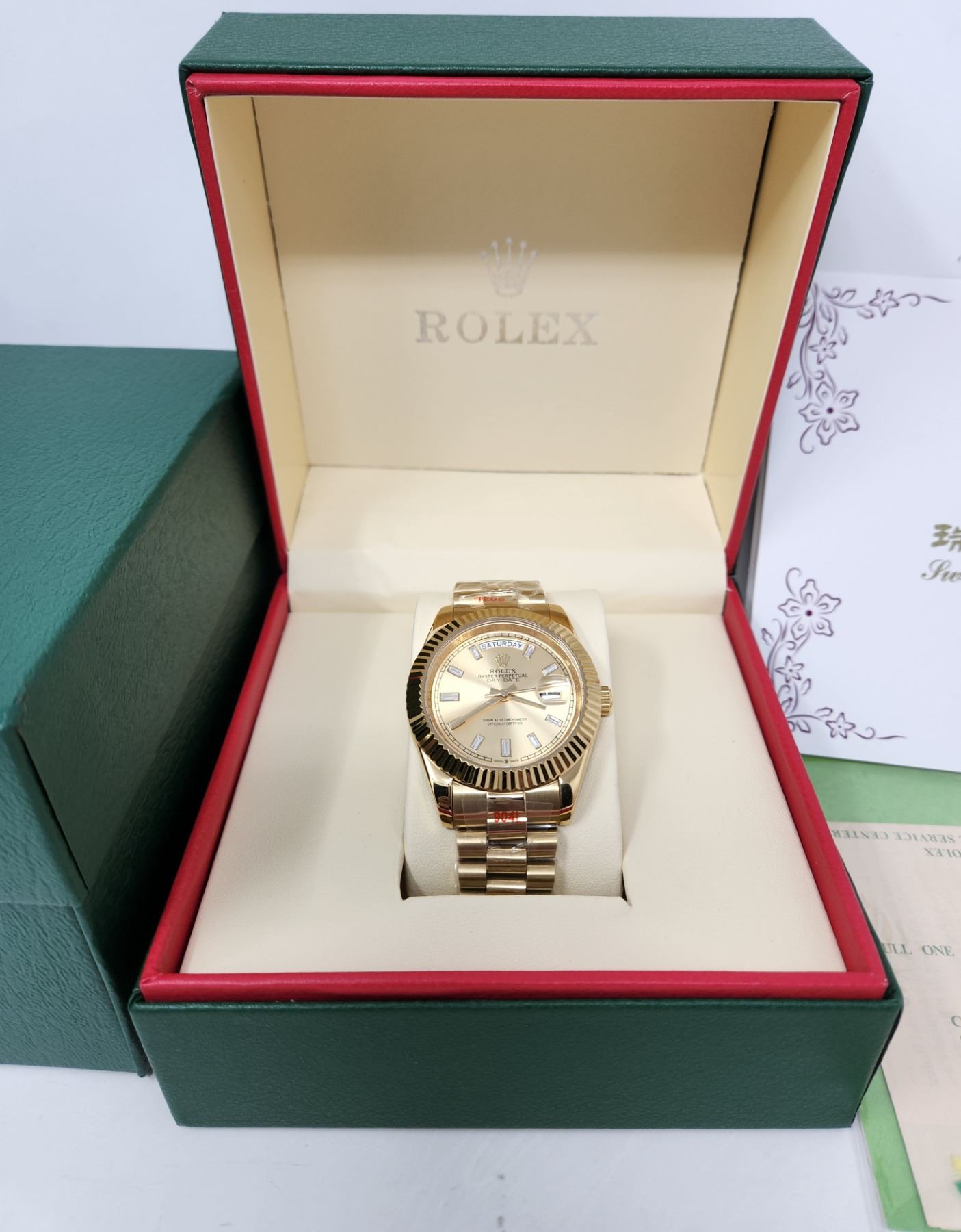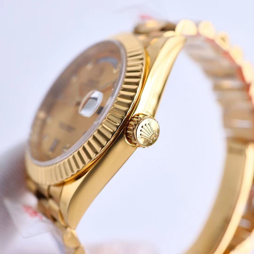 THE OYSTER PERPETUAL DAY-DATE 40 WITH A CHAMPAGNE COLOUR, CRYSTAL-SET DIAL, FLUTED BEZEL AND A PRESIDENT BRACELET. BOX, TAG, PAPERS, BAG, ALL INCLUDED.THIS TIMEPIECE IS AN EXACT REPLICA OF THE ORIGINAL. **ALL ITEMS MUST BE REMOVED BY 5PM SATURDAY, AUGUST 26TH 2023. ALL REMAINING ITEMS WILL BE SUBJECT TO A $6.00 PER DAY STORAGE CHARGE. ANY ITEMS REMAINING AFTER MONDAY, SEPTEMBER 11TH, 2023 WILL BE CONSIDERED FORFEITED. NO REFUNDS WILL BE ISSUED FOR FORFEITED ITEMS. TO SCHEDULE A PICK UP APPOINTMENT CLICK HERE