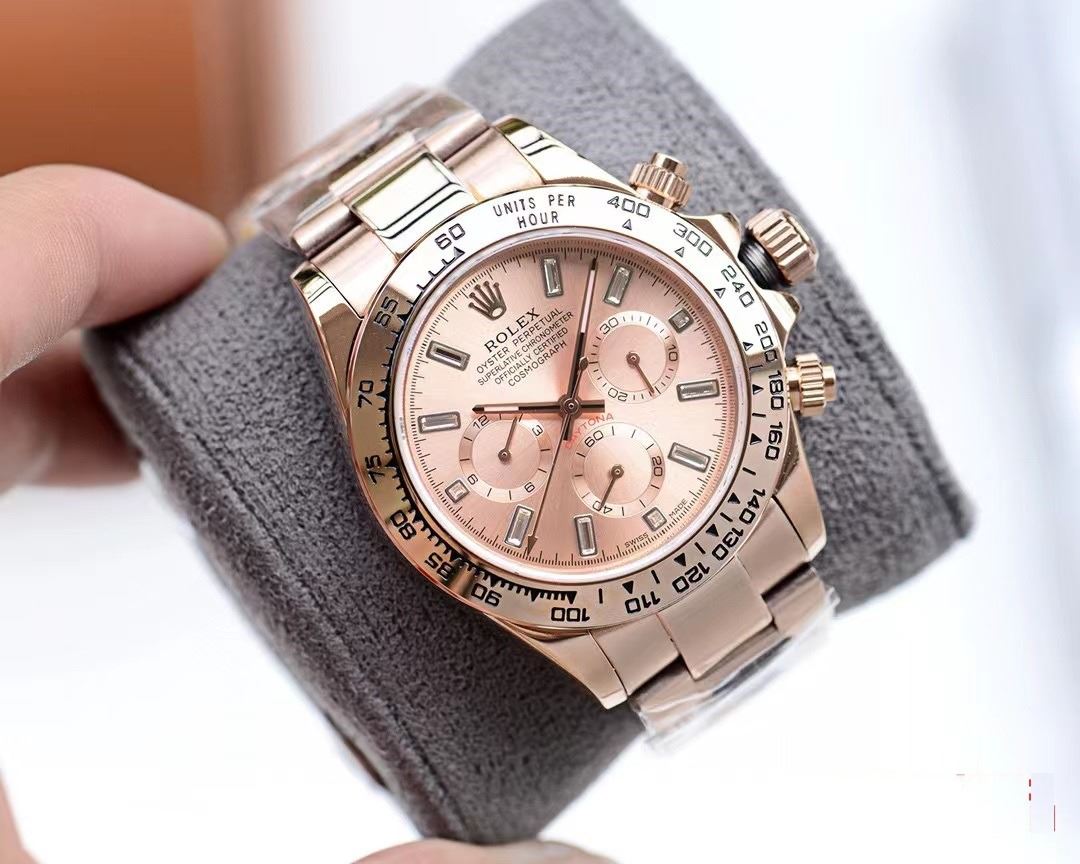 COSMOGRAPH 116505. THIS OYSTER PERPETUAL COSMOGRAPH DAYTONA IN ROSE GOLD COLOR BRACELET WITH A ROSEGOLD COLOR DIAL AND AN OYSTER STYLE BRACELET, FEATURES A BAGUETTE STYLE CRYSTALS MARKERS WITH A TACHYMETRIC SCALE. BOX, TAG, PAPERS, ALL INCLUDED.THIS TIMEPIECE IS REPLICA OF THE ORIGINAL. **ALL ITEMS MUST BE REMOVED BY 5PM SATURDAY, JUNE 21ST 2025. ALL REMAINING ITEMS WILL BE SUBJECT TO A $6.00 PER DAY STORAGE CHARGE. ANY ITEMS REMAINING AFTER MONDAY, JULY 7TH 2025 WILL BE CONSIDERED FORFEITED. NO REFUNDS WILL BE ISSUED FOR FORFEITED ITEMS. TO SCHEDULE A PICK UP APPOINTMENT CLICK HERE
