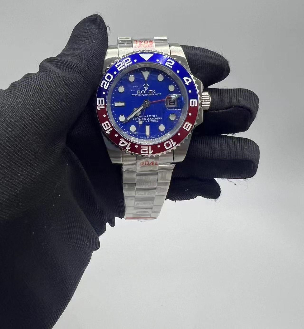 "PEPSI" WATCH. THE OYSTER PERPETUAL GMT-MASTER II FEATURES IN STEEL WITH A 40MM BLUE DIAL, PEPSI BEZEL AND A OYSTER STYLE BRACELET. BOX INCLUDED.THIS TIMEPIECE IS A REPLICA OF THE ORIGINAL **ALL ITEMS MUST BE REMOVED BY 5PM SATURDAY, FEBRUARY 8TH 2025. ALL REMAINING ITEMS WILL BE SUBJECT TO A $6.00 PER DAY STORAGE CHARGE. ANY ITEMS REMAINING AFTER MONDAY, MARCH 3RD 2025 WILL BE CONSIDERED FORFEITED. NO REFUNDS WILL BE ISSUED FOR FORFEITED ITEMS. TO SCHEDULE A PICK UP APPOINTMENT CLICK HERE