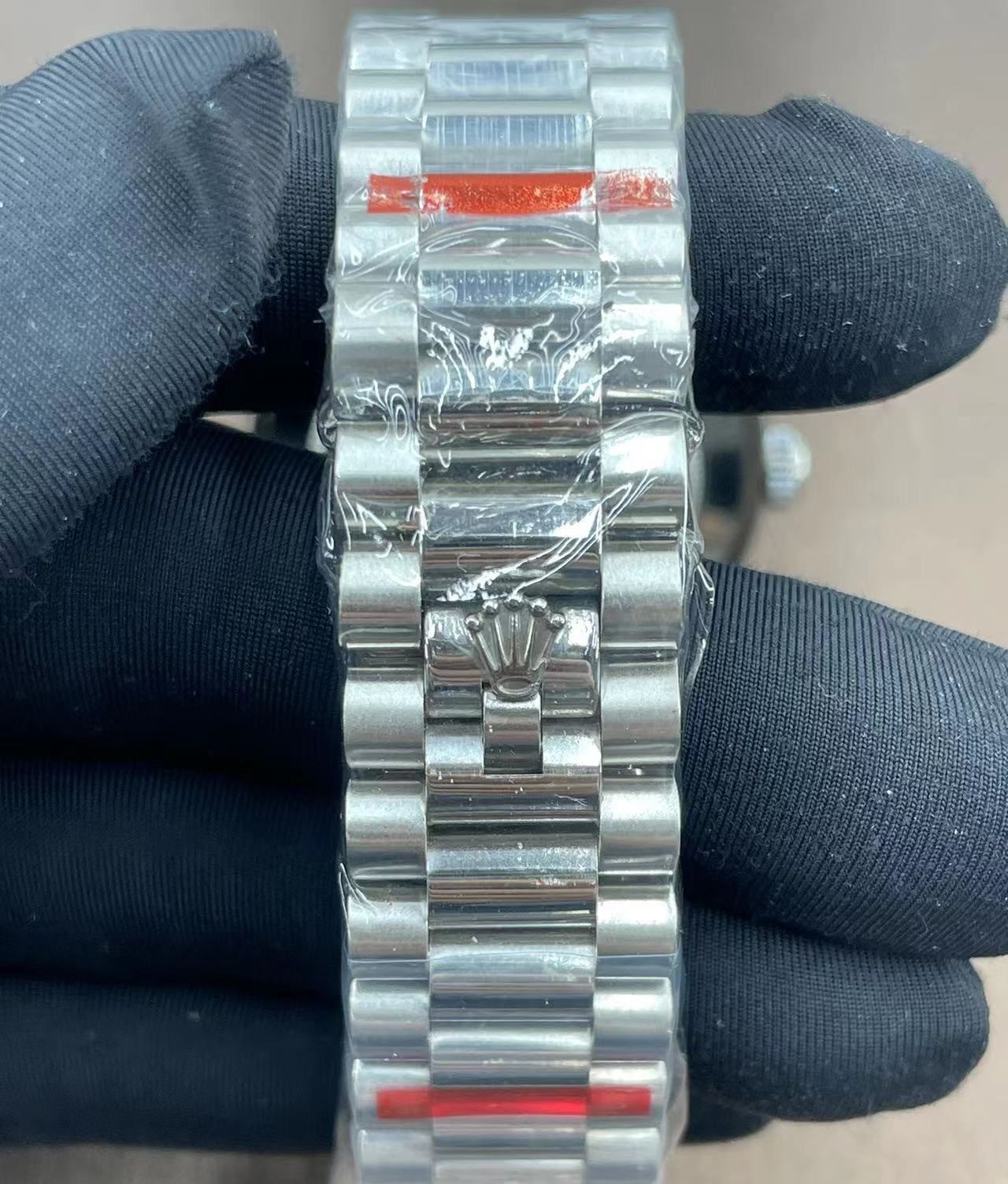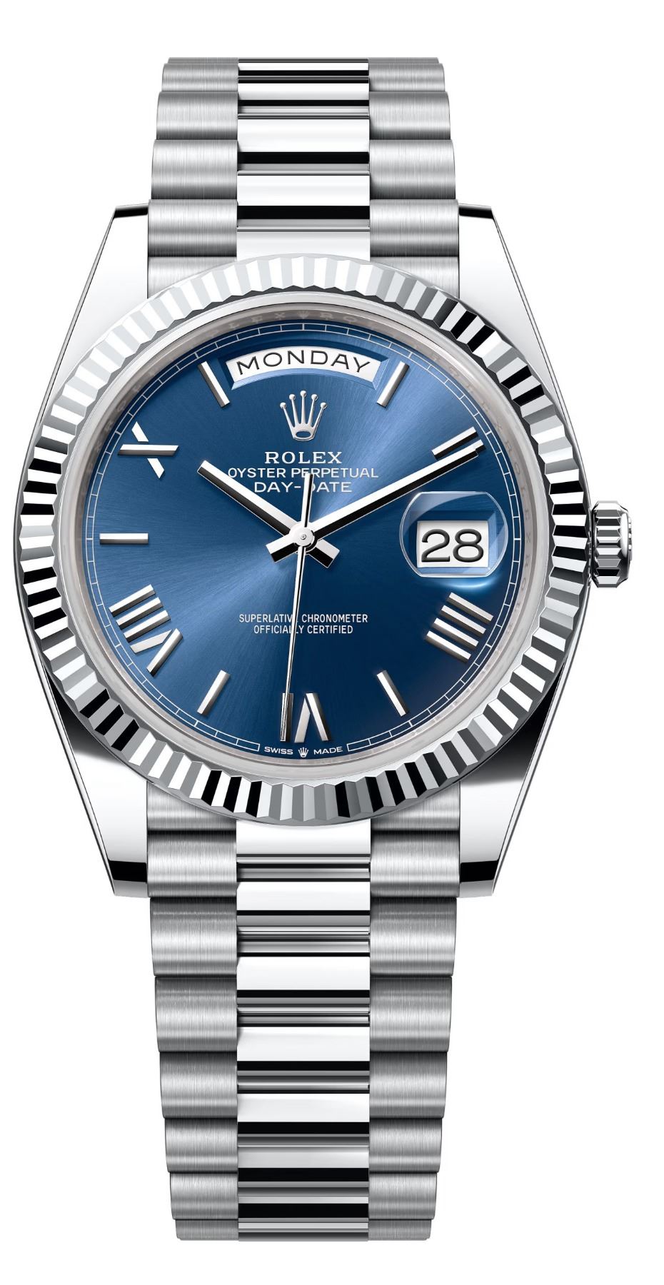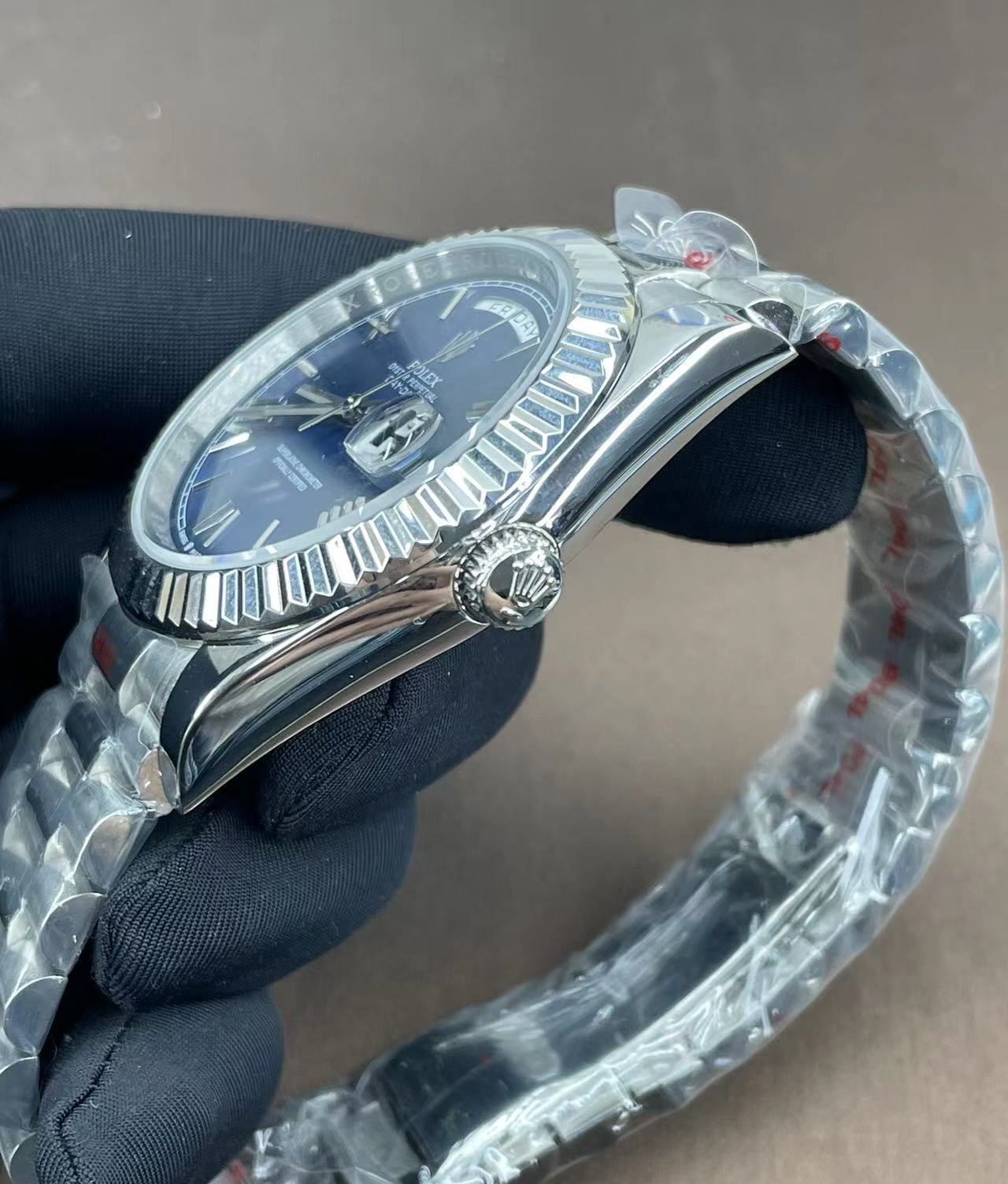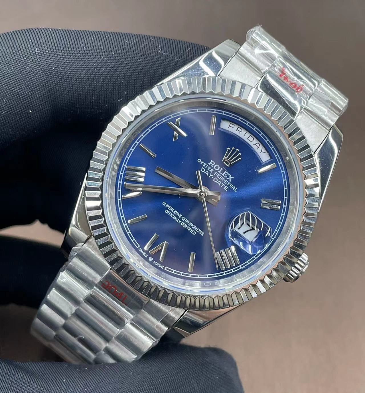 THE OYSTER PERPETUAL DAY-DATE 40 IN PLATINUM COLOR WITH A BRIGHT BLUE DIAL, FLUTED BEZEL AND A PRESIDENT BRACELET.. BOX, TAG, PAPERS, BAG, ALL INCLUDED.THIS TIMEPIECE IS AN EXACT REPLICA OF THE ORIGINAL. **ALL ITEMS MUST BE REMOVED BY 5PM SATURDAY, SEPTEMBER 21ST 2024. ALL REMAINING ITEMS WILL BE SUBJECT TO A $6.00 PER DAY STORAGE CHARGE. ANY ITEMS REMAINING AFTER MONDAY, OCTOBER 7TH 2024 WILL BE CONSIDERED FORFEITED. NO REFUNDS WILL BE ISSUED FOR FORFEITED ITEMS. TO SCHEDULE A PICK UP APPOINTMENT CLICK HERE