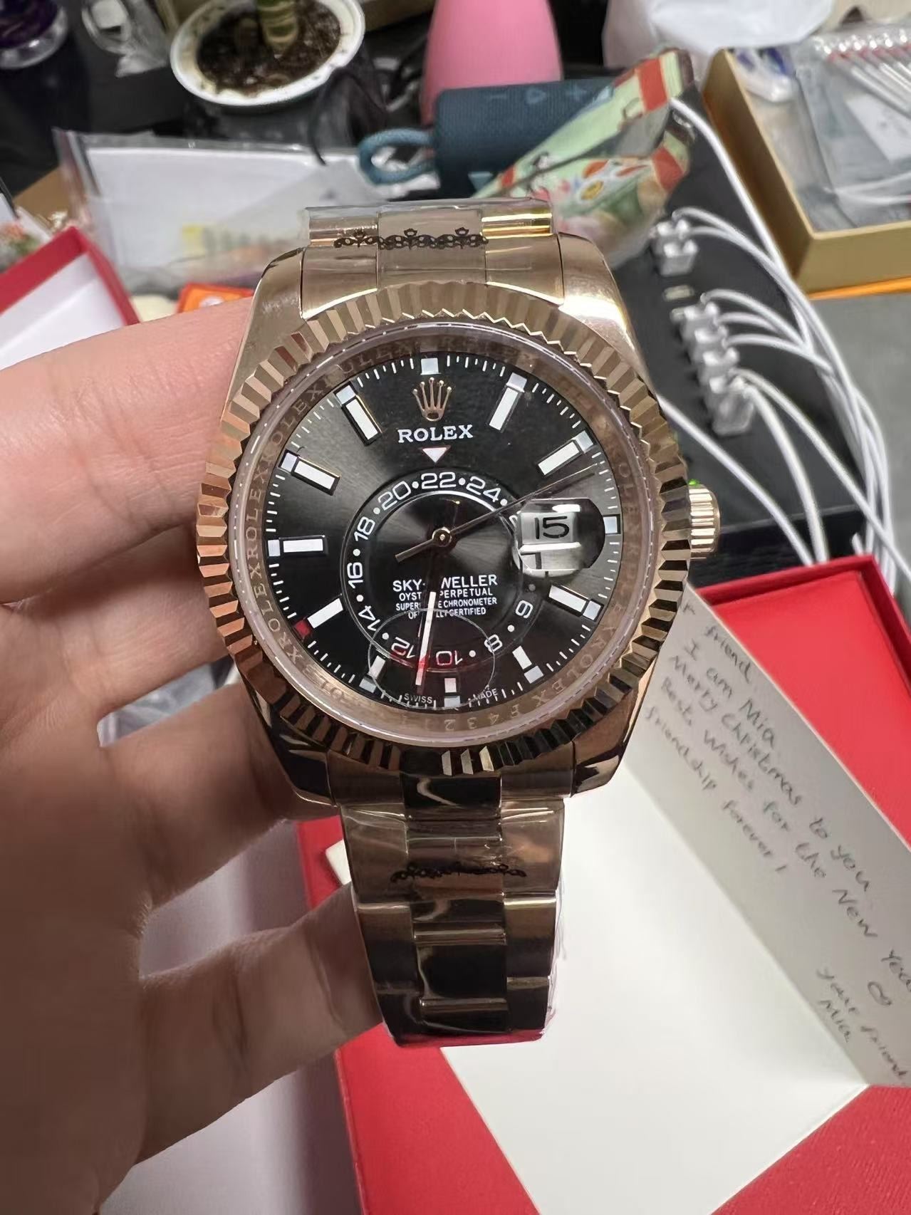 THE OYSTER PERPETUAL SKYDWELLER 42MM WITH A CHOCOLATE COLOR DIAL, FLUTED BEZEL AND A OYSTER BRACELET. BOX, TAG, PAPERS, BAG, ALL INCLUDED.THIS TIMEPIECE IS AN EXACT REPLICA OF THE ORIGINAL. **ALL ITEMS MUST BE REMOVED BY 5PM SATURDAY, MARCH 8TH 2025. ALL REMAINING ITEMS WILL BE SUBJECT TO A $6.00 PER DAY STORAGE CHARGE. ANY ITEMS REMAINING AFTER MONDAY, MARCH 24TH 2025 WILL BE CONSIDERED FORFEITED. NO REFUNDS WILL BE ISSUED FOR FORFEITED ITEMS. TO SCHEDULE A PICK UP APPOINTMENT CLICK HERE