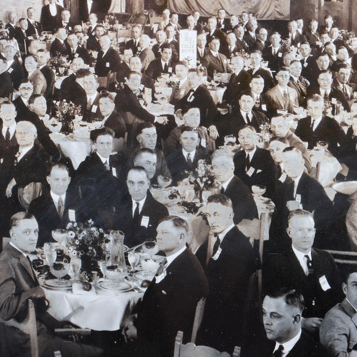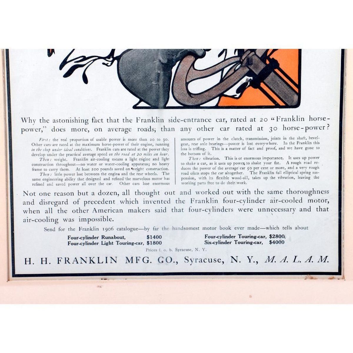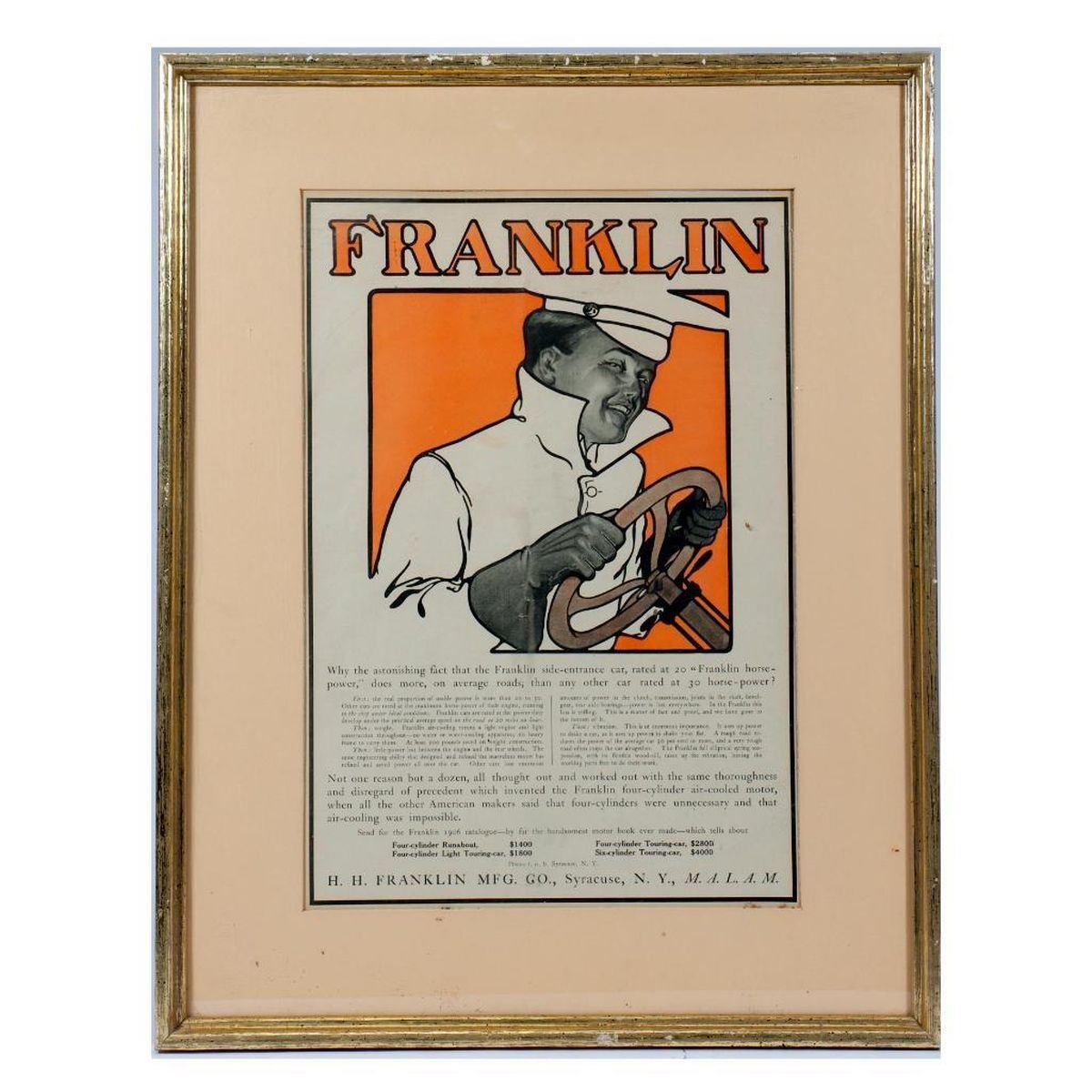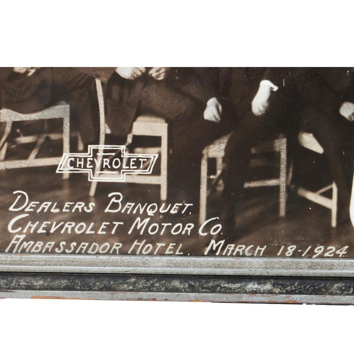 A General Motors/Chevrolet Dealers Banquet photograph, Ambassador Hotel, March 18, 1924, by Weaver. Showing mostly dour gents at elaborately set tables in the hotel ballroom, waiters standing at the side. 9 3/4in. x 19 1/4in. Good condition. Together with: An H. H. Franklin Mfg. Co. advertisement for the Franklin side-entrance car, noting to send for the Franklin 1906 catalogue. 13 3/4in. x 9 1/4in. (sight); 18 3/4in. x 14 3/4in. (frame). Condition: There is a slight fold/creases down the center; light soiling; flyspecking on the matte under glass.
