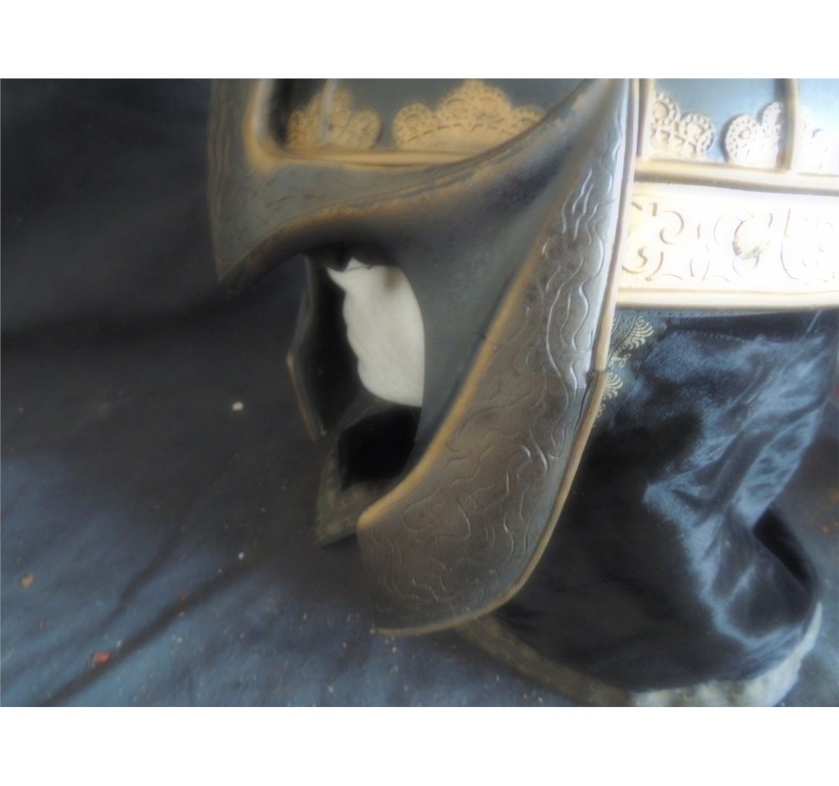 This helmet has unfortunately been damaged since original photos were taken. The 2 side guards have cracked. [See new pics for close ups.]