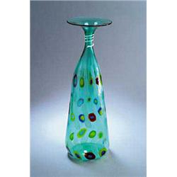 farbloses Glas mit grünem Innenüberfang, auf der Wandung drei übereinanderliegende Reihen von aufgeschmolzenen, vertikal angeordneten zanfirico-Stangen zwischen rot-blauen, blau-gelben und grün-gelben Murrinen, am Hals spiralförmig aufgelegter, milchweißer Faden. Hohe, konisch zulaufende, zum Stand gerundete Form mit kurzem, schlankem Hals und tellerförmig auskragender Mündung. H.: 40,3 cm. Unbezeichnet. Um 1958 Lit.: Heiremans, Marc, Murano-Glas im 20. Jahrhundert, Ausst.kat. Museum voor Sierkunst en Vormgeving, Gent 1997, Abb. S. 141, Nr. 181