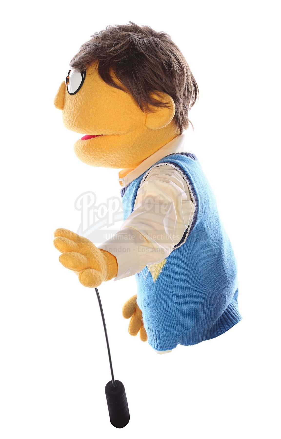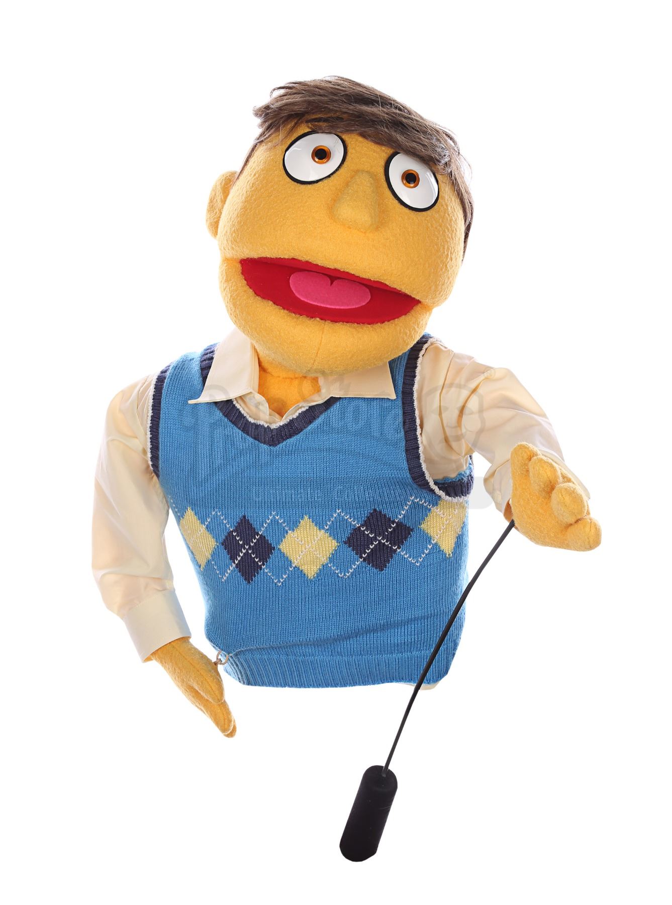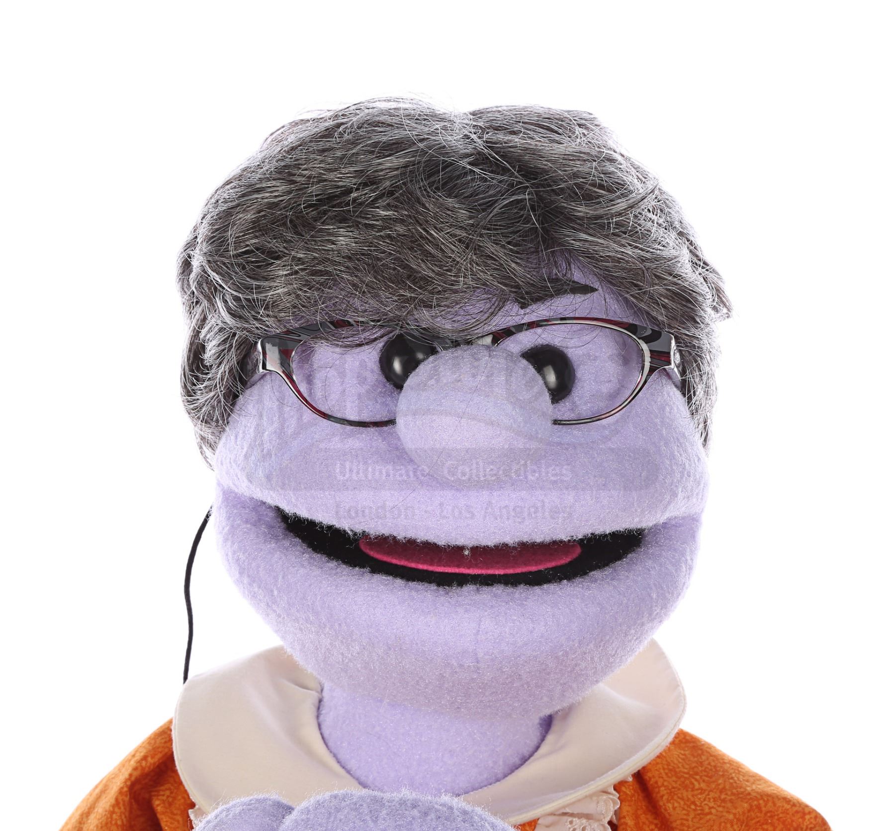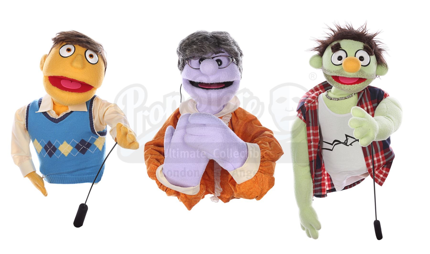 This collection features Kate Monster's uptight colleague Mrs. Thistletwat, Rod's new boyfriend Ricky, and the Newcomer. The puppets are constructed from upholstery foam, plastic and cardboard, covered in Antron fleece. Mrs Thistletwat is a live-hands puppet with glasses and a blouse. Ricky has a single rod and wears a red plaid shirt and white vest, while Newcomer has a single rod and a knitted vest over a button-down shirt. All remain in excellent condition, with their original storage bags. Dimensions (largest): 55 cm x 45 cm x 26 cm (22" x 18" x 10")