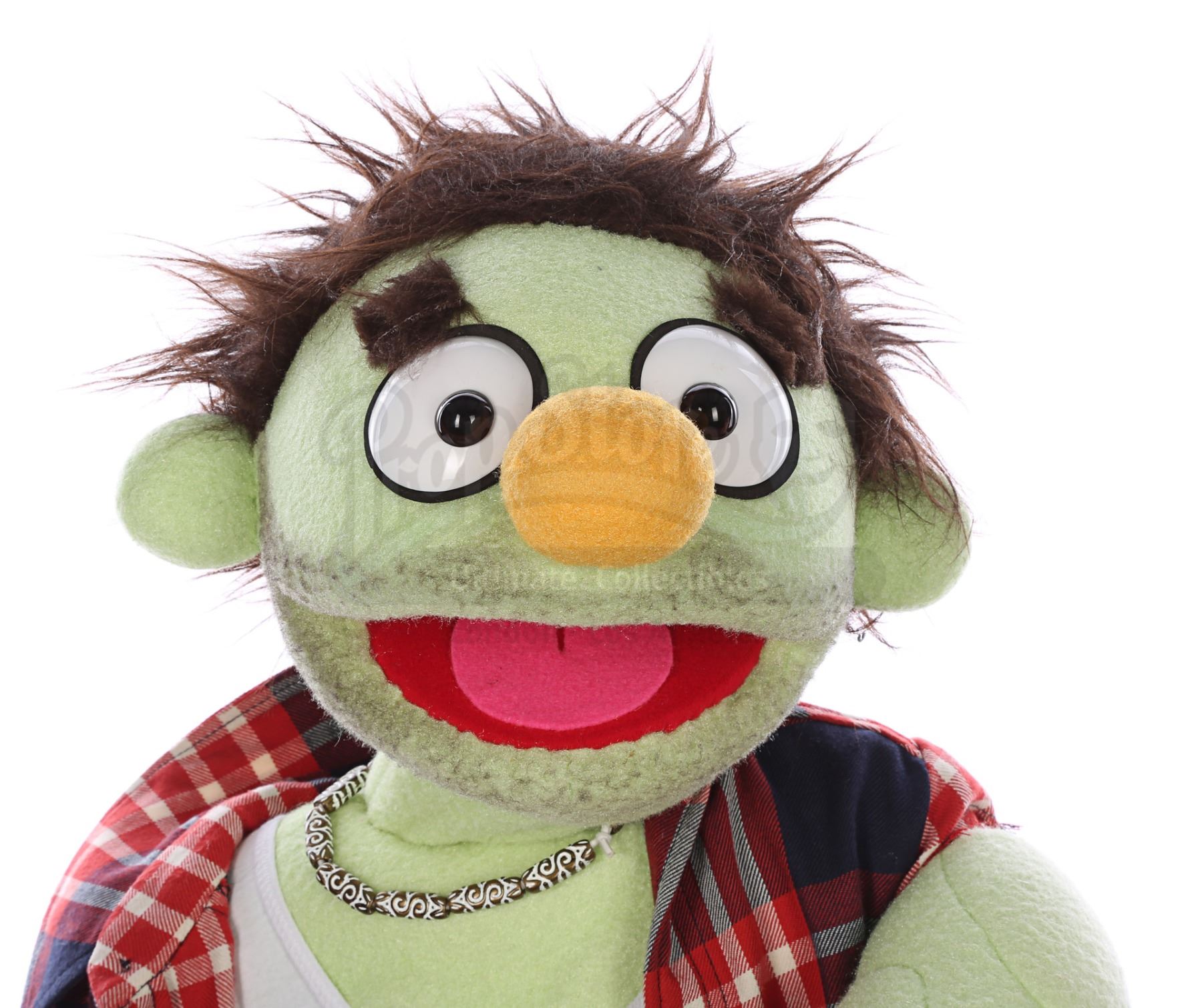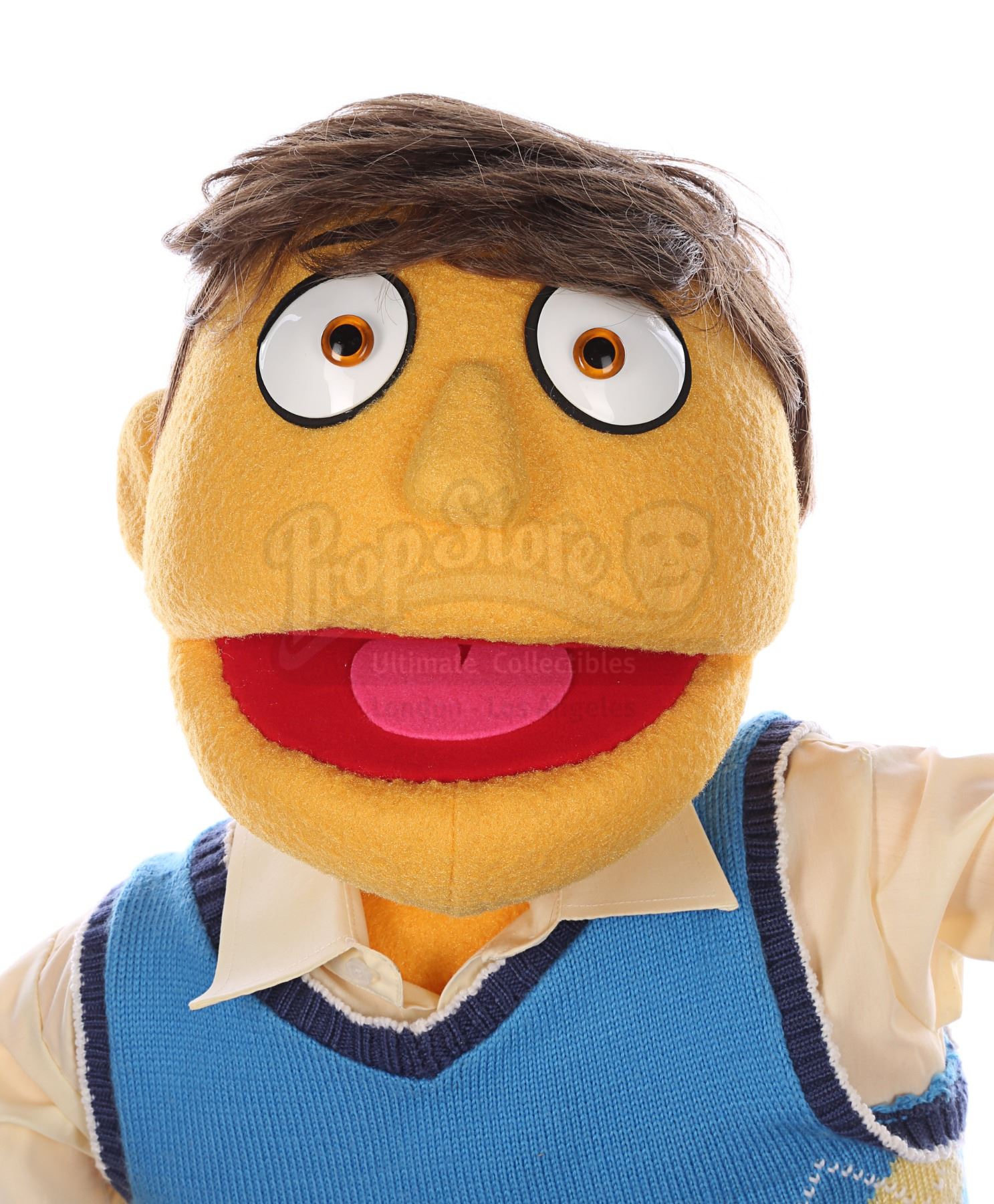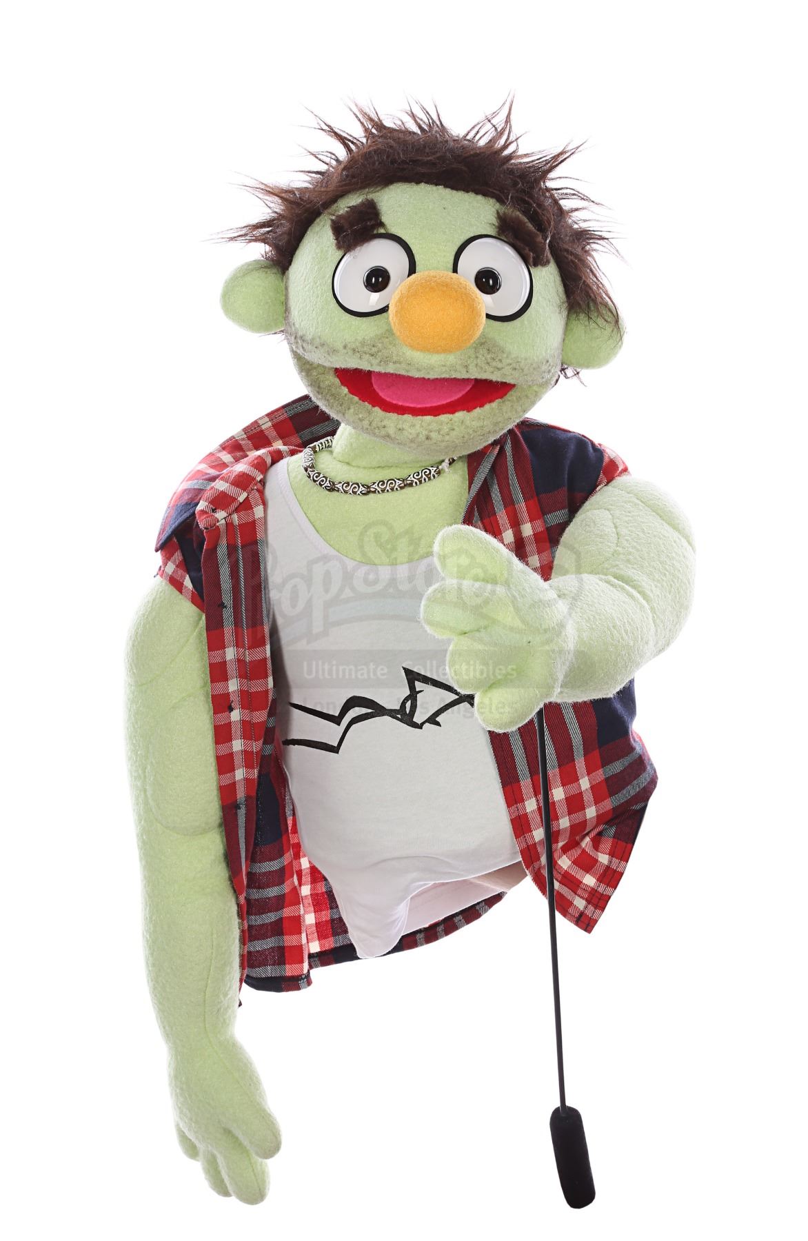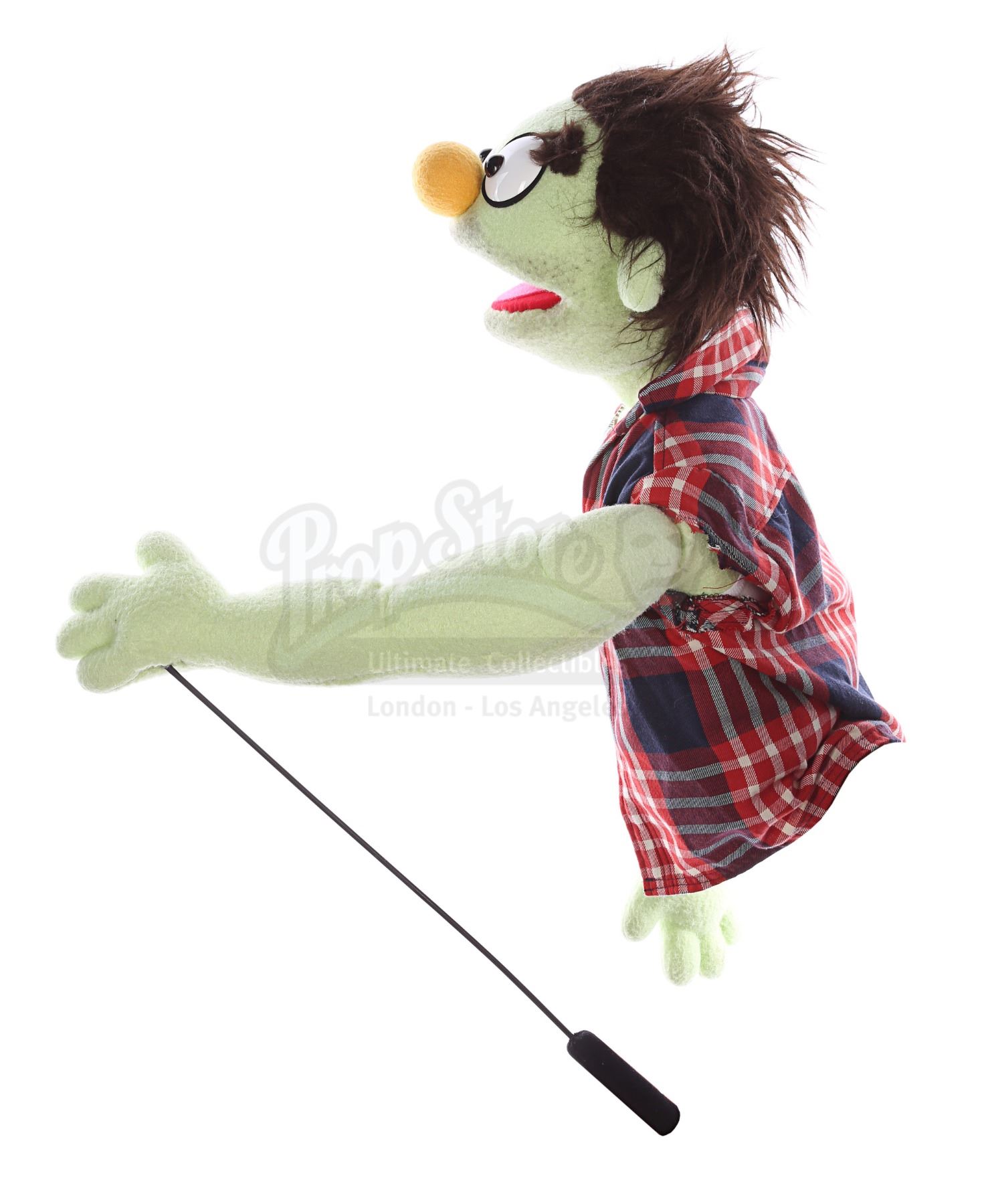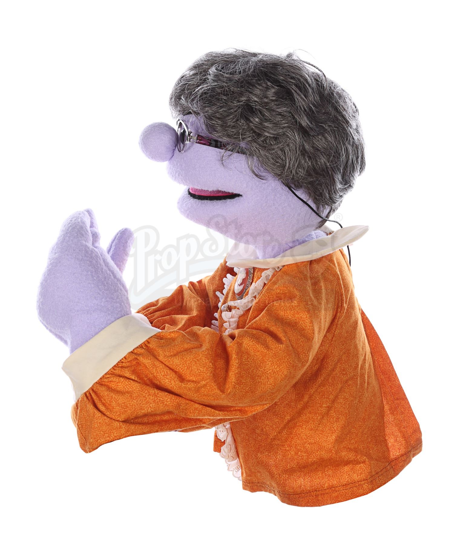This collection features Kate Monster's uptight colleague Mrs. Thistletwat, Rod's new boyfriend Ricky, and the Newcomer. The puppets are constructed from upholstery foam, plastic and cardboard, covered in Antron fleece. Mrs Thistletwat is a live-hands puppet with glasses and a blouse. Ricky has a single rod and wears a red plaid shirt and white vest, while Newcomer has a single rod and a knitted vest over a button-down shirt. All remain in excellent condition, with their original storage bags. Dimensions (largest): 55 cm x 45 cm x 26 cm (22" x 18" x 10")
