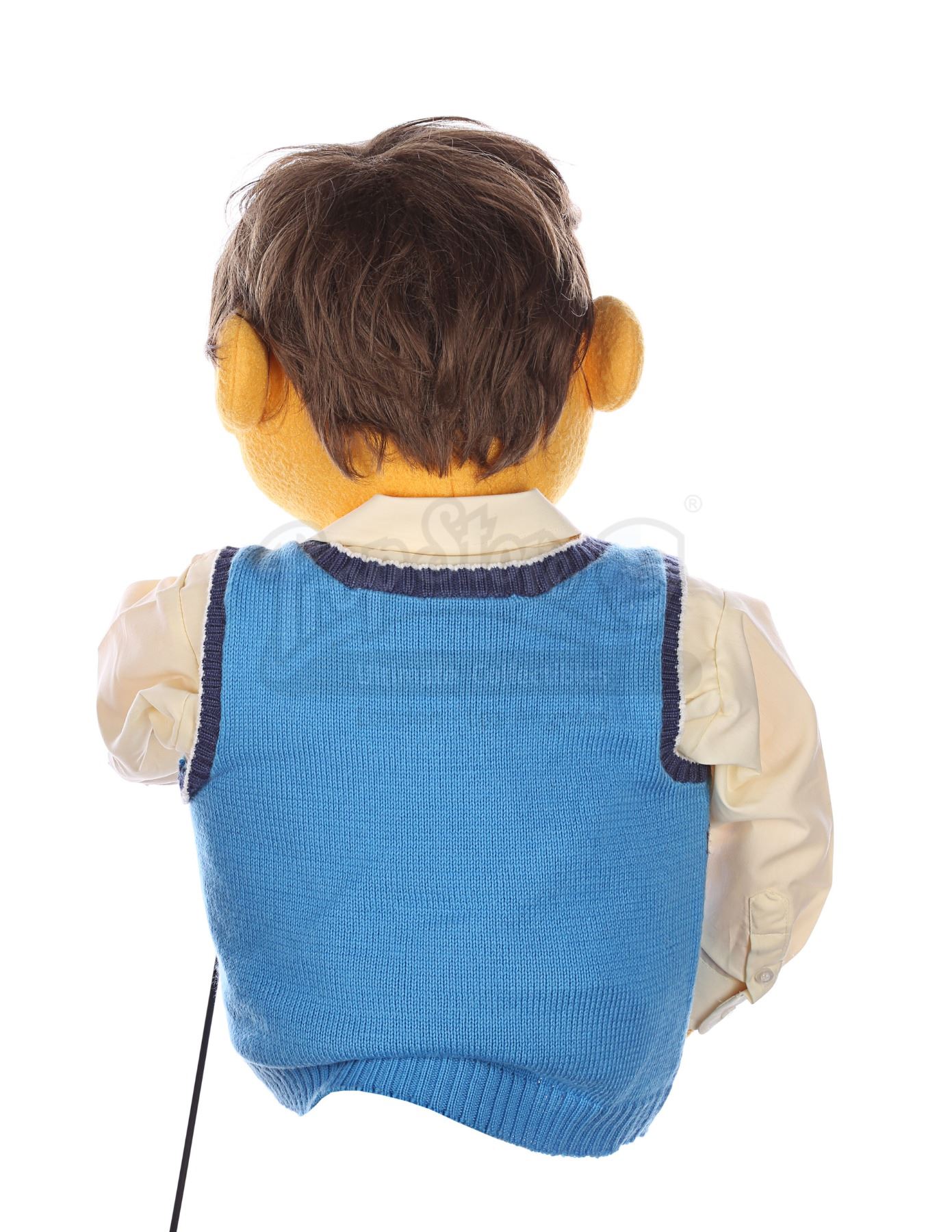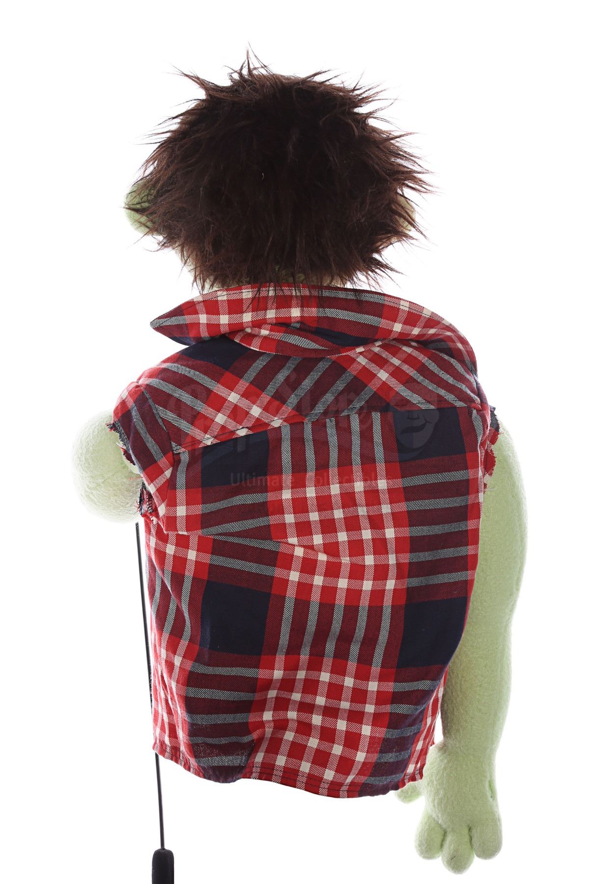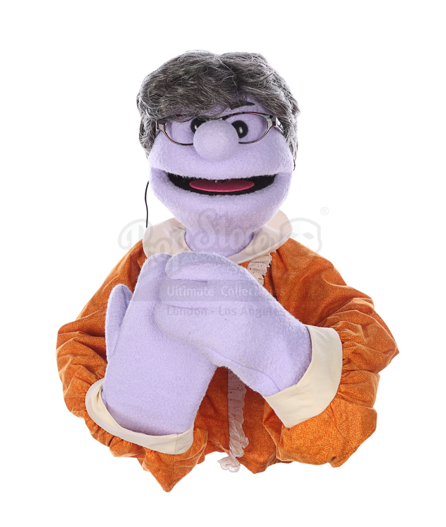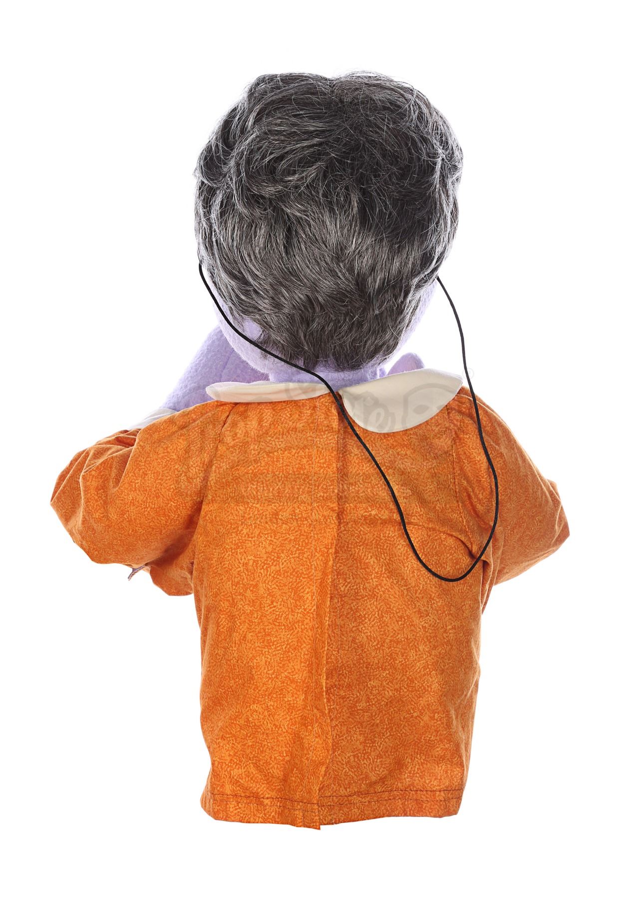 This collection features Kate Monster's uptight colleague Mrs. Thistletwat, Rod's new boyfriend Ricky, and the Newcomer. The puppets are constructed from upholstery foam, plastic and cardboard, covered in Antron fleece. Mrs Thistletwat is a live-hands puppet with glasses and a blouse. Ricky has a single rod and wears a red plaid shirt and white vest, while Newcomer has a single rod and a knitted vest over a button-down shirt. All remain in excellent condition, with their original storage bags. Dimensions (largest): 55 cm x 45 cm x 26 cm (22" x 18" x 10")