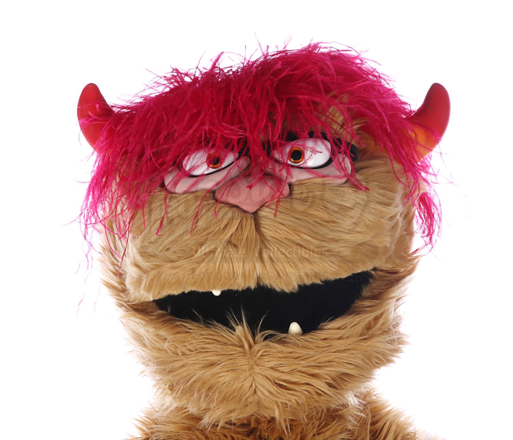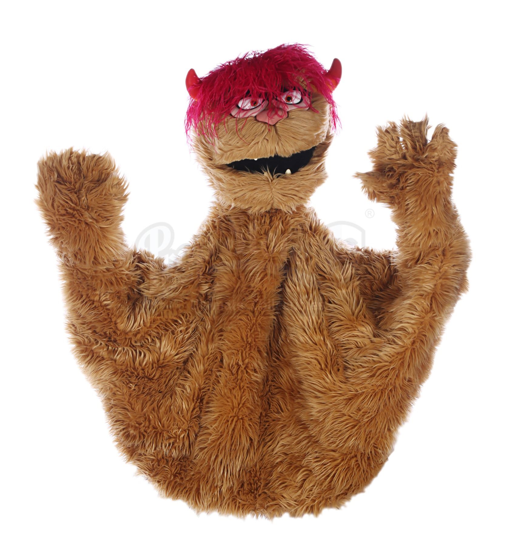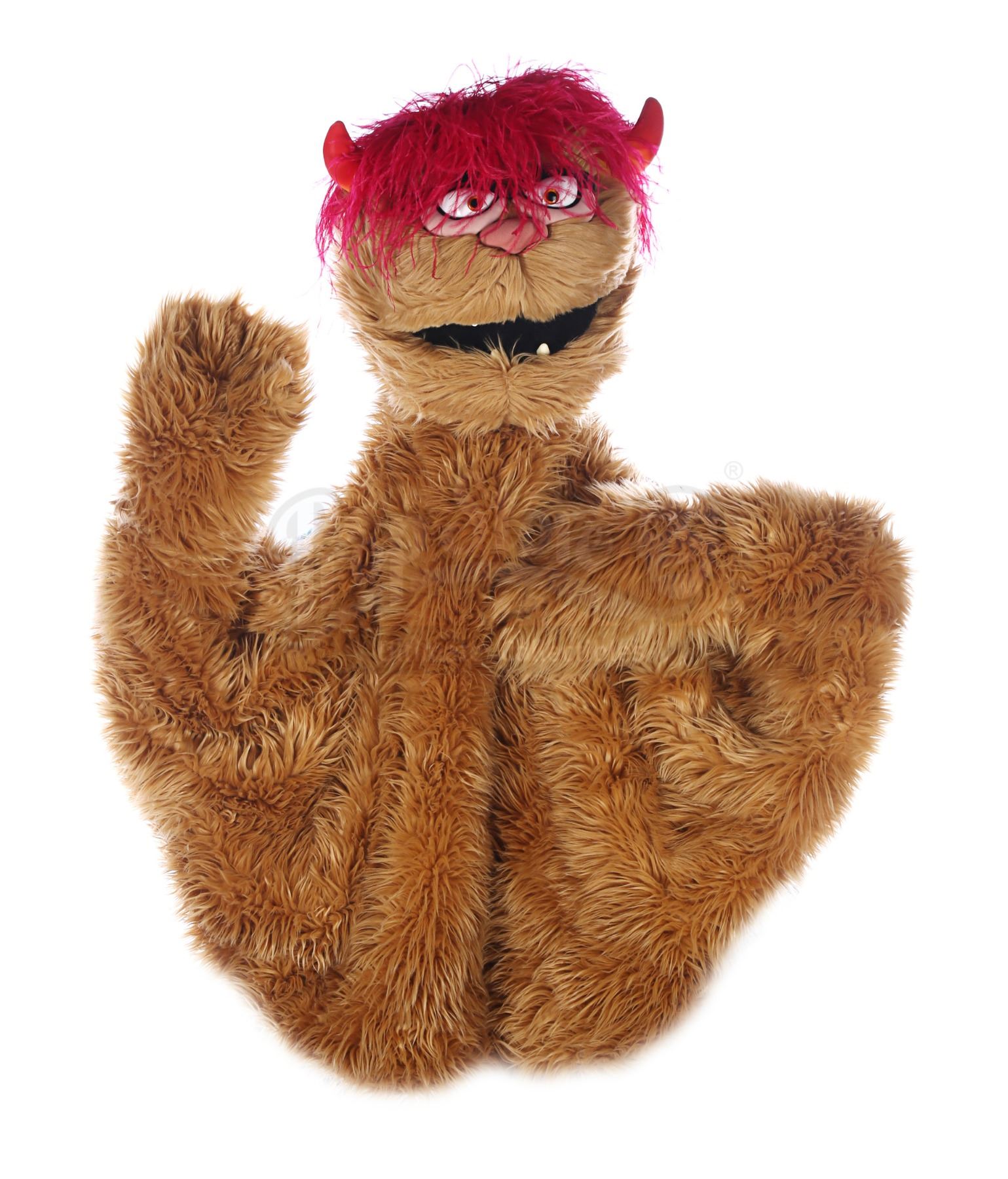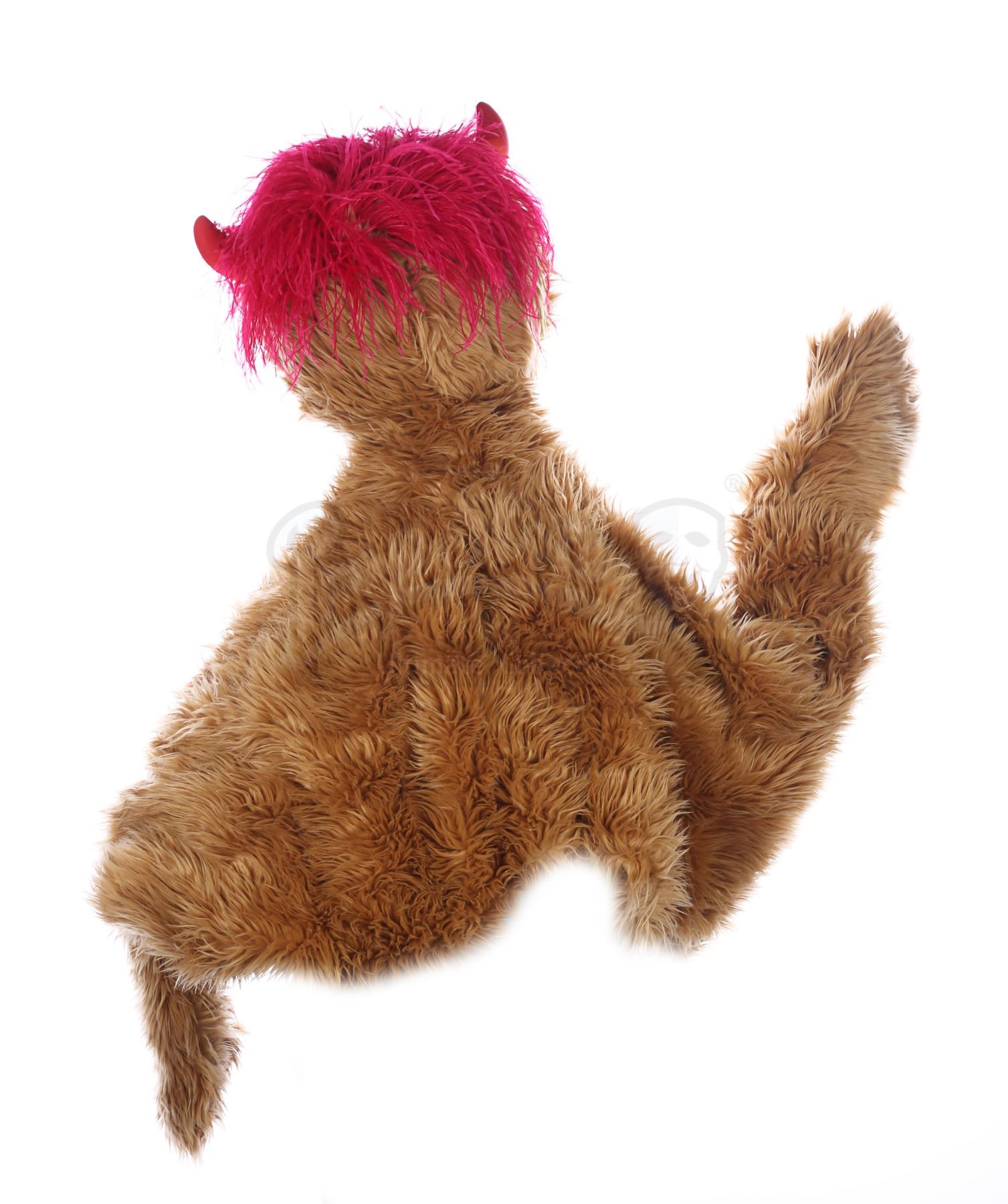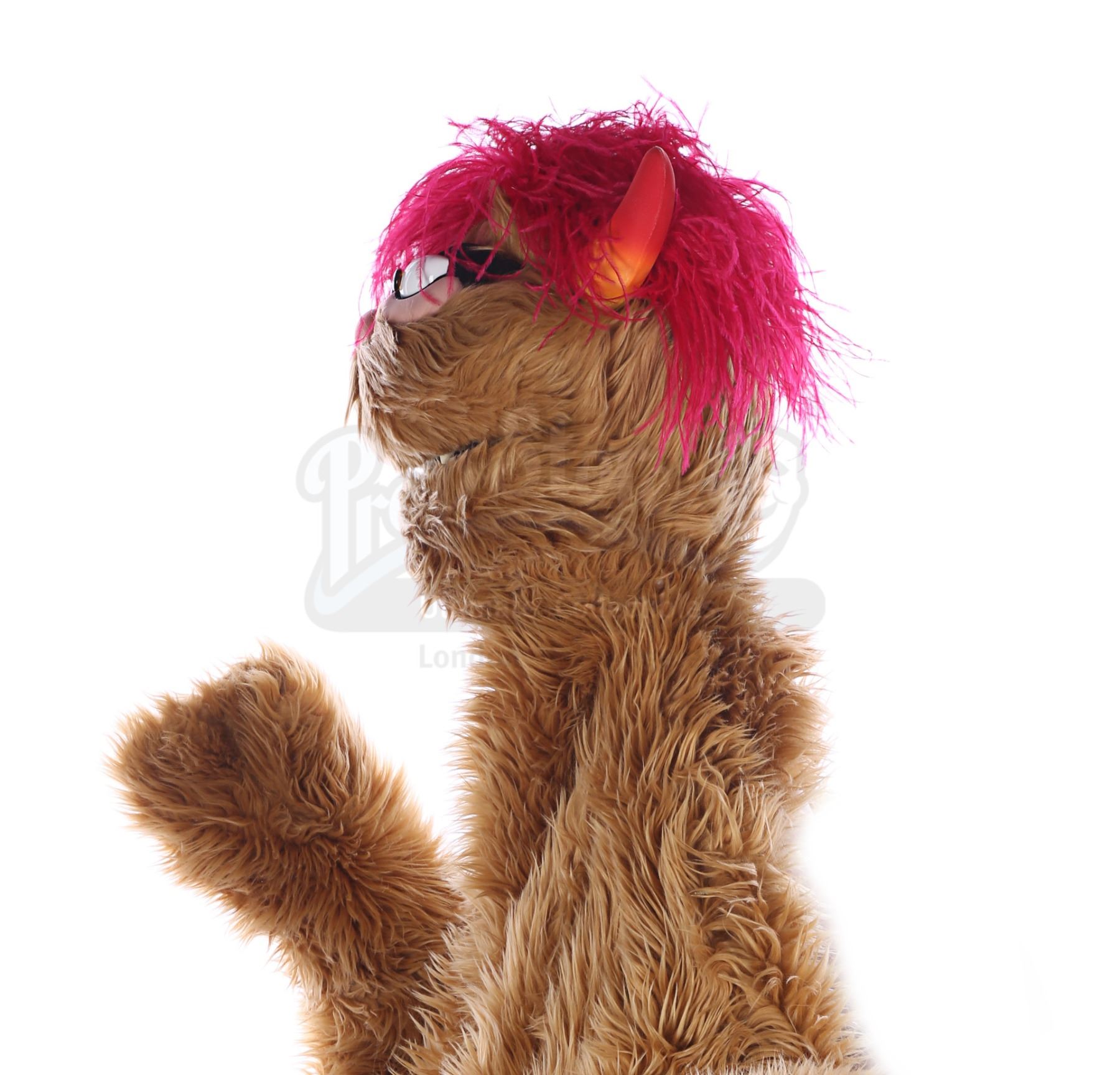 A Trekkie Monster puppet from the musical comedy Avenue Q. The show featured both human and puppet characters in a hilarious parody of Sesame Street. The puppets were either rod-controlled or performed with 'live-hands', a technique requiring a pair of puppeteers. These puppets were made and used in the Australian production in 2015 by Promotechnics, closely following the original character designs created by talented puppet master and creator of the original Broadway show, Rick Lyon. Originally created to be a Star Trek fanatic inspired by Sesame Street's Cookie Monster, Trekkie Monster is the street's most reclusive character, with an unhealthy obsession for online pornography. The largest of Avenue Q's puppet cast, Trekkie has long golden brown fur, gloves for live hand puppeteering, pink marabou feather hair and a pair of orange horns. The head is constructed from upholstery foam, plastic and cardboard. The puppet remains in excellent condition. Dimensions (Head): 37 cm x 33 cm x 32 cm (14 1/2" x 13" x 12 3/4")