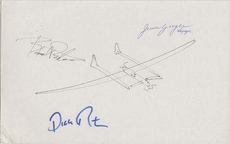A collection of five pieces including Zeppelin commander HUGO ECKNER signature on a 1 3/4" x 3" card (with two tiny pieces of ribbon affixed just to left of signature; explorer, FREDERICK A. COOK A.L.S. 1p. 8vo, Chicago, Mar. 21, 1930, writing in part: "...Let me express my appreciation for your kindly letter and your friendly interest in my work..."; astronaut, JIM IRWIN I.S.P. 5 1/2" x 3 1/2" postcard portrait of Irwin standing on the lunar surface saluting the American flag; S.P. 8" x 10" b/w photo of transatlantic balloonists, MAXIE ANDERSON, BEN ABRUZZO, and LARRY NEWMAN; a sketch of the Rutan Voyager the first plane to fly around the world without refueling or landing signed by its designer BURT RUTAN together with pilots, DICK RUTAN and JEANA YEAGER. Together, five pieces in very good condition.