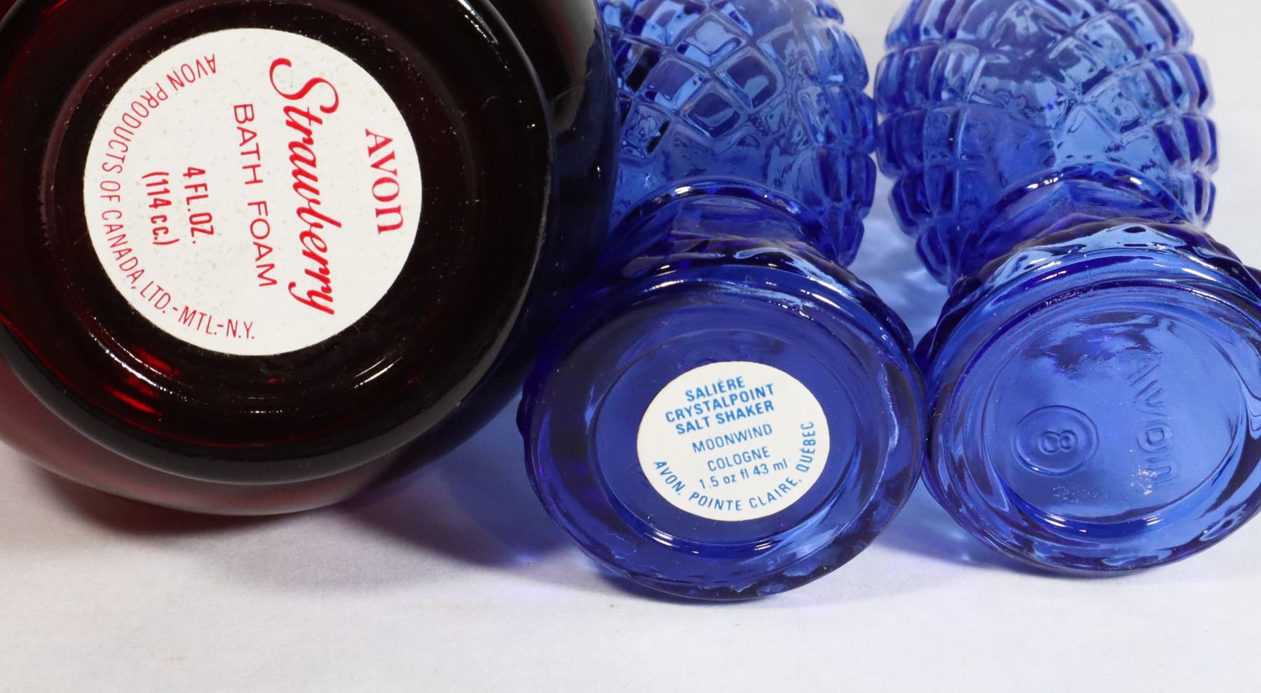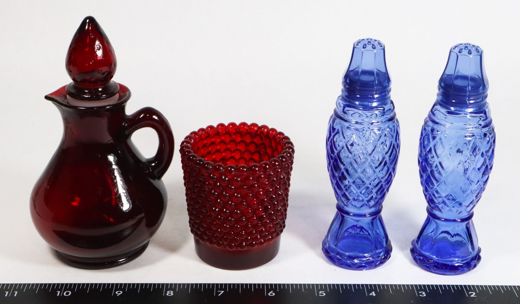 AVON BLUE GLASS SALT AND PEPPER, RED GLASS OIL