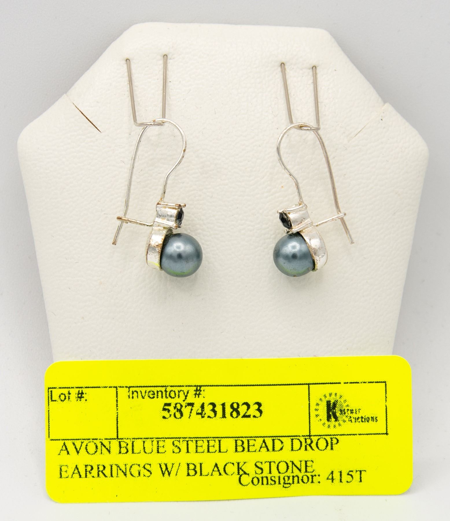 AVON BLUE STEEL BEAD DROP EARRINGS W/ BLACK STONE