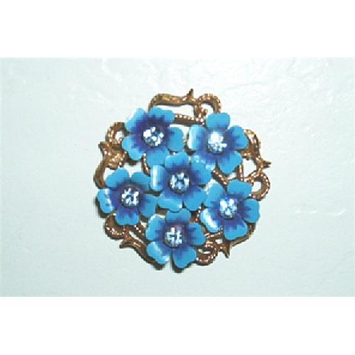 Featuring a lovely Avon vintage brooch/pendant. Features 6 enamel blue painted metal flowers with the center of each flower displayng a 4-pronged glass rhinestone.Signed AVON. Measures 1 1/2 inches in diameter. Excellent Condition.