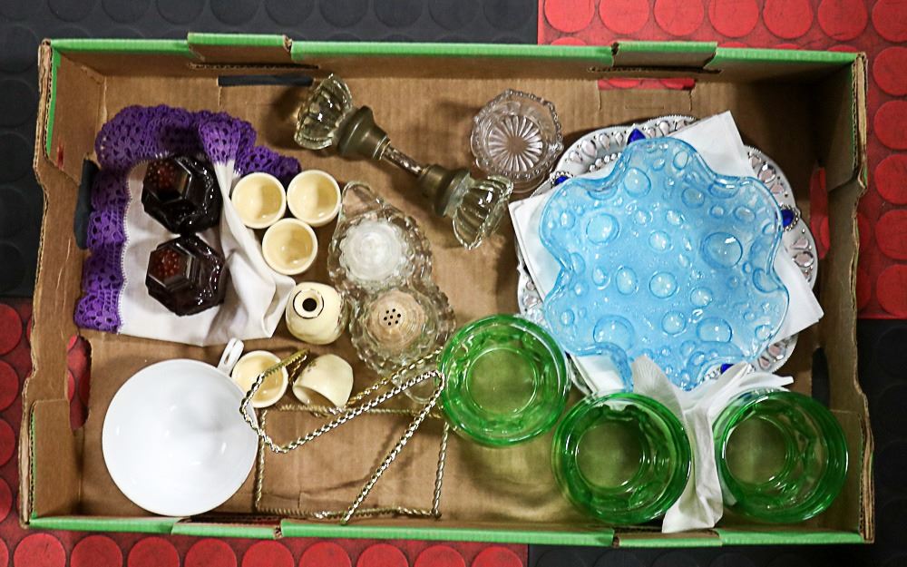 3 GREEN DEPRESSION GLASSES OUT OF ROLLED OATS, SALT + PEPPER SHAKERS ON TRAY, BLUE BUBBLE DISH ANTIQUE TOOTH PICK HOLDER, PRINCESS KATE + WILL WEDDING PLATE, 5 CUPS CHINESE BOTTLE + GLASS DOOR KNOB