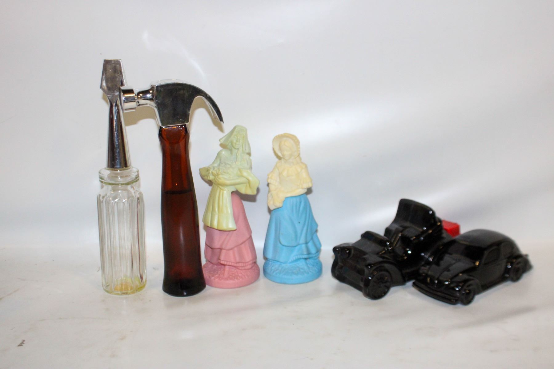 VINTAGE AVON PINK GRIL & BLUE GIRL PERFUME BOTTLES + VINTAGE AVON SCREWDRIVER & HAMMER COLOGNE BOTTLES