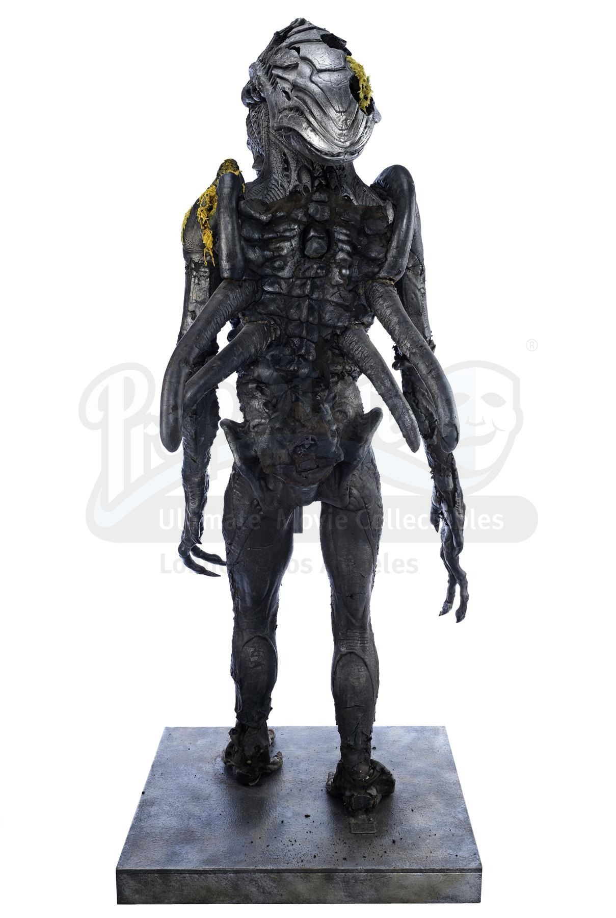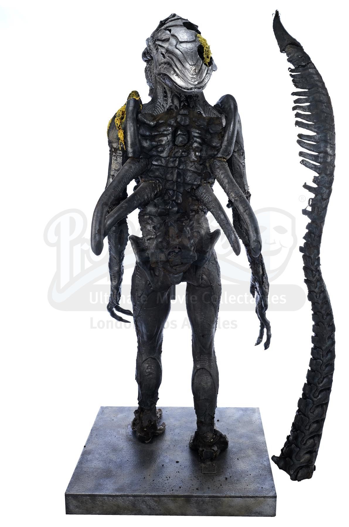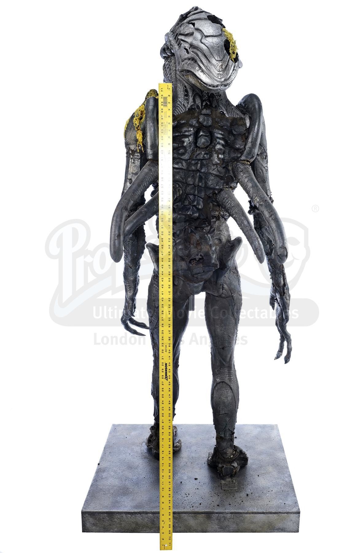 This full-size alien creature display, with all original components designed by Academy Award-winning special effects group Amalgamated Dynamics, Inc. (ADI), consists of a foam-latex domed headpiece hand-painted black and grey, and a matching foam-latex bodysuit. The bodysuit features armatured arms, a nylon lining secured with a zip closure, resin fingernails, snap-button joints on the arm and leg pieces, four dorsal tubes molded around exposed copper wire, and a long screw-on airbrushed latex tail moulded around a flexible metal-pipe core.