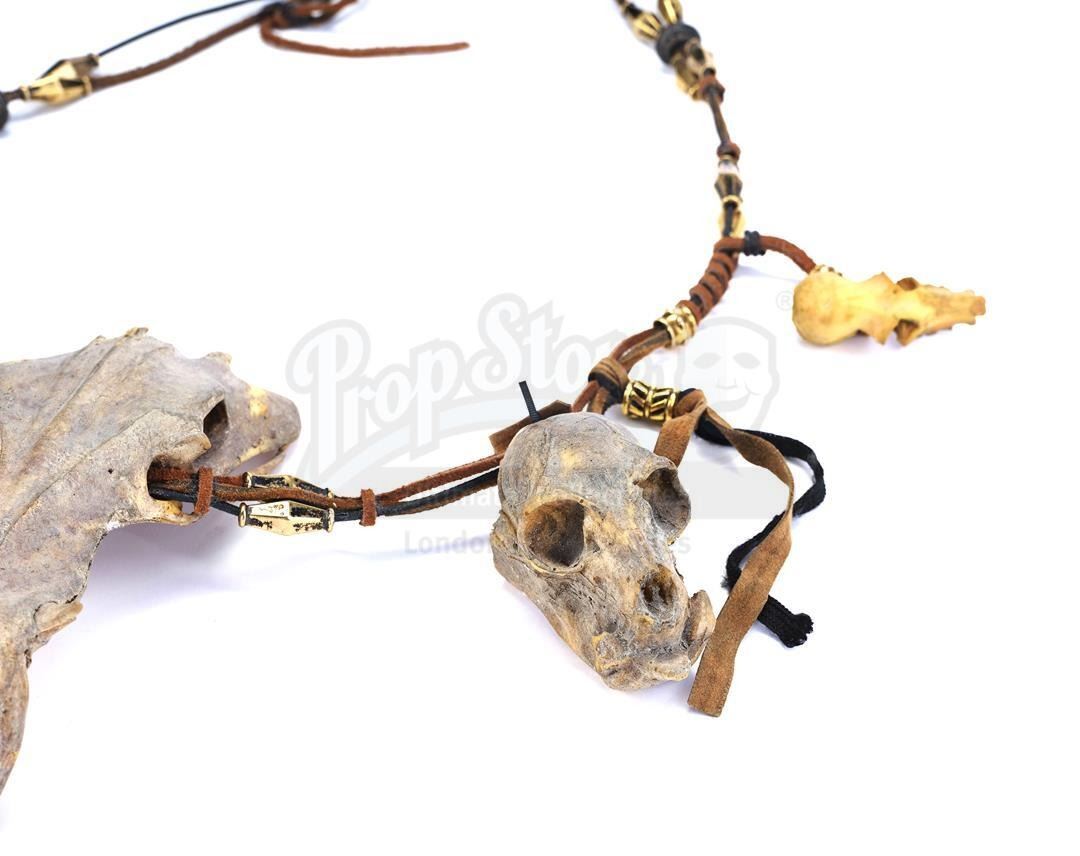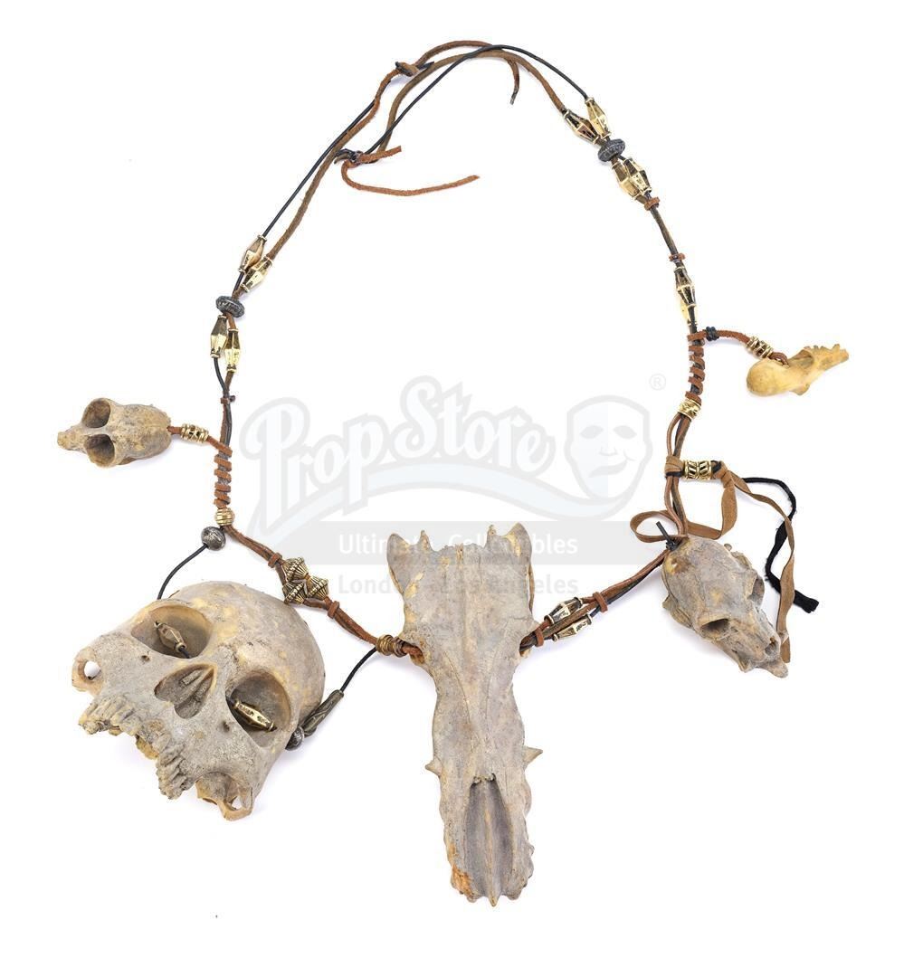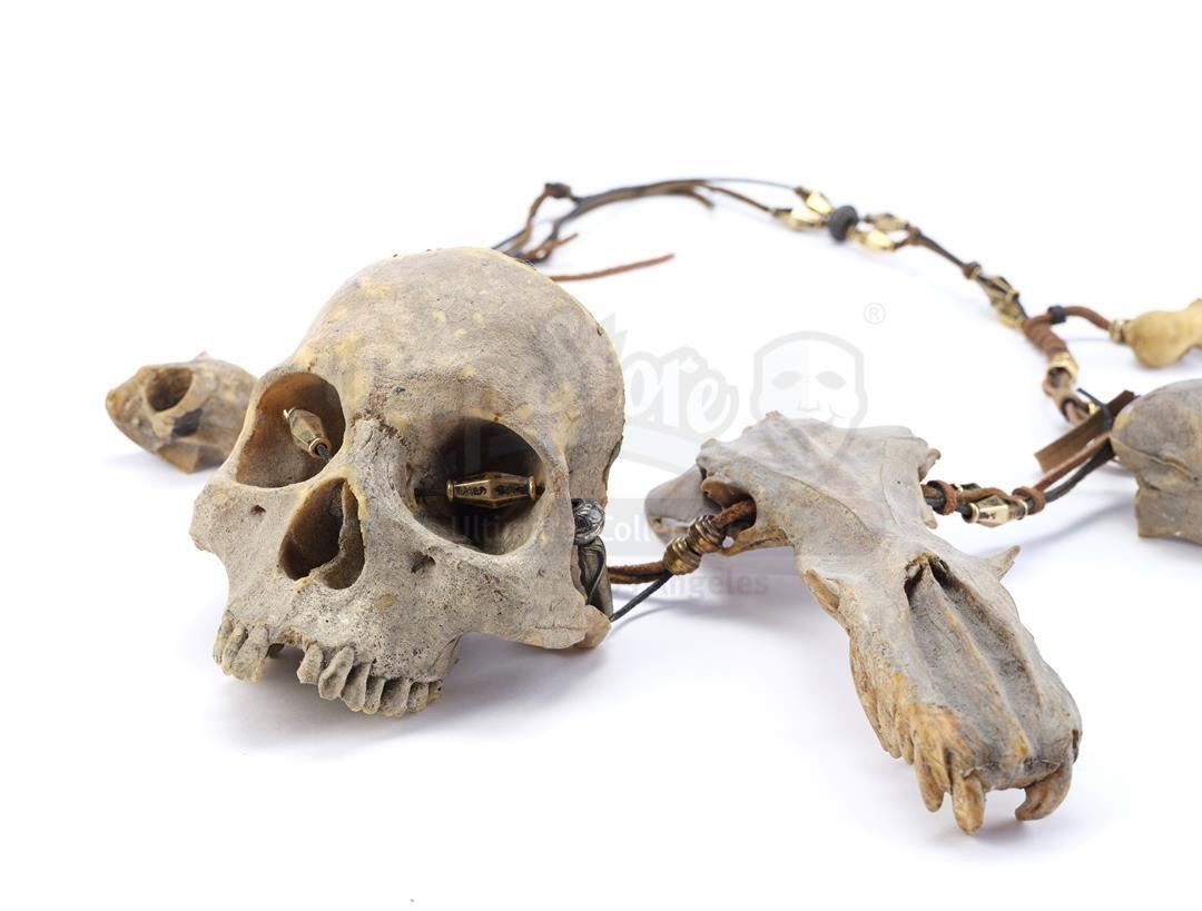 This lot features a foam latex Ancient mask with carved resin teeth and spikes and an interior metal and fibreglass head clasp marked "David", as well as a brown and black leather necklace affixed with bronze-colour metal jewels and production-weathered rubber animal skulls. The mask and necklace were designed, fabricated, and painted by Academy Award-winning special effects group Amalgamated Dynamics, Inc. (ADI). This lot is in fair overall condition with visible flaking and cracking to the foam latex, frayed leather, and two loose dreadlocks. Dimensions (mask): 51 cm x 56 cm x 40.75 cm (20" x 22" x 16"); (necklace): 112 cm x 23 cm x 11.5 cm (44" x 9" x 4 1/2")