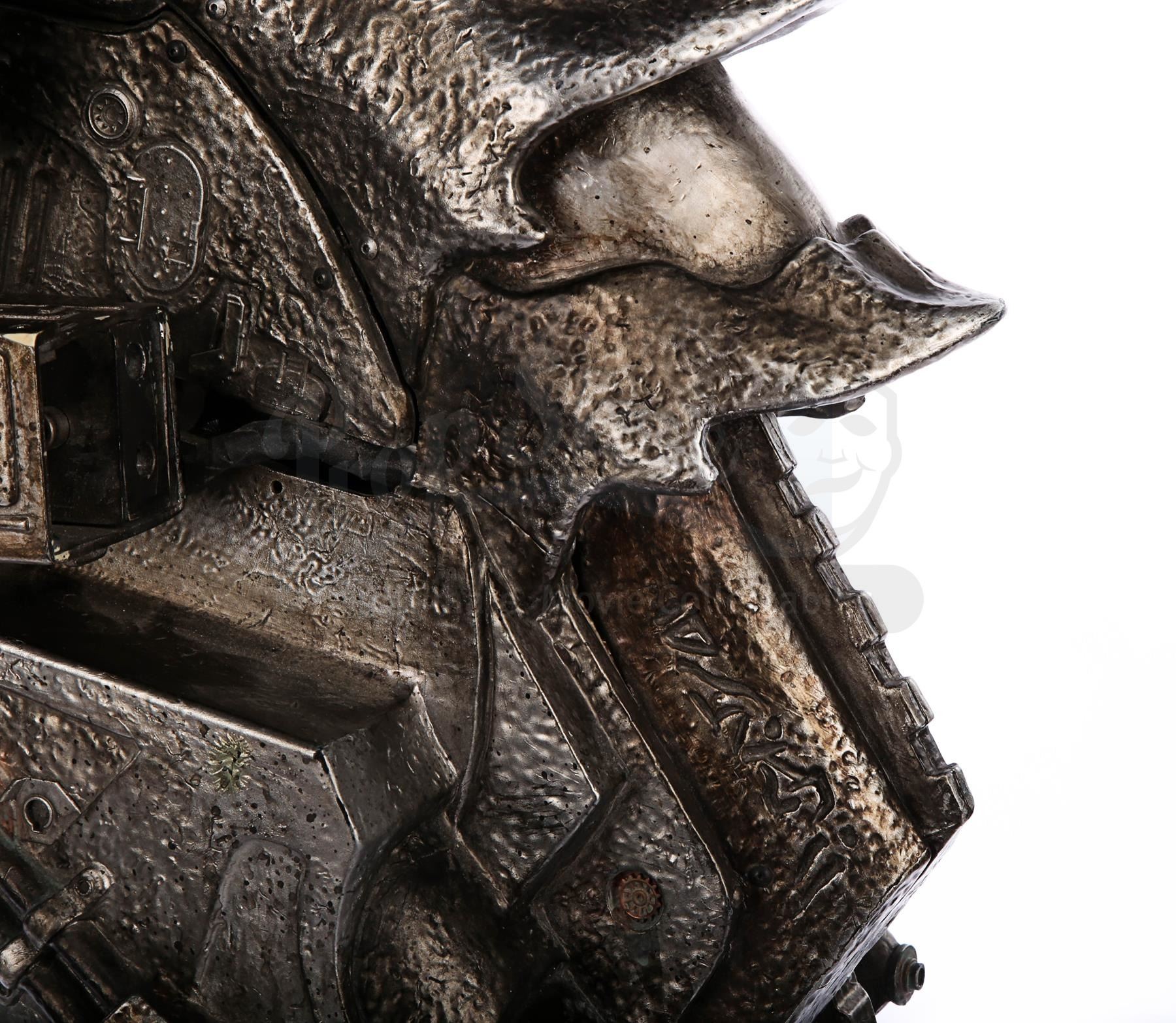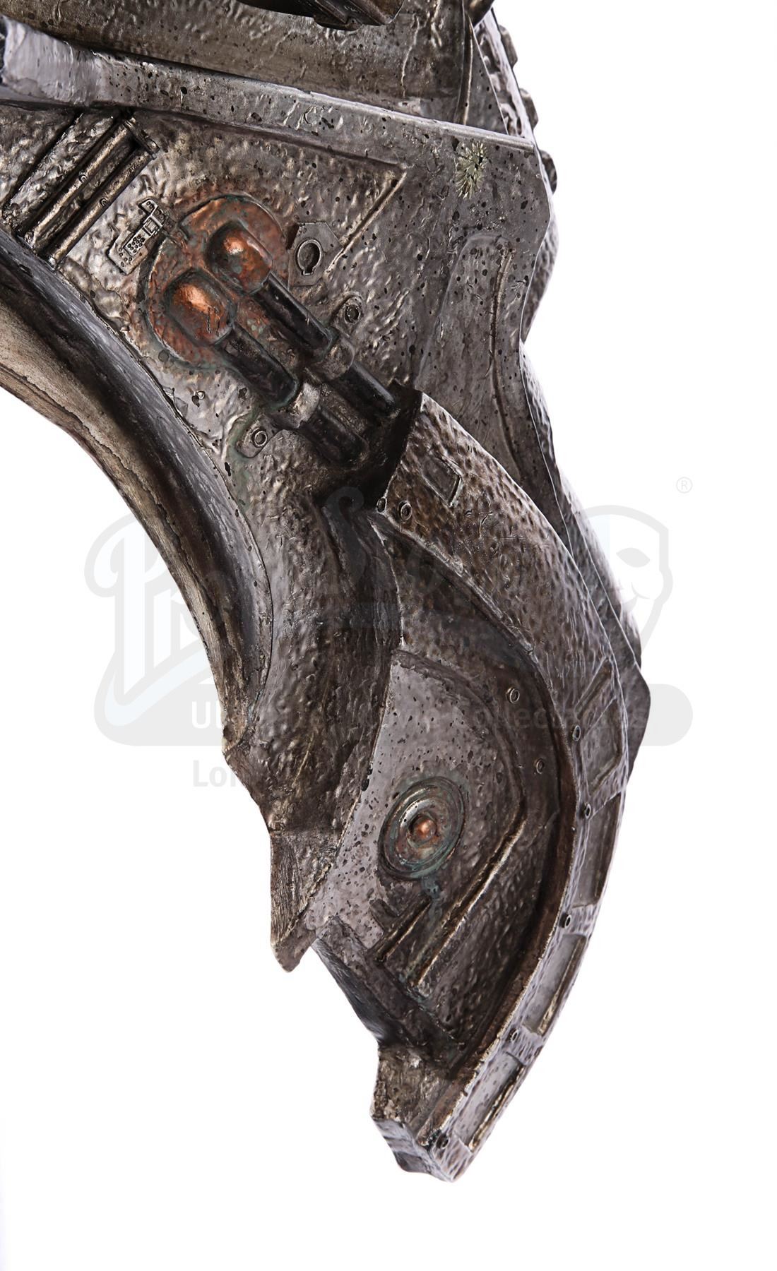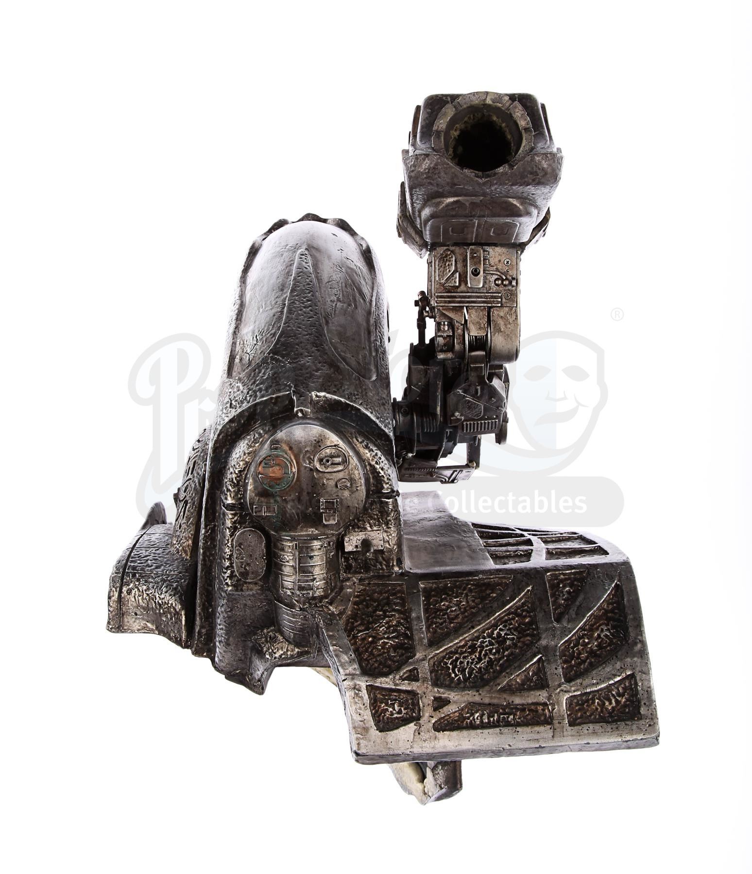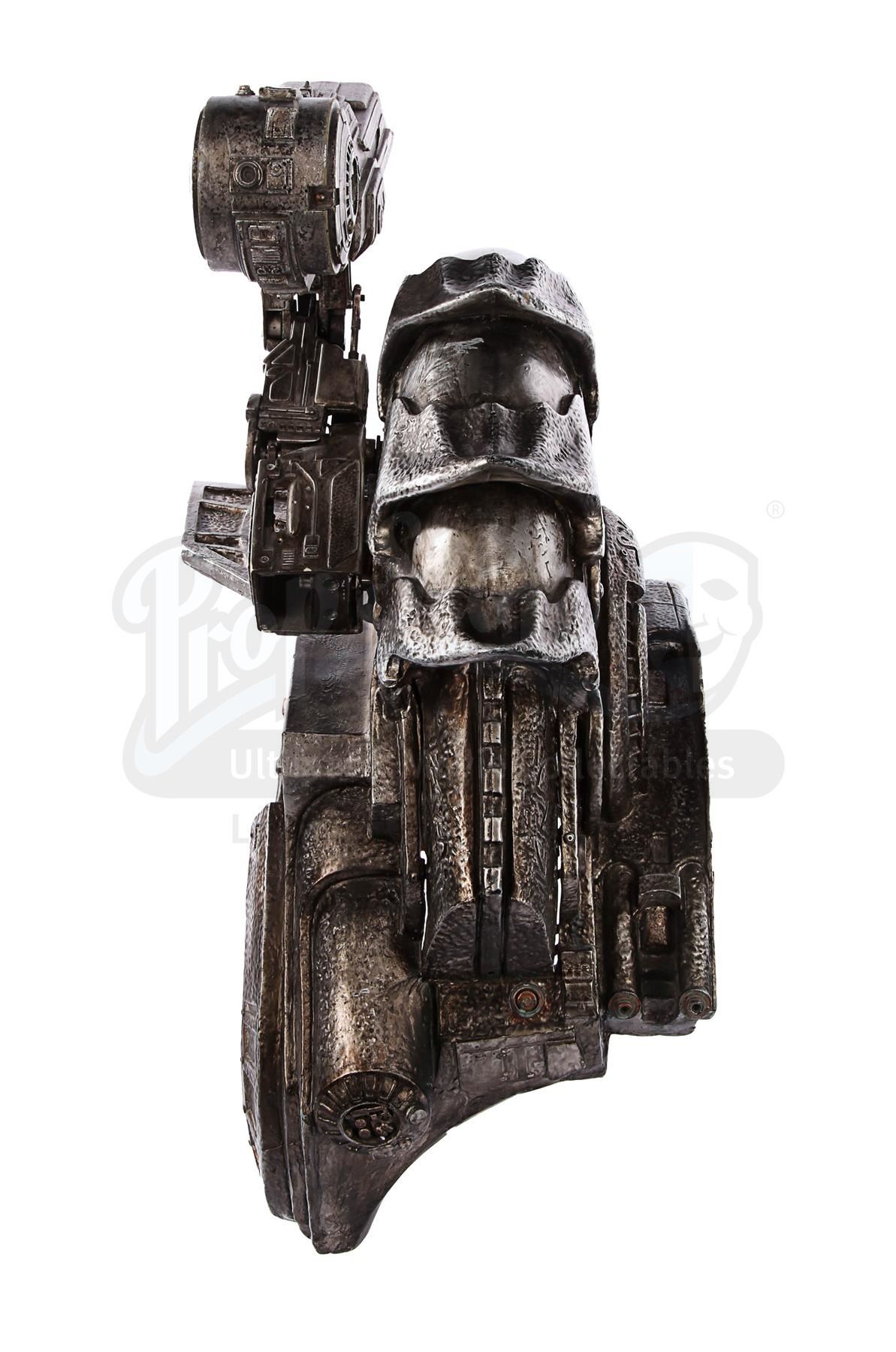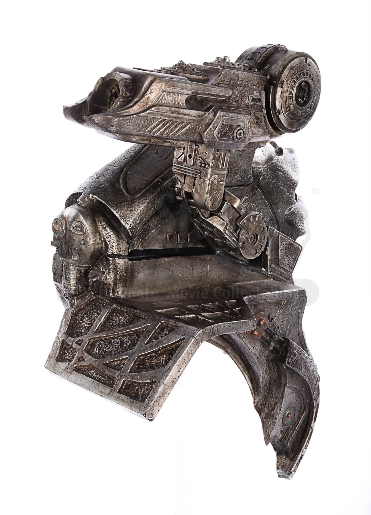 This item is largely made of fibreglass and resin, painted faux silver and grey to give the impression of tarnished metal. The cannon features Yautja lettering throughout, faux vents and buttons on the front shoulder panel, a crosshatch design on the front chest support, faux cables on the back-left side and faux wires and circuit designs on the lever arm of the cannon. It shows some signs of age and production use. Dimensions: 64 cm x 35 cm x 47 cm (25 1/4" x 13 3/4" x 18 1/2")