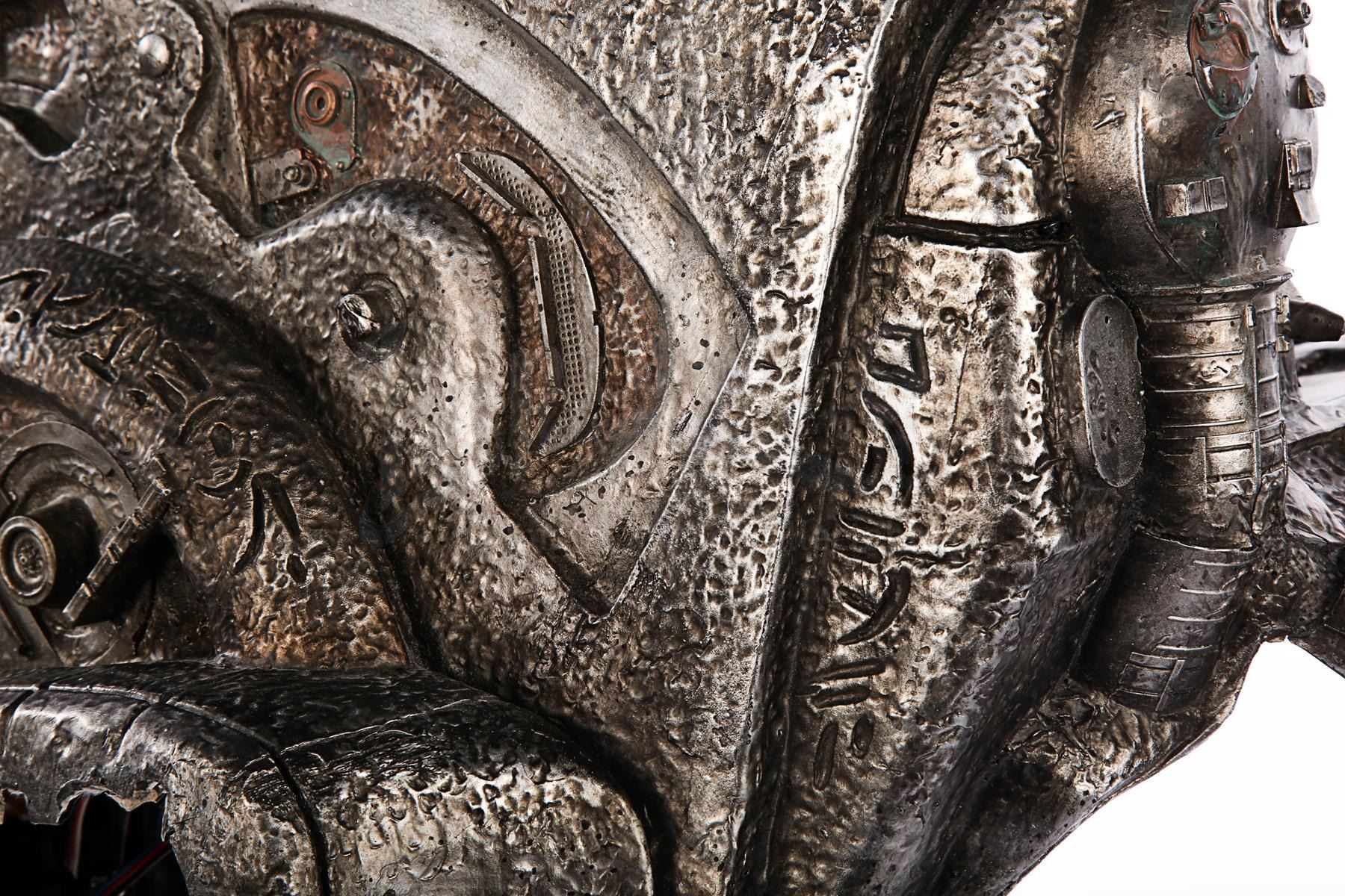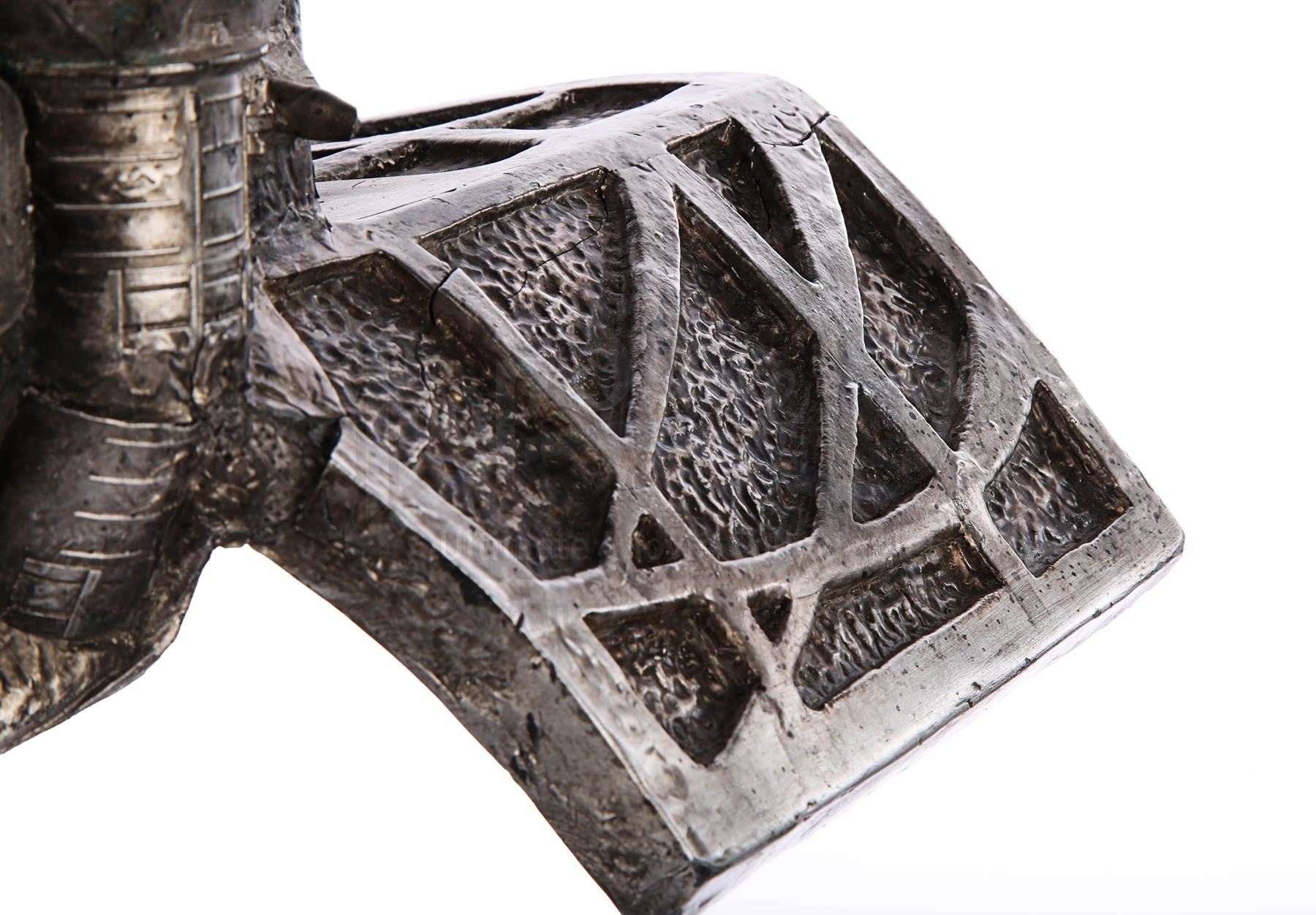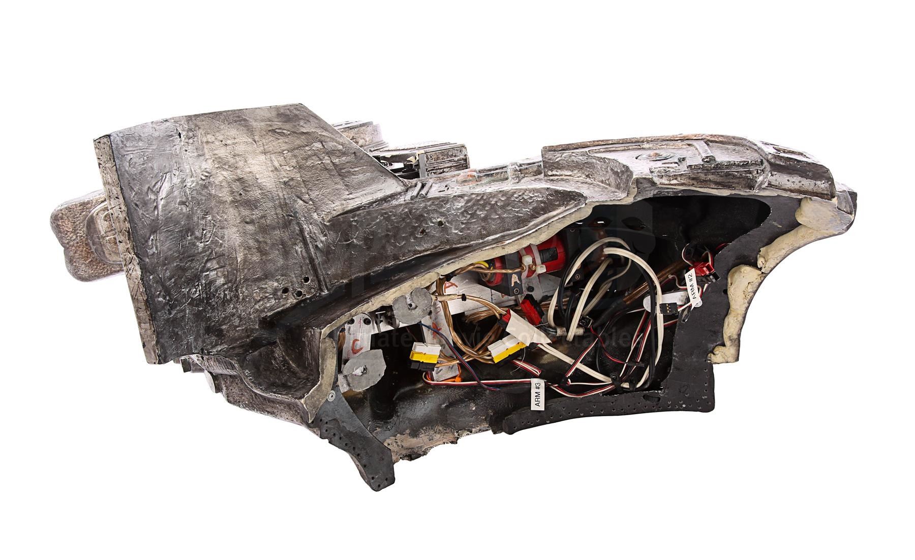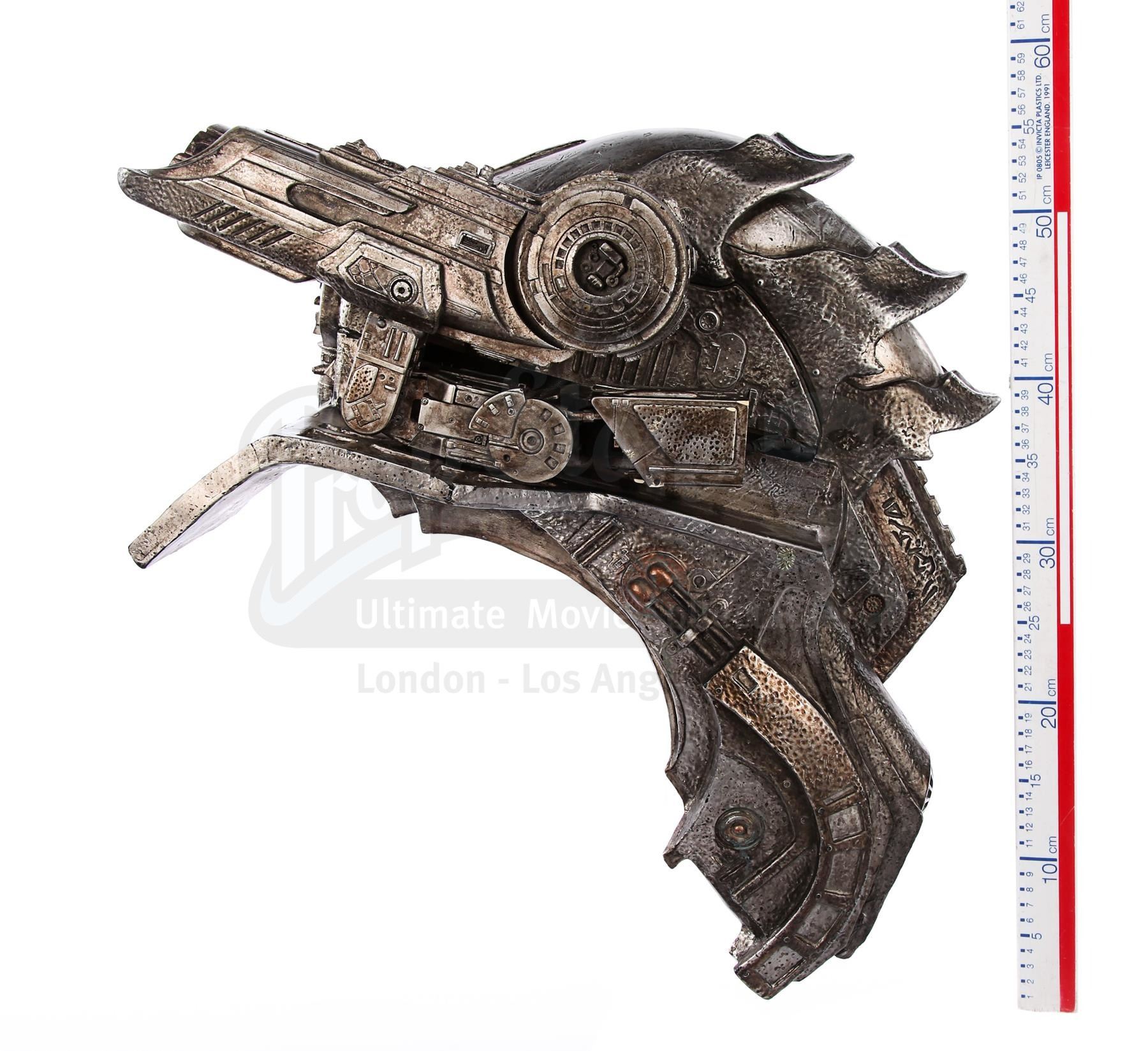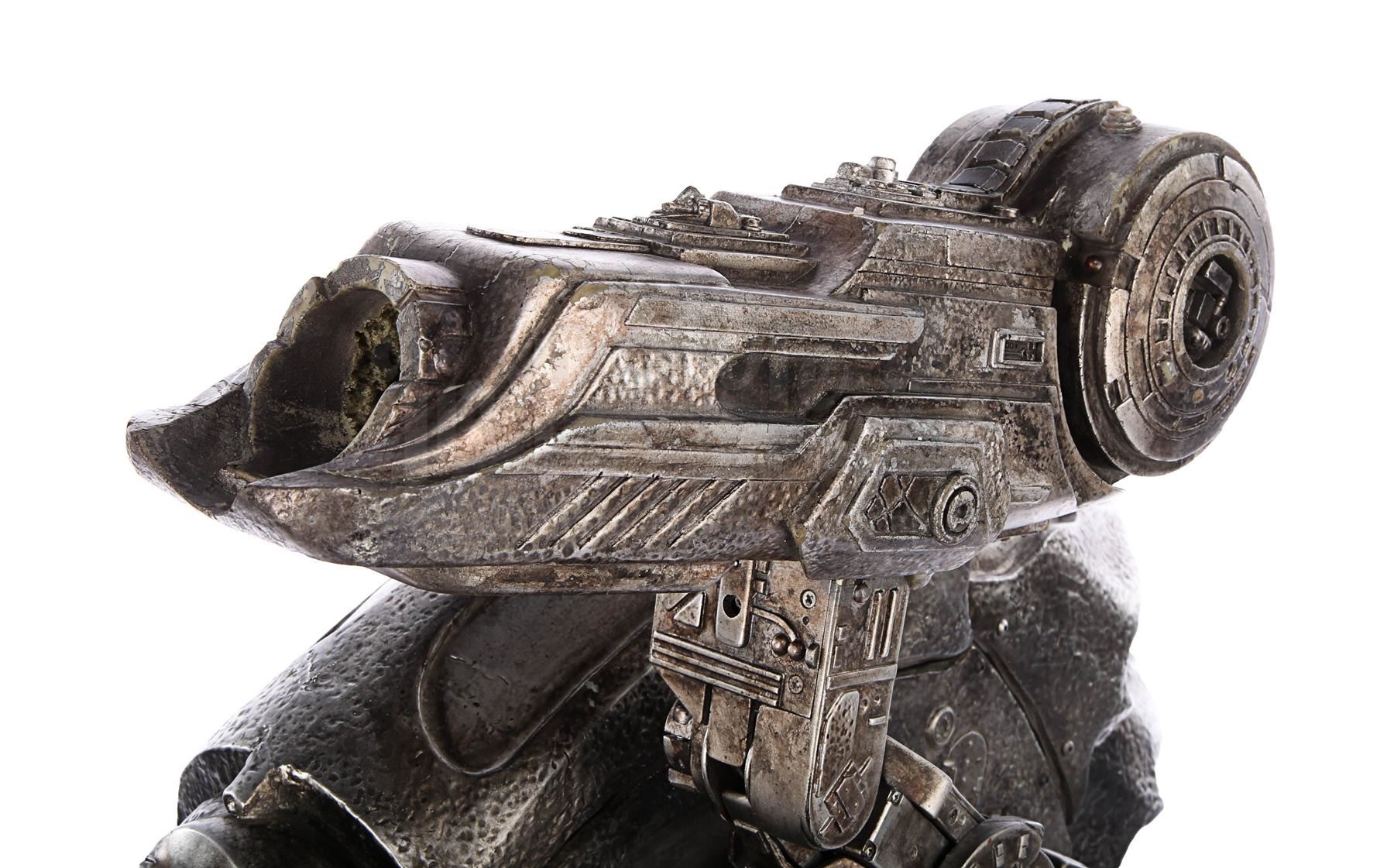 This item is largely made of fibreglass and resin, painted faux silver and grey to give the impression of tarnished metal. The cannon features Yautja lettering throughout, faux vents and buttons on the front shoulder panel, a crosshatch design on the front chest support, faux cables on the back-left side and faux wires and circuit designs on the lever arm of the cannon. It shows some signs of age and production use. Dimensions: 64 cm x 35 cm x 47 cm (25 1/4" x 13 3/4" x 18 1/2")