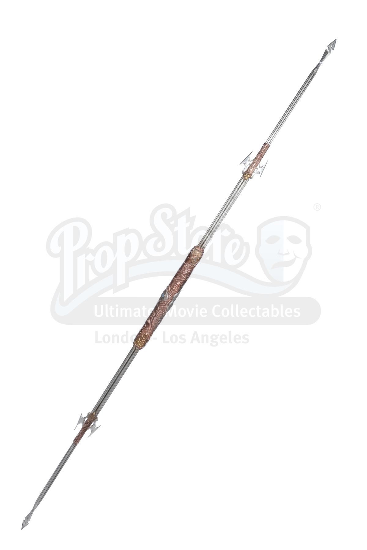 This full-size double-pronged spear-like weapon, designed by Academy Award-winning special effects group Amalgamated Dynamics, Inc. (ADI), is made of dense resin moulded around a steel pipe, hand-painted silver, copper, gold, and grey. A handle is set into the resin with a cerulean extending button at its centre. The handle and two ornate wings are engraved with otherworldly markings that hark back to the combistick designs first seen in Stephen Hopkins' Predator 2. The combistick has faux grime applied by the production to look distressed, and exhibits minor signs of wear including paint chipping. Dimensions: 213.5 cm x 6.5 cm x 10.25 cm (84" x 21/2" x 4")