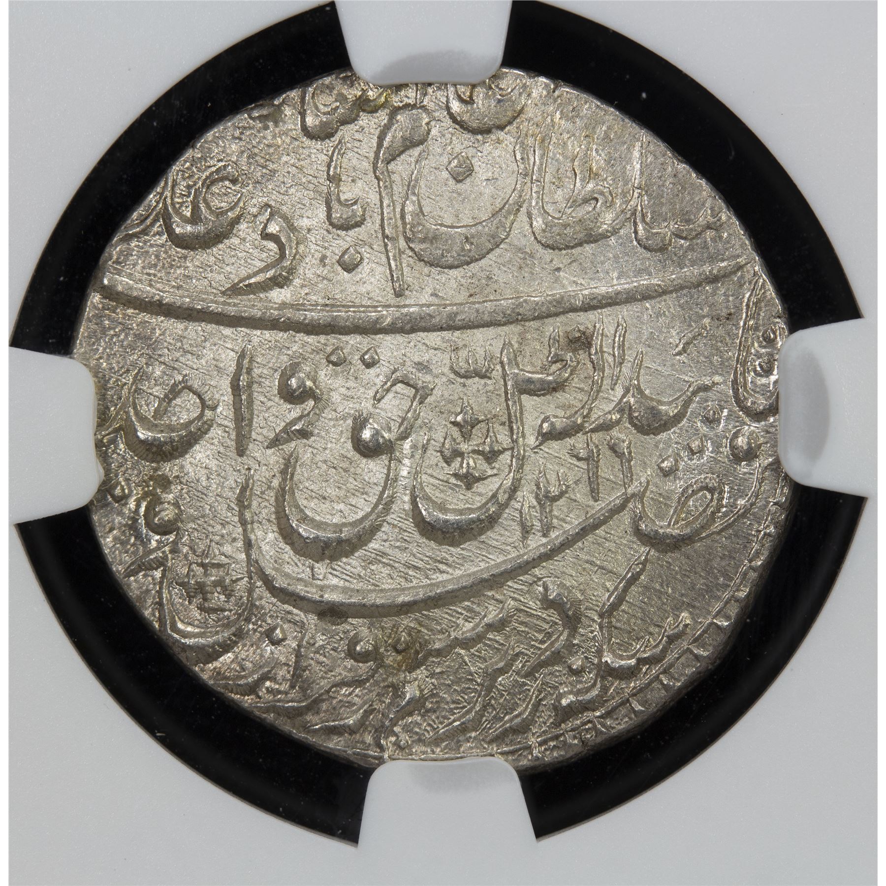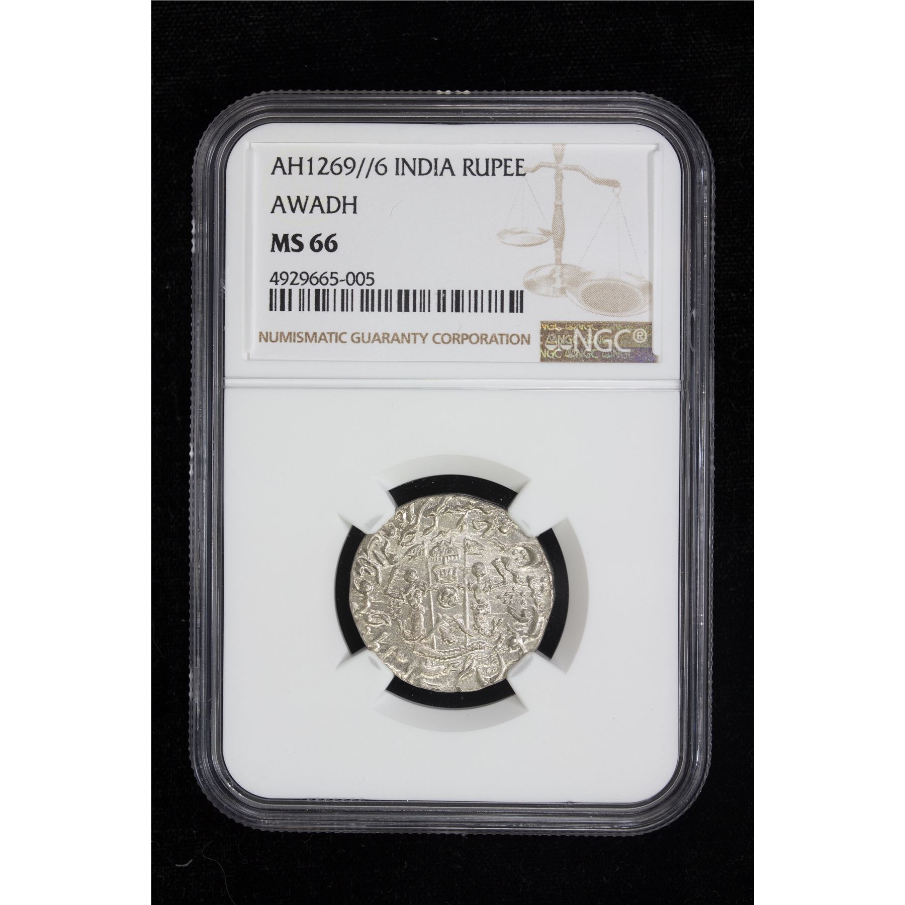AWADH: Wajid Ali Shah, 1847-1856, AR rupee, Lucknow, AH1269 year 6, KM-365.3, brilliant white original luster, a superb example! NGC graded MS66. Wajid Ali Shah (1822-1887) was the tenth and last Nawab of Awadh, holding the position for 9 years starting 13 February 1847. His kingdom, long protected by the British under treaty, was eventually annexed bloodlessly on 11 February 1856, two days before the ninth anniversary of his coronation.