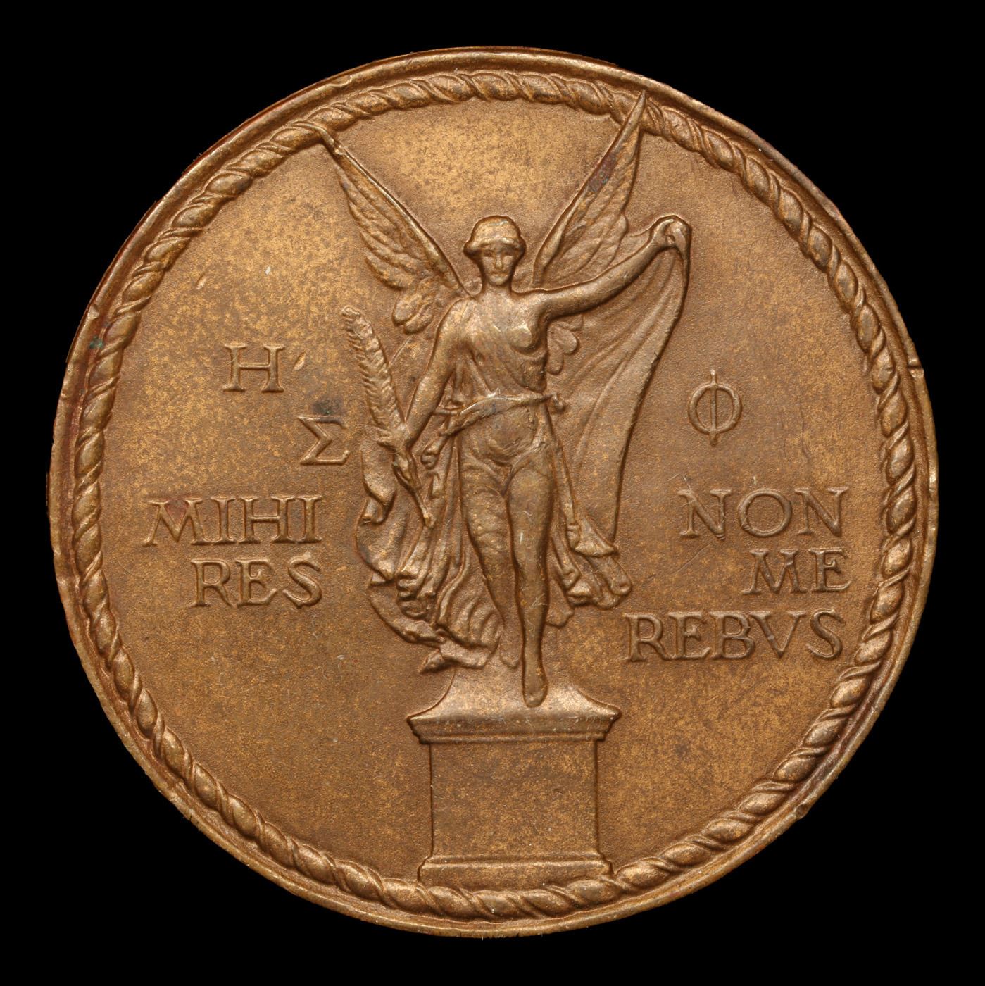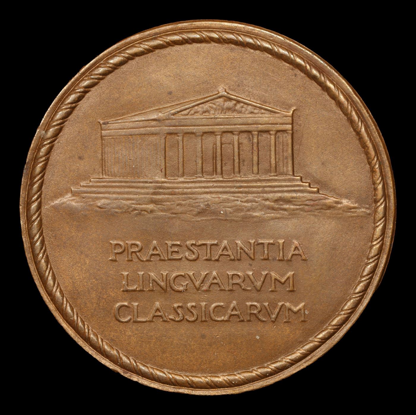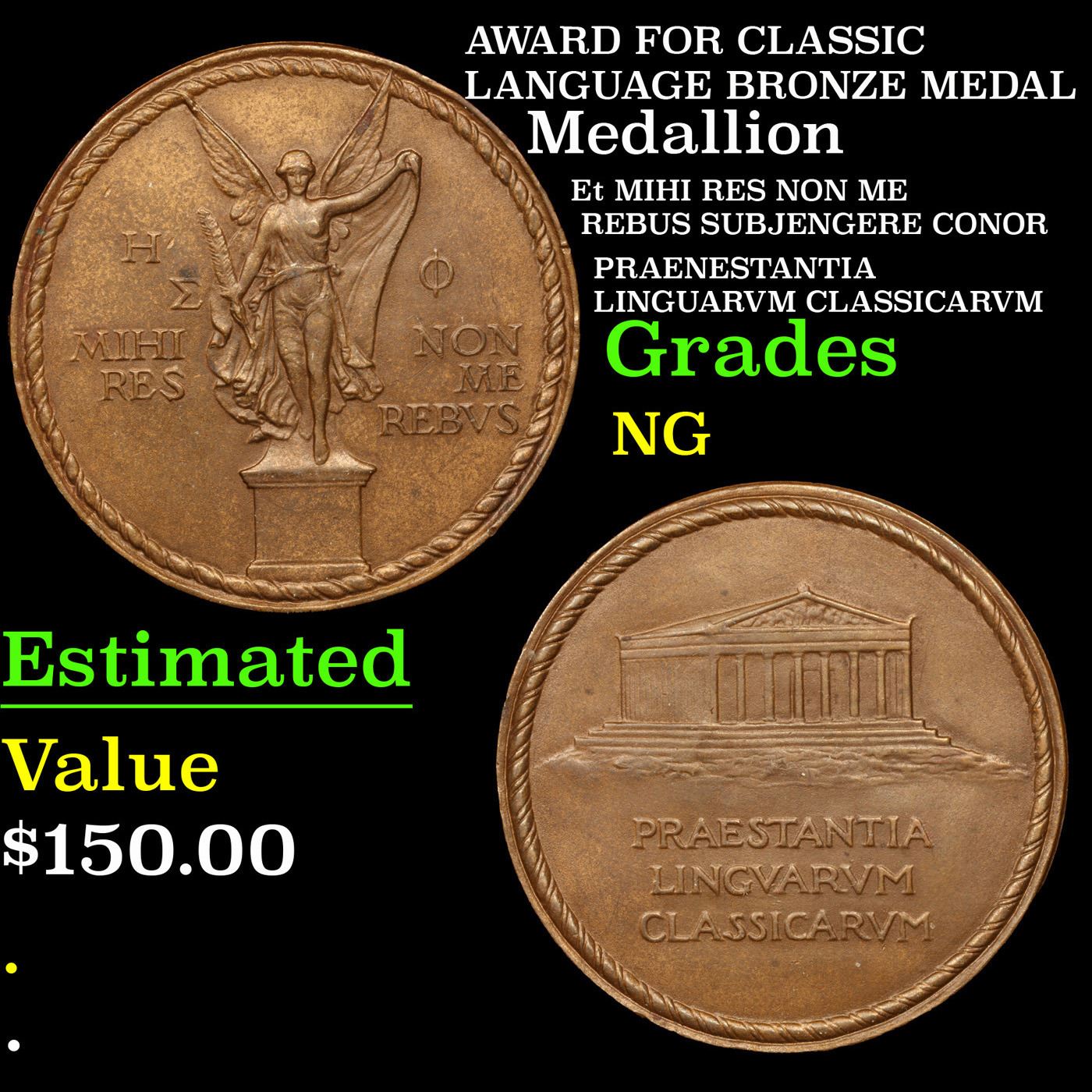AWARD FOR CLASSIC LANGUAGE BRONZE MEDAL Grades NG. a Praenestantia Linguarum Classicarum 1930's copper award for excellence in classical language studies. OBV. Winged Victory of Olympia by Paeonius of Mende (Thrace) c. 420 B.C. believed to commemorate the battles of Sphacteria and Pylos in 425 B.C., and inscription "Et MIHI RES NON ME REBUS SUBJENGERE CONOR" from Horace Epistulae I, which translates "I suit life to myself, not myself to life". Rev. Parthenon of Athens with inscription "PRAESTANTIA LINGVARVM CLASSICARVM", (effectiveness at classical language)