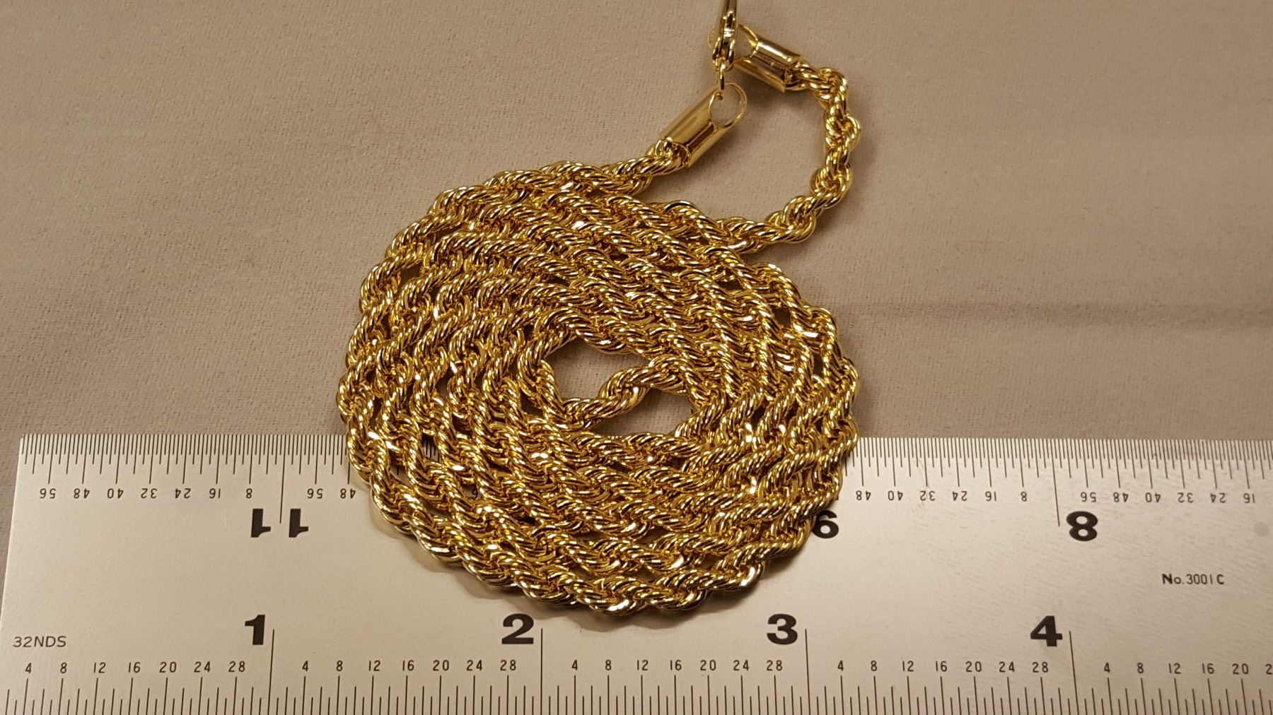 AWESOME 14 Kt. GOLD PLATED ROPE CHAIN.THIS CHAIN IS 24" LONG AND 3 mm. THICK. APPROX 23 GRAMS. SHOWS LIKE SOLID GOLD WITHOUT THE SOLID GOLD PRICE. GET READY FOR THE COMPLIMENTS ON THIS ONE.