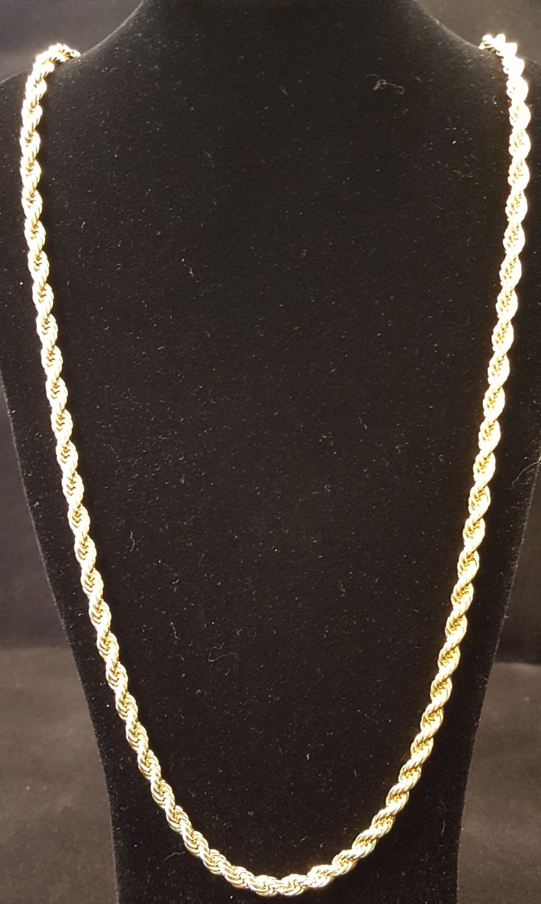 AWESOME 14 Kt. GOLD PLATED ROPE CHAIN.THIS CHAIN IS 24" LONG AND 3 mm. THICK. APPROX 23 GRAMS. SHOWS LIKE SOLID GOLD WITHOUT THE SOLID GOLD PRICE. GET READY FOR THE COMPLIMENTS ON THIS ONE.