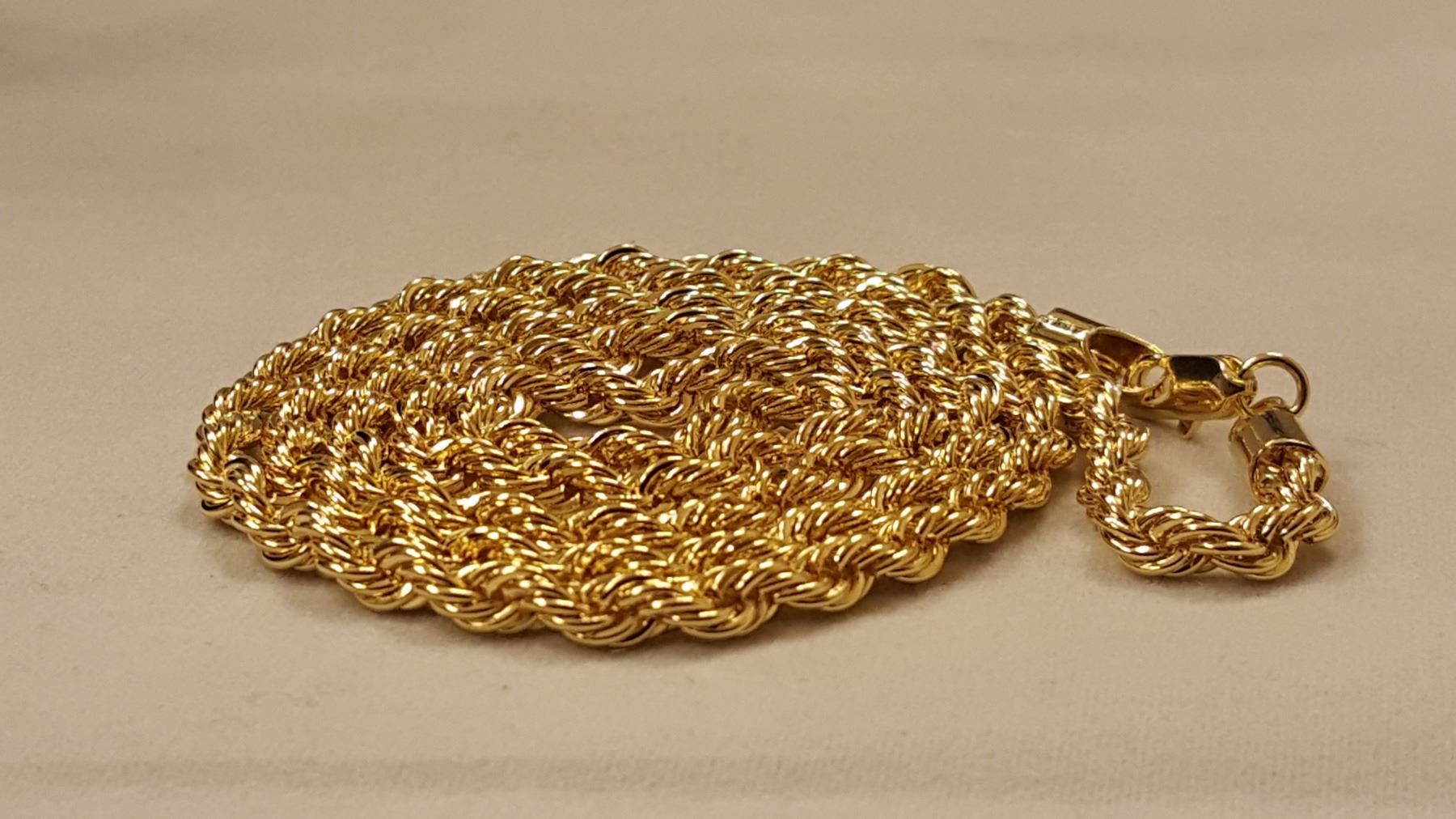 AWESOME 14 Kt. GOLD PLATED ROPE CHAIN.THIS CHAIN IS 24" LONG AND 3 mm. THICK. APPROX 23 GRAMS. SHOWS LIKE SOLID GOLD WITHOUT THE SOLID GOLD PRICE. GET READY FOR THE COMPLIMENTS ON THIS ONE.