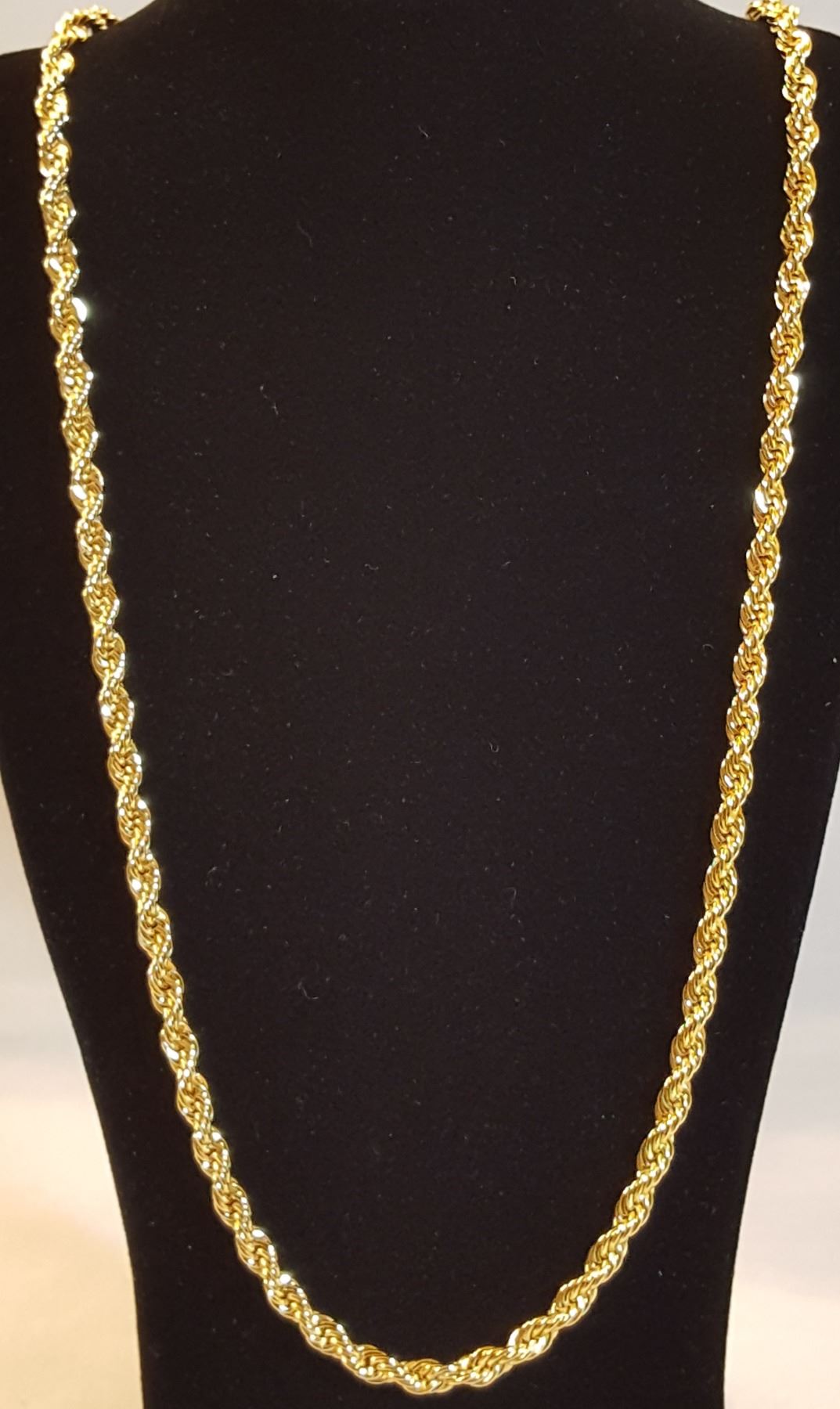AWESOME 14 Kt. GOLD PLATED ROPE CHAIN.THIS CHAIN IS 24" LONG AND 3 mm. THICK. APPROX 23 GRAMS. SHOWS LIKE SOLID GOLD WITHOUT THE SOLID GOLD PRICE. GET READY FOR THE COMPLIMENTS ON THIS ONE.