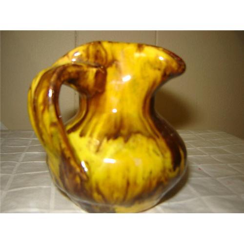 This pitcher is in excellent condition with a yellow,green and brown swirl glaze.