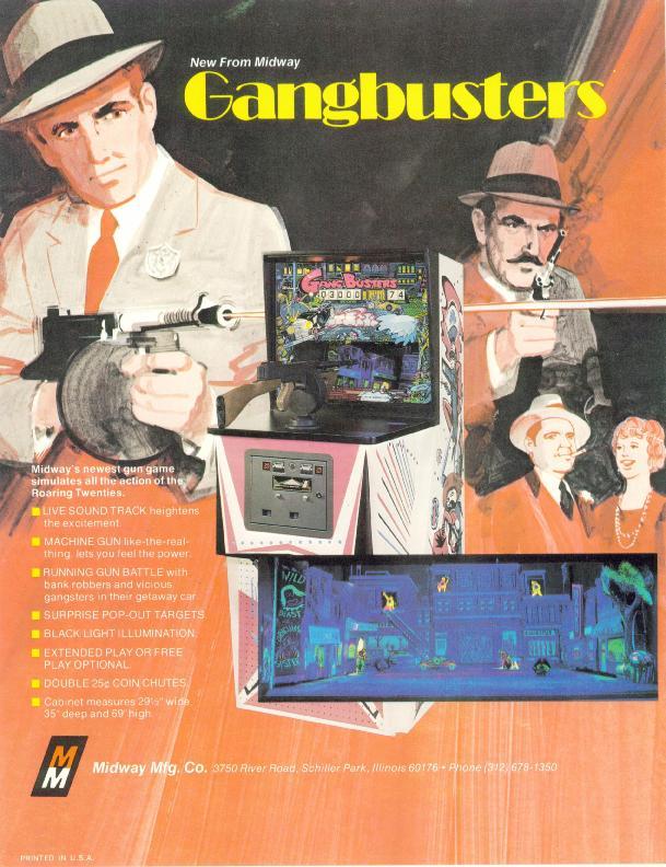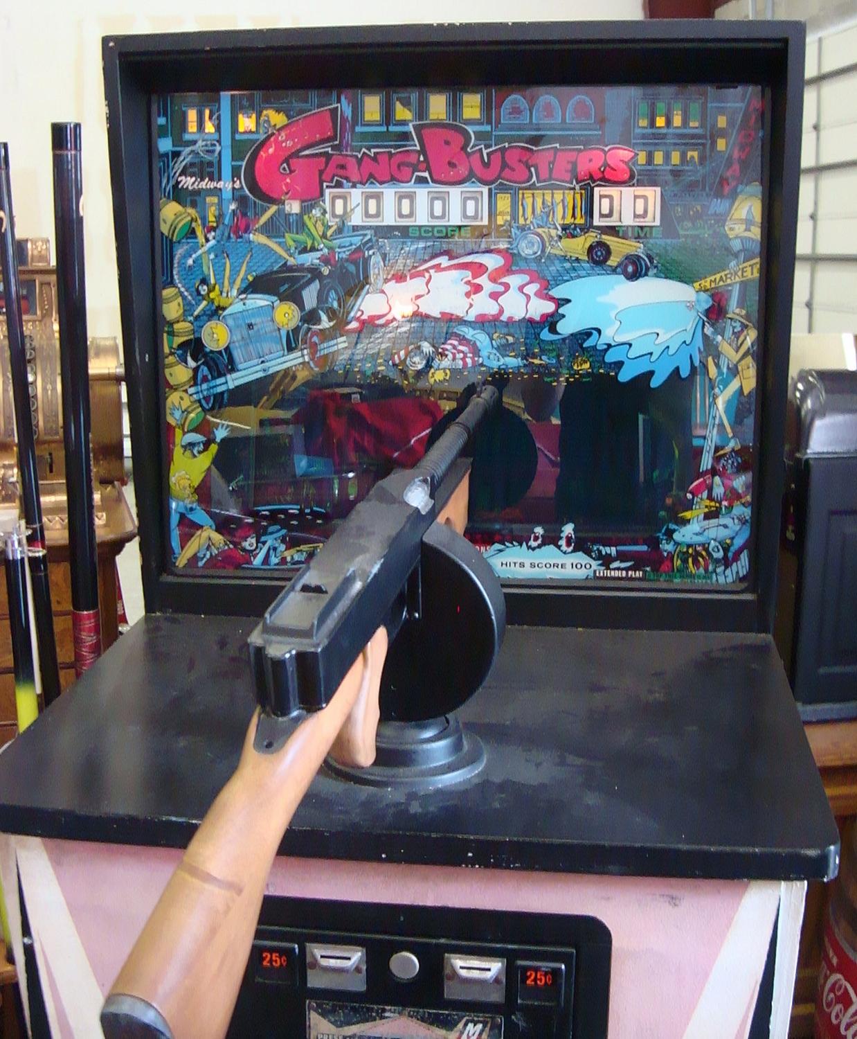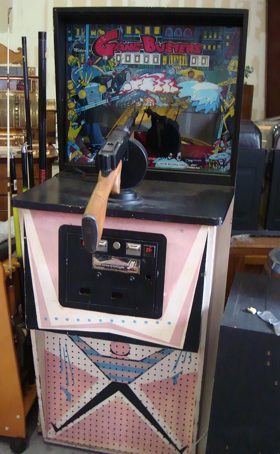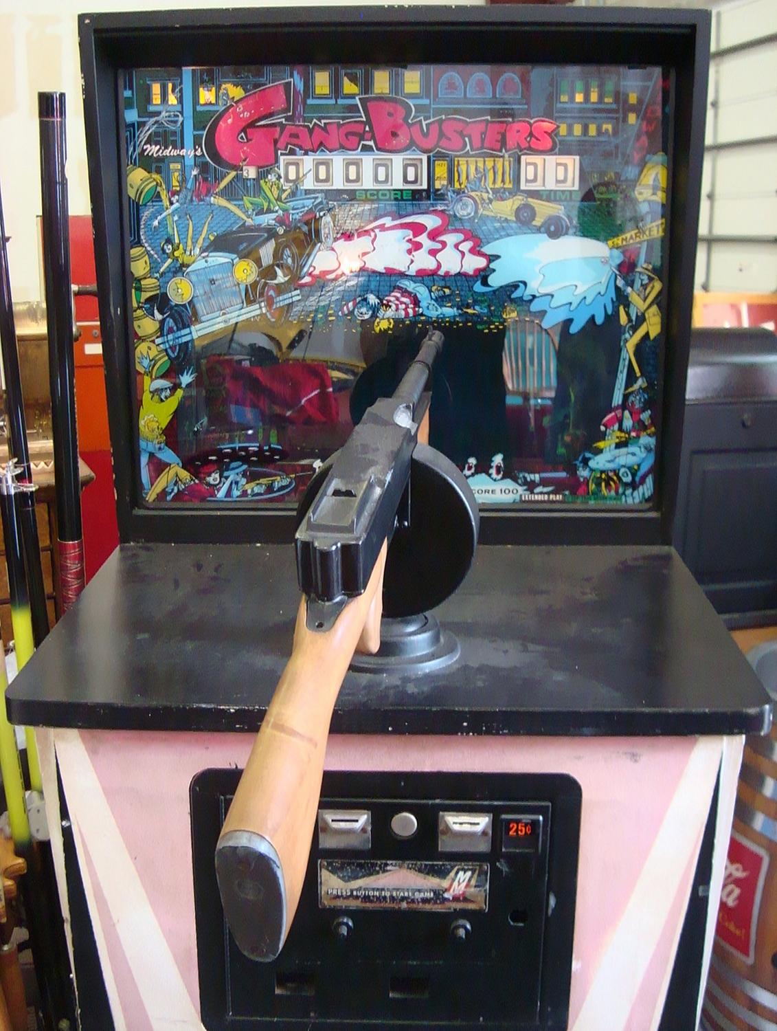 Desirable original Gang Busters Coin-Op Machine, Midway, 3/74, #563, electronic sound, 8-track sound. Has a light bulb in the gun barrel and the targets all have light sensors.