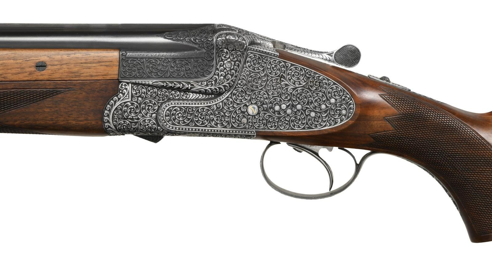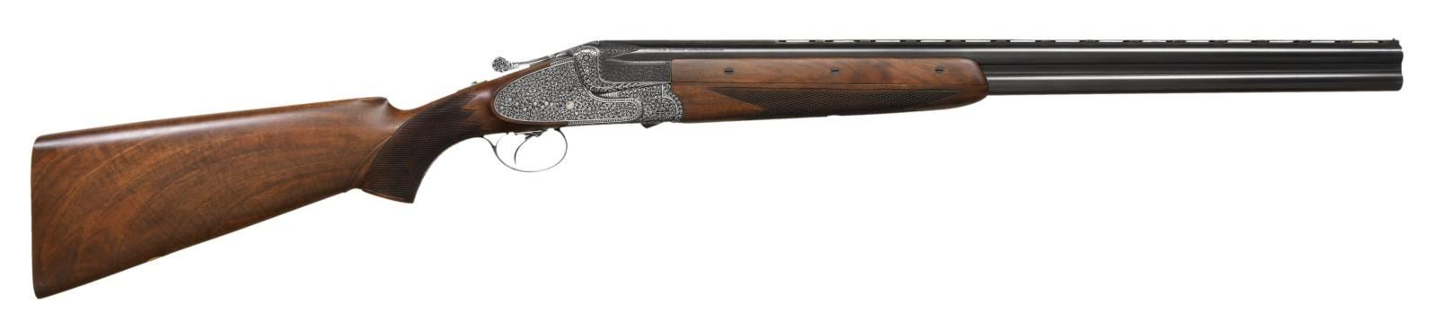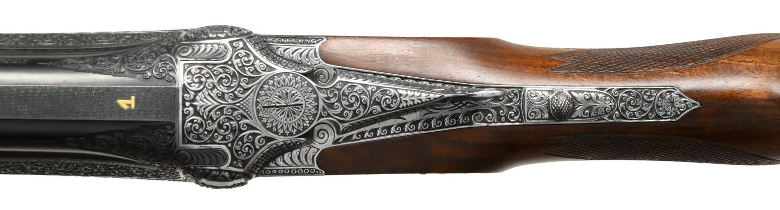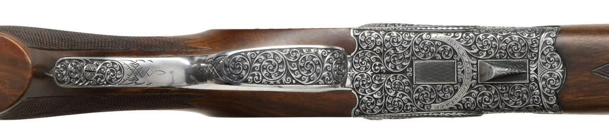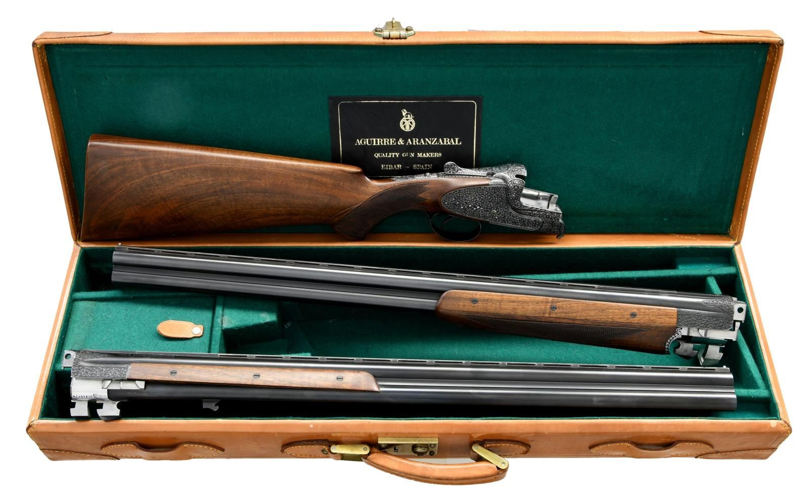 TRIGGER GAME GUN WITH 2 BARREL SETS AND CASE. Cal. 12 Ga., 2 3/4. S# 436078. Both 26" demi bloc barrel sets are fitted with low matted ventilated ribs gold inlaid "1" & "2". Both sides of ejector housings are engraved with maker's name and address and deep relief carved with large open shaded scroll. Sides of top left barrels are marked with importer's (Cyril Adams) info. Bottom barrels are stamped with Spanish nitro proofs for 2 3/4" chambers (no date code is found). Coin finished double Kirsten sidelock O/U action features non automatic safety, detachable side locks with hidden cover, gold plated internals, gold line tumbler end cocking indicators and single selective trigger. Action and lockplates are engraved with exceptionally well cut and shaded dramatic varying size open scroll with some floral and acanthus highlights. Maker's name is in arch on bottom of action. Well streaked and finely fiddle figured European walnut pistol grip buttstock measures 15 7/8" over checkered wood butt and features chin strap transition to grip, multi point pattern grip checkering and gold oval engraved "DRS". Matching, three piece ejector forend with Deeley release serves both barrel sets. MEASUREMENTS: BBLS: #1 Bore Diameter: O .726. U .726. Restriction: O .025.(Mod). U .006 (IC). BBLS: #2 Bore Diameter: O .725. U .724. Restriction: O .044 (Extra Full). U .026 (Mod). STOCK: DAH: 3". DAC: 1 3/4-". CAST: about 1/2" off. LOP: 15 7/8". WEIGHT: 8 lb. 0 oz. UNATTACHED ACCESSORIES: gun comes in its original tan leather case with stitched leather corners lined in green felt. A black AYA label is in lid. Case is configured for gun and both barrel sets and contains: brown paper bag (numbered to gun) with spare main springs, ejector springs, top lever spring and strikers. CONDITION: exceptionally fine. Appears essentially "as new" with only a very few handling and assembly marks in all fine factory finishes. Mechanically crisp. Case is also very fine. These well made guns retail at well over $21,000 when available. (23-2141/MGM). MODERN. $5,000-7,000.
