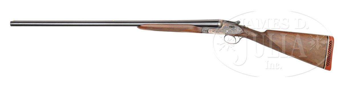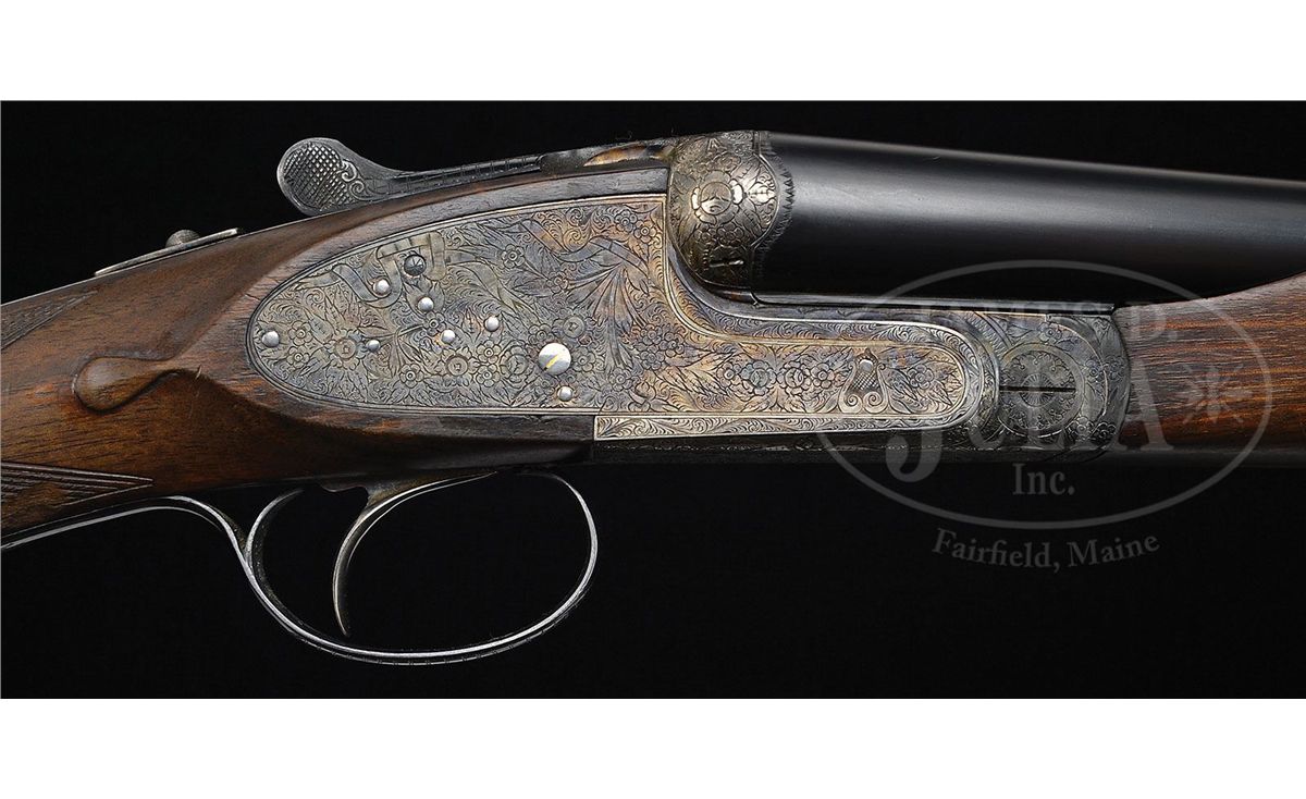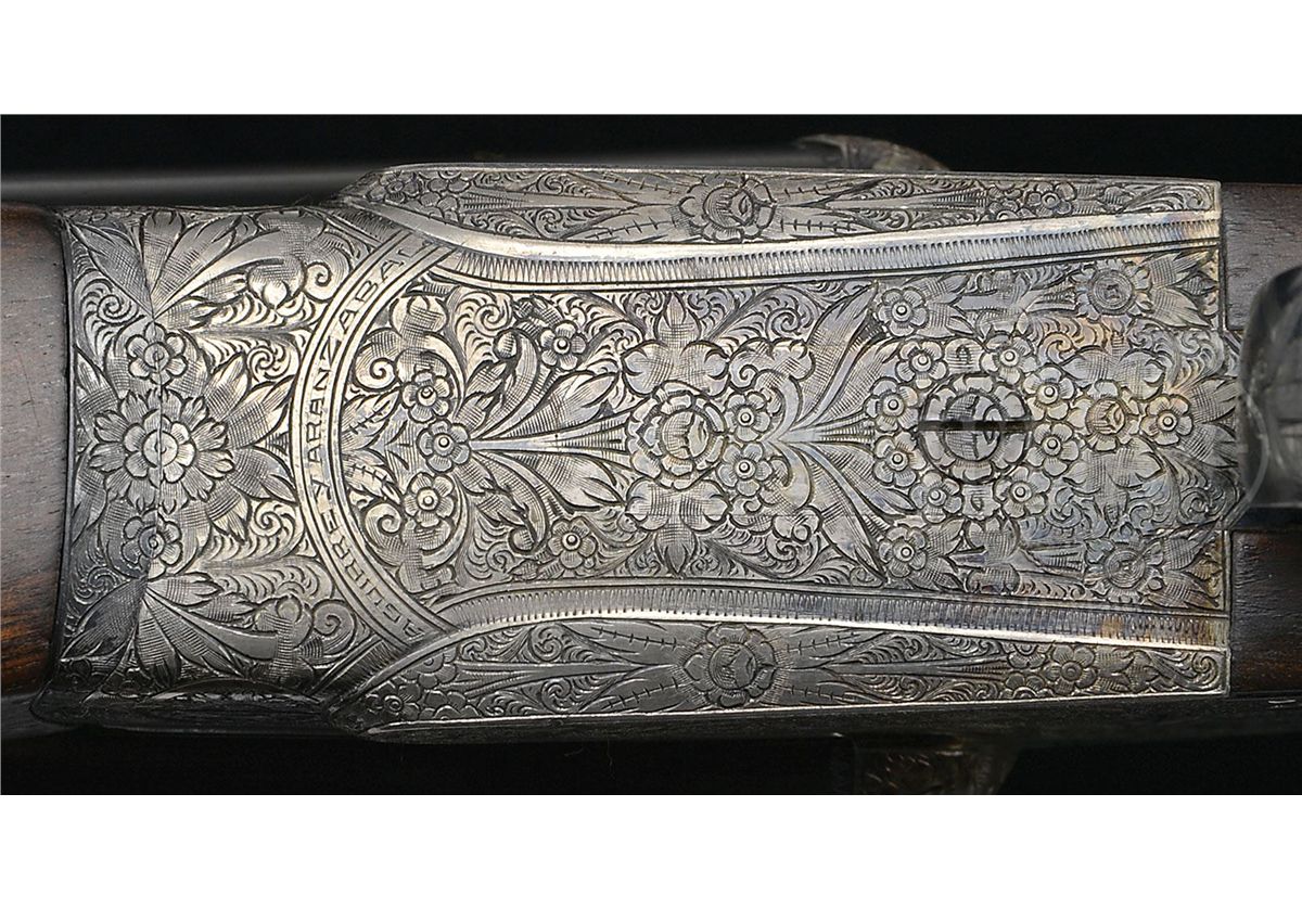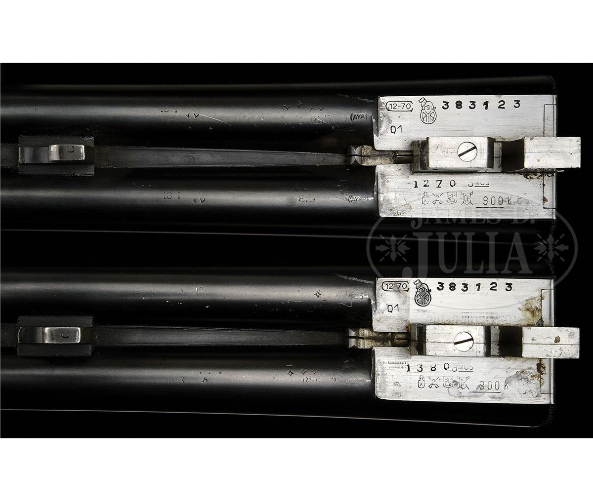 SN 383123. Cal. 12 ga. 2-3/4" Chambers. 28" and 30" Chopper lump bbls denoted by gold inlaid "1" and "2" at rear portion of narrow, swamped game ribs mounted with two ivory beads. Ribs are marked "AYA - Aguirre & Aranzabal - MADE IN SPAIN". Bbl flats are stamped with Spanish nitro proofs for 2-3/4" chambers. Case hardened rounded bar action with H & H style detachable sidelocks features automatic safety (S gold inlaid), side clips, hidden third fastener, bushed strikers, gold line tumbler end cocking indicators, and single non-selective trigger. Action is engraved with near full coverage large floral acanthus with ribbon highlights and small scroll background. "AGUIRRE Y ARANZABAL" is engraved in arched device on bottom of action. Relatively plain, but dense, European walnut straight grip buttstock measures 14-1/8" over open-sided AYA white line pad. Stock features drop points and point pattern checkering at grip. Matching beavertail ejector forend fits both sets of bbls and has Deeley release. 28" Bbls no. "1": Bore diameter: left-.724, right -.724. Bore restrictions: left -.007 (IC), right -.000 (Cyl). Wall thickness: left -.038, right -.038. Drop at heel: 2-1/2", drop at comb: 1-1/2". Weight: 7 lbs. 3 oz. LOP: 14-1/8". 30" Bbls no. "2": Bore diameter: left-.729, right -.729. Bore restrictions: left -.040 (Extra full), right -.019 (Mod). Wall thickness: left -.039, right -.035. Drop at heel: 2-1/2", drop at comb: 1-1/2". Weight: 7 lbs. 7 oz. LOP: 14-1/8". Light tan leather case with stitched leather corners has zippered vinyl outer cover, space for both sets of bbls, and is lined in green felt, with black leather AYA label on lid. Case contains a box of cleaning patches and the key. CONDITION: Very fine. Bbls retain approx 90% orig blue, with a number of light marks, scratches, and some areas of wear. Action retains most of its orig case hardening color, silvered at normal wear and carry points, and on fences. Lockplates retain most of their color. Stocks retain a considerable amount of their orig finish, with numerous light scratches and marks, and are quite dry, and bleached. Checkering is slightly worn. Bores are excellent. Action is tight. Ejectors are in time. Trigger works. Case is excellent with only a few light marks in leather, protected by its outer cover which has some stains and scuffing. Zippers work. Interior cloth has some cuts and rubs from contact with gun, and some slight insect damage. Label is very fine. 4-47875 MGM169