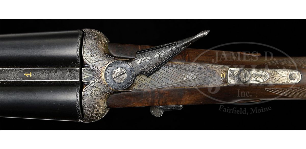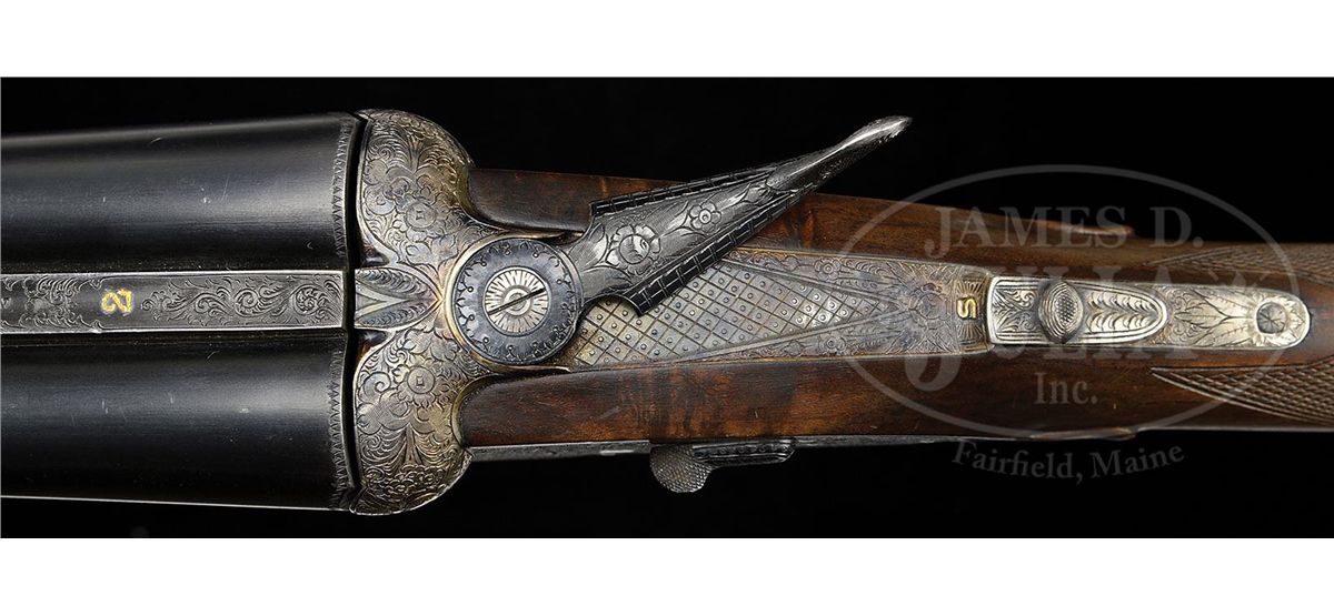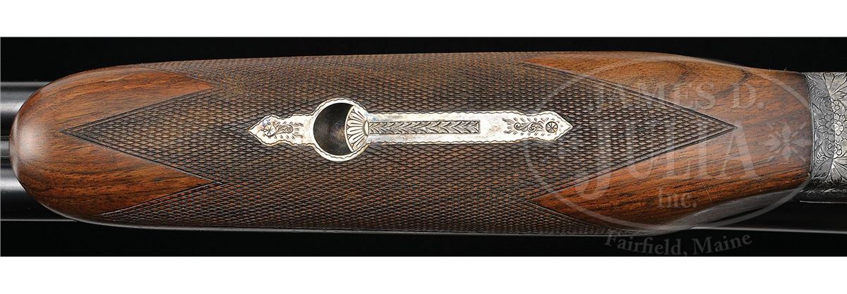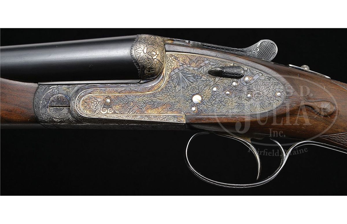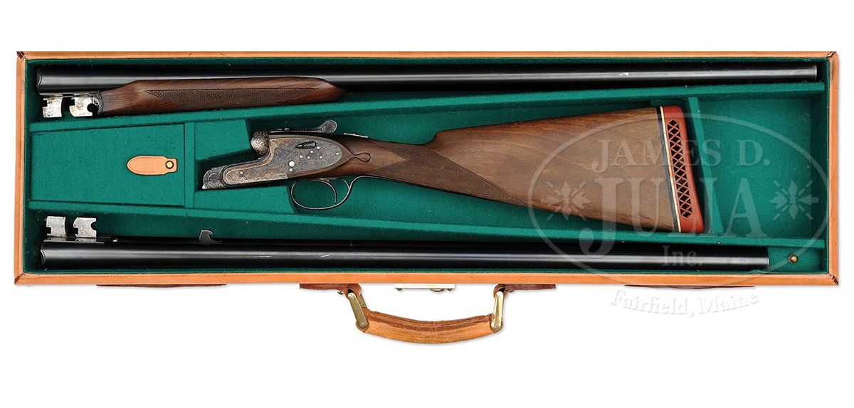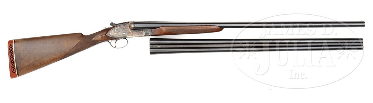 SN 383123. Cal. 12 ga. 2-3/4" Chambers. 28" and 30" Chopper lump bbls denoted by gold inlaid "1" and "2" at rear portion of narrow, swamped game ribs mounted with two ivory beads. Ribs are marked "AYA - Aguirre & Aranzabal - MADE IN SPAIN". Bbl flats are stamped with Spanish nitro proofs for 2-3/4" chambers. Case hardened rounded bar action with H & H style detachable sidelocks features automatic safety (S gold inlaid), side clips, hidden third fastener, bushed strikers, gold line tumbler end cocking indicators, and single non-selective trigger. Action is engraved with near full coverage large floral acanthus with ribbon highlights and small scroll background. "AGUIRRE Y ARANZABAL" is engraved in arched device on bottom of action. Relatively plain, but dense, European walnut straight grip buttstock measures 14-1/8" over open-sided AYA white line pad. Stock features drop points and point pattern checkering at grip. Matching beavertail ejector forend fits both sets of bbls and has Deeley release. 28" Bbls no. "1": Bore diameter: left-.724, right -.724. Bore restrictions: left -.007 (IC), right -.000 (Cyl). Wall thickness: left -.038, right -.038. Drop at heel: 2-1/2", drop at comb: 1-1/2". Weight: 7 lbs. 3 oz. LOP: 14-1/8". 30" Bbls no. "2": Bore diameter: left-.729, right -.729. Bore restrictions: left -.040 (Extra full), right -.019 (Mod). Wall thickness: left -.039, right -.035. Drop at heel: 2-1/2", drop at comb: 1-1/2". Weight: 7 lbs. 7 oz. LOP: 14-1/8". Light tan leather case with stitched leather corners has zippered vinyl outer cover, space for both sets of bbls, and is lined in green felt, with black leather AYA label on lid. Case contains a box of cleaning patches and the key. CONDITION: Very fine. Bbls retain approx 90% orig blue, with a number of light marks, scratches, and some areas of wear. Action retains most of its orig case hardening color, silvered at normal wear and carry points, and on fences. Lockplates retain most of their color. Stocks retain a considerable amount of their orig finish, with numerous light scratches and marks, and are quite dry, and bleached. Checkering is slightly worn. Bores are excellent. Action is tight. Ejectors are in time. Trigger works. Case is excellent with only a few light marks in leather, protected by its outer cover which has some stains and scuffing. Zippers work. Interior cloth has some cuts and rubs from contact with gun, and some slight insect damage. Label is very fine. 4-47875 MGM169