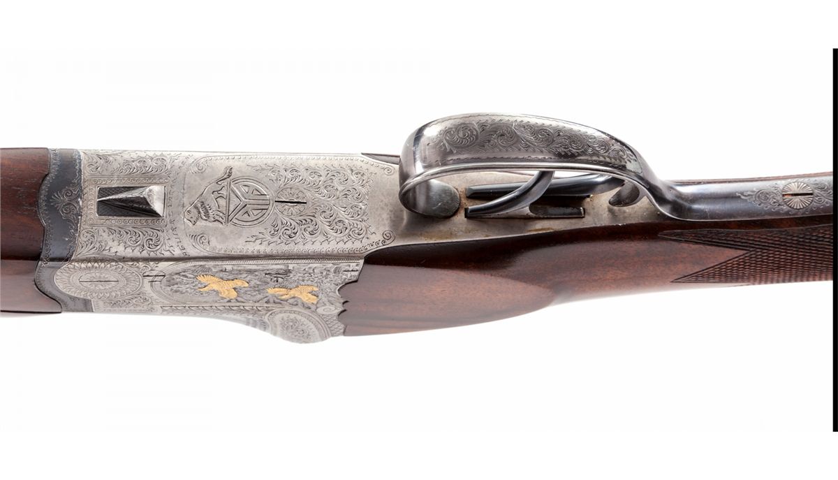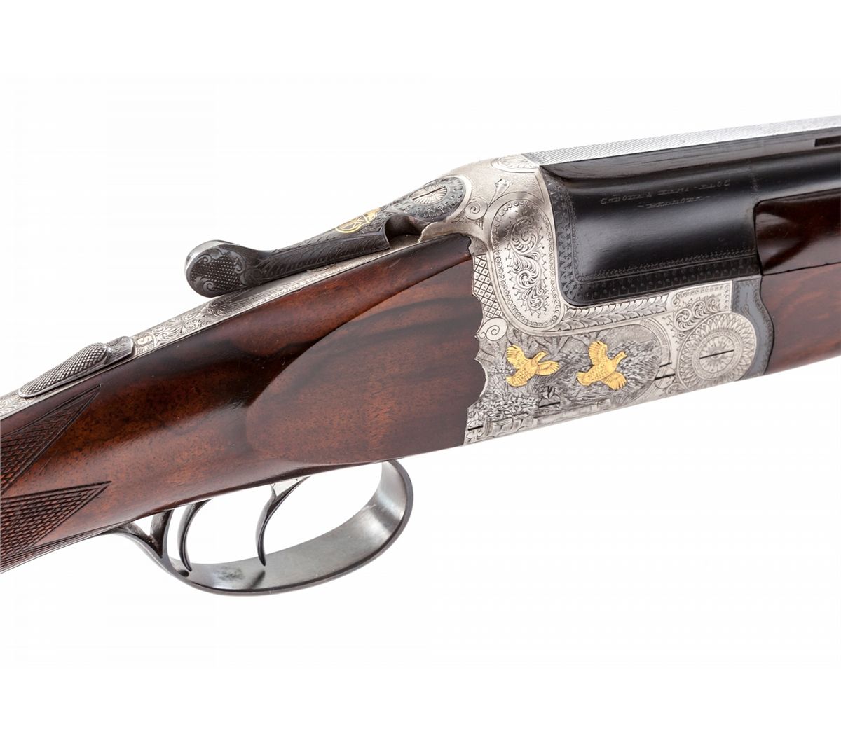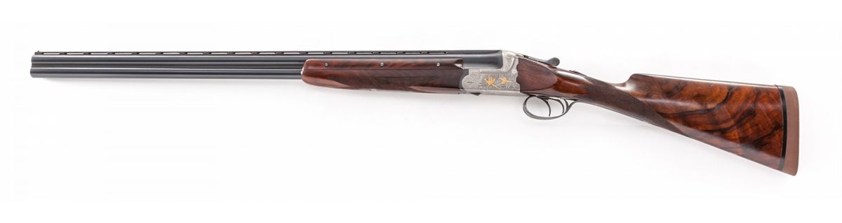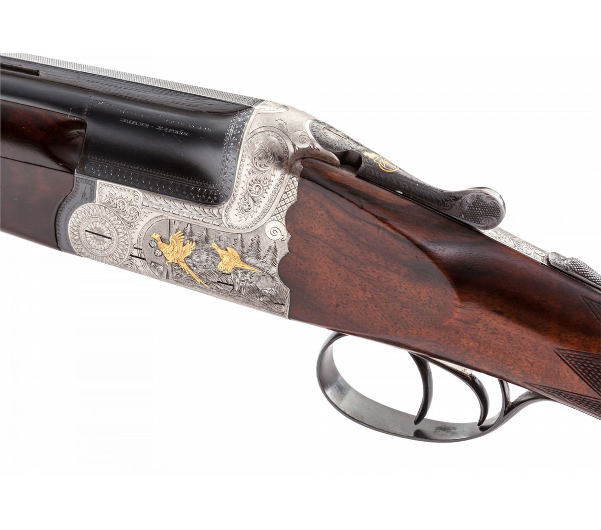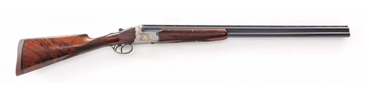 AYA Model 37 Over/Under Shotgun, #130197, 20 ga., 28'' vent rib blue barrels with single steel bead choked Full/Mod., Merkel style coin-finished receiver is game scene engraved with applied gold game birds, double triggers with ejectors, straight grip checkered claro walnut stock and three-piece forend, with old English Whiteline rubber butt pad. Condition is fine to near excellent showing light general impressions and scuffs to stock. Metal surfaces are mostly excellent with some thinning to blue at high edges of triggerguard and barrel locking block. Action is excellent, bores are fine. Length of pull to end of butt pad: 13-1/4''; length of pull to end of stock: 12-1/4''. Est.: $2,500-$4,000. (Modern)