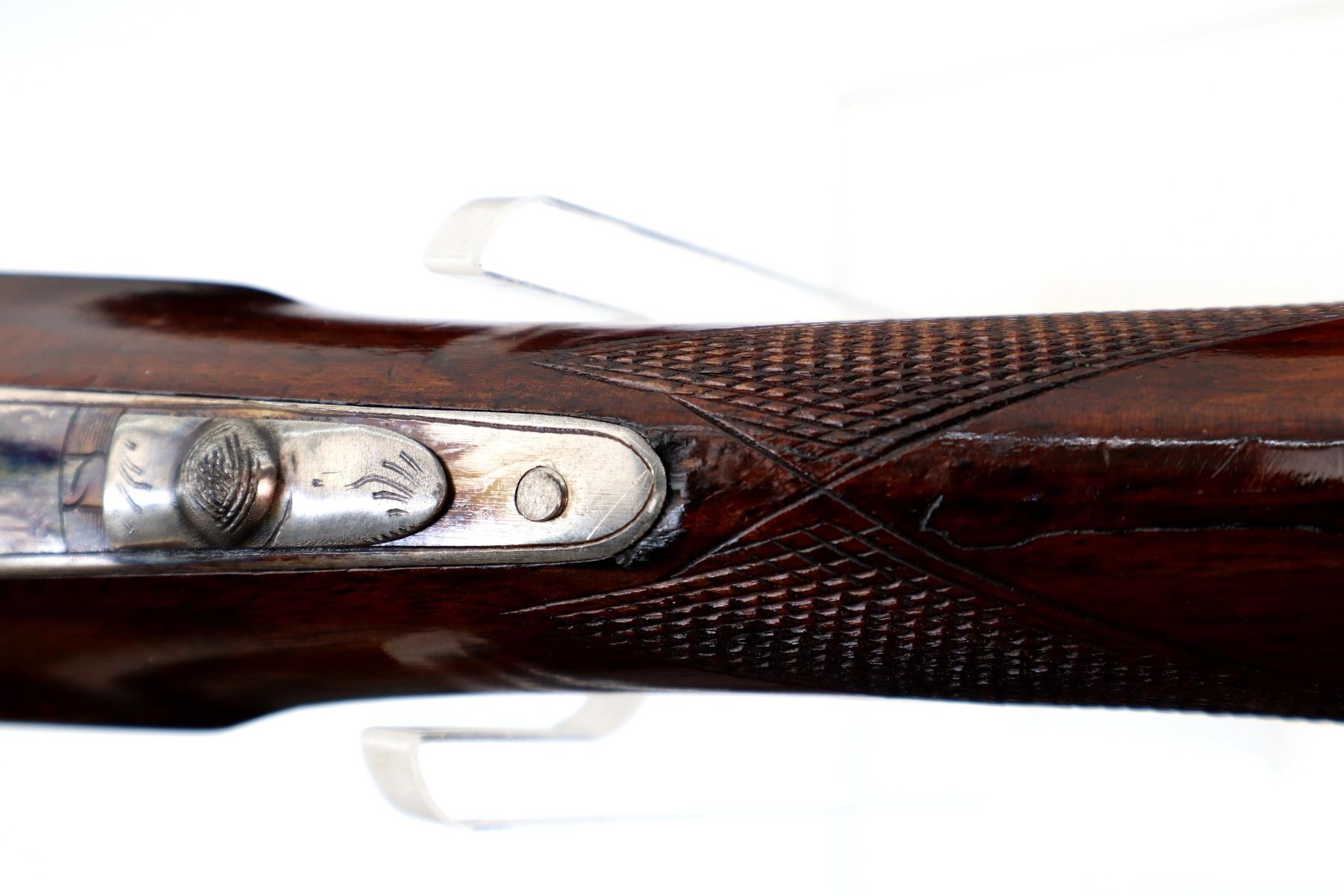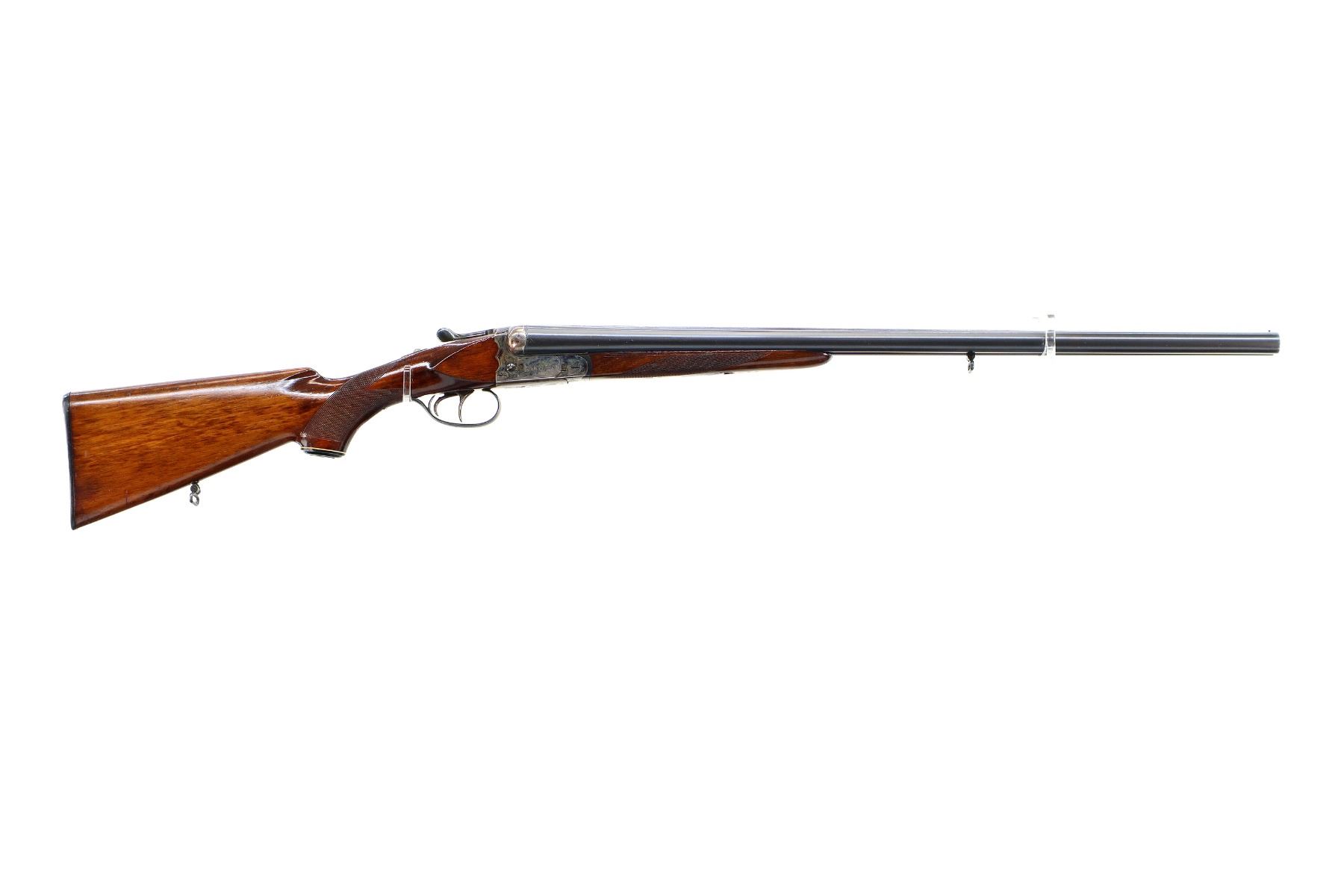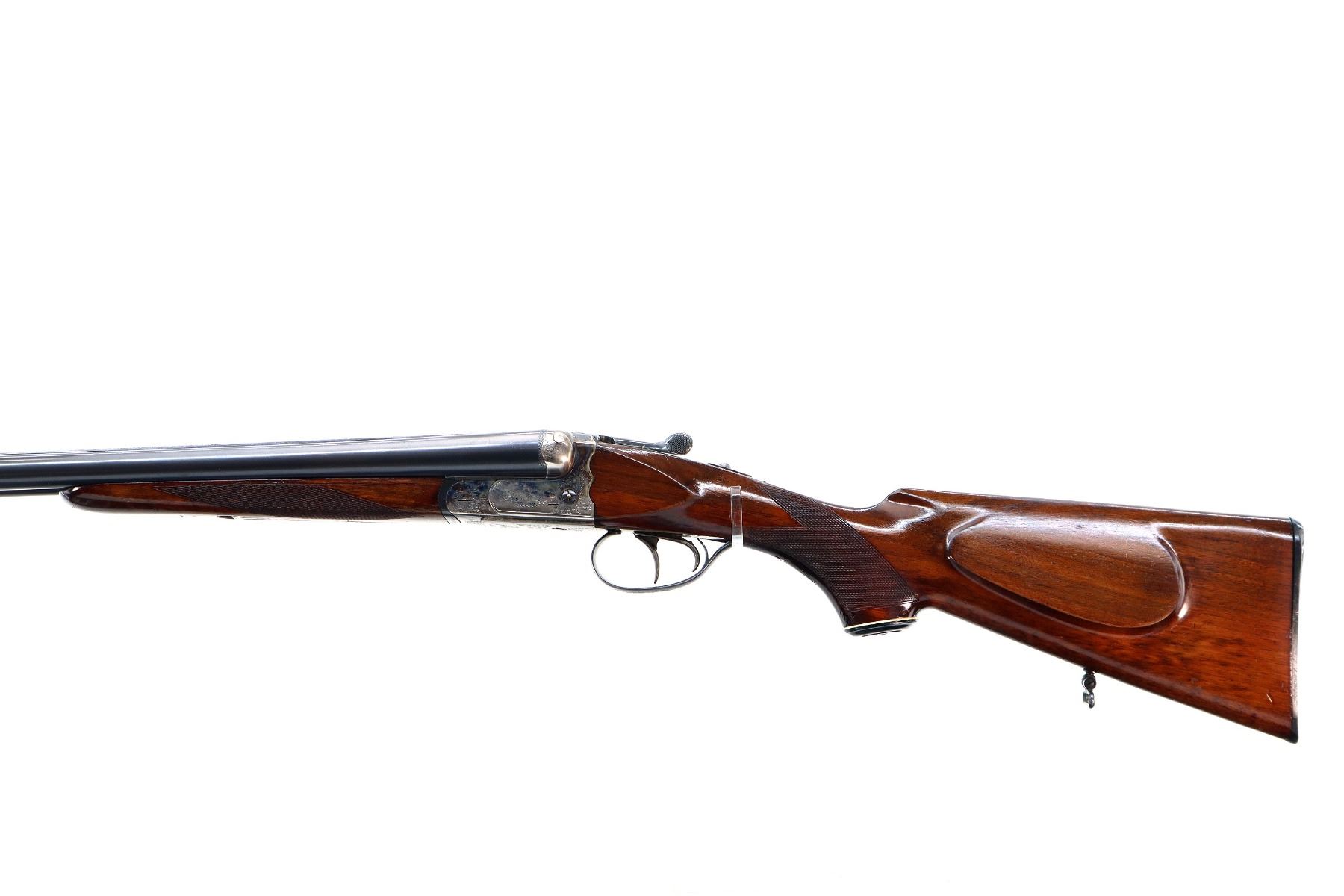 Main Description: Brass bead, blued barrels with raised rib that are loose on face, automatic safety, extractor, cocking indicators, double triggers, bottom plate is loose not tightened down. Two piece wood stocks, checkered forearm and pistol grip, chipped and cracked behind receiver and tang, European cheek rest, checkered black polymer butt plate, grip cap, sling swivels.
