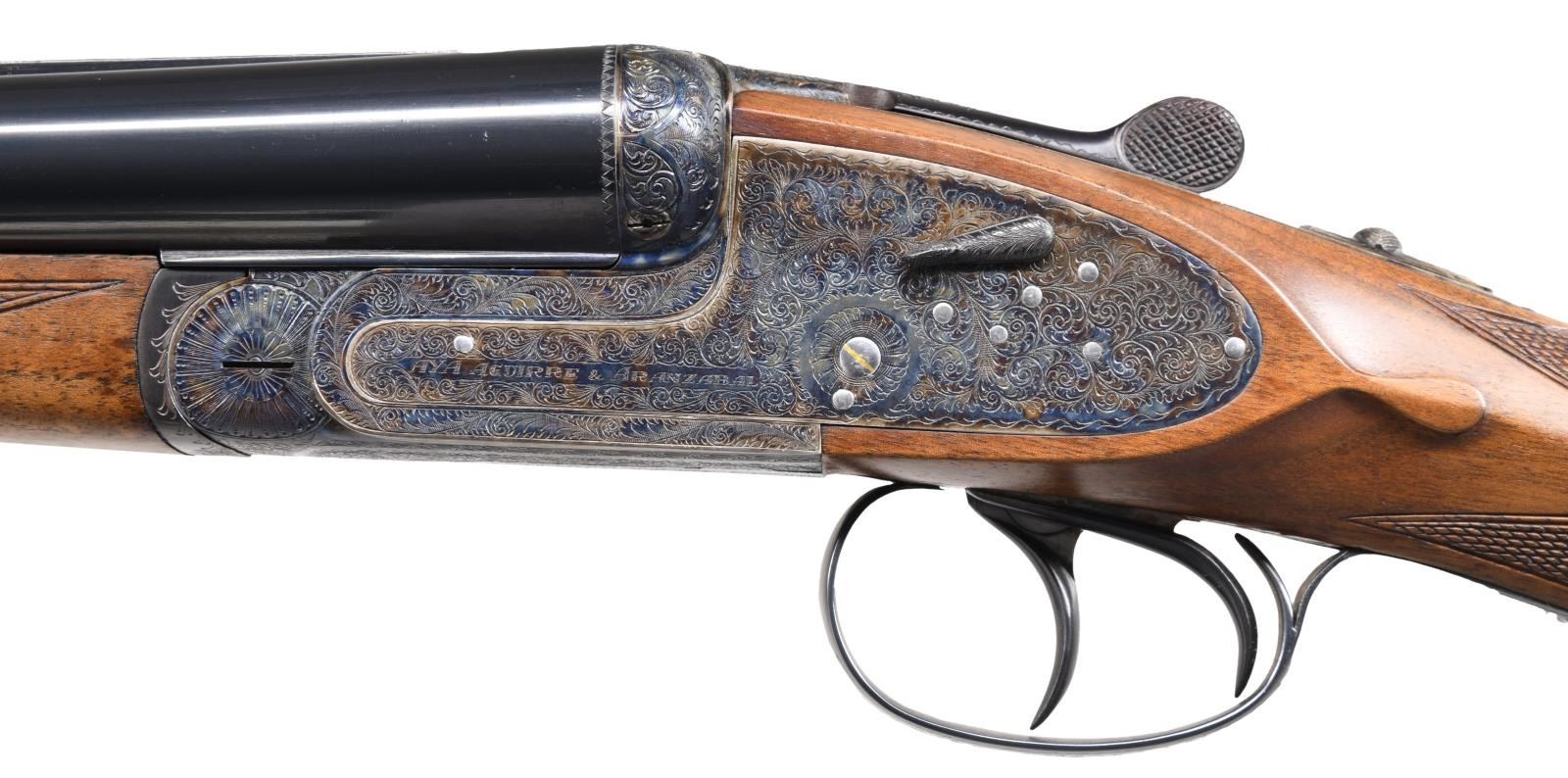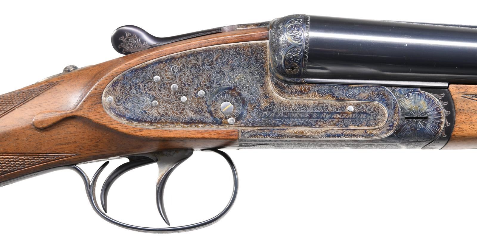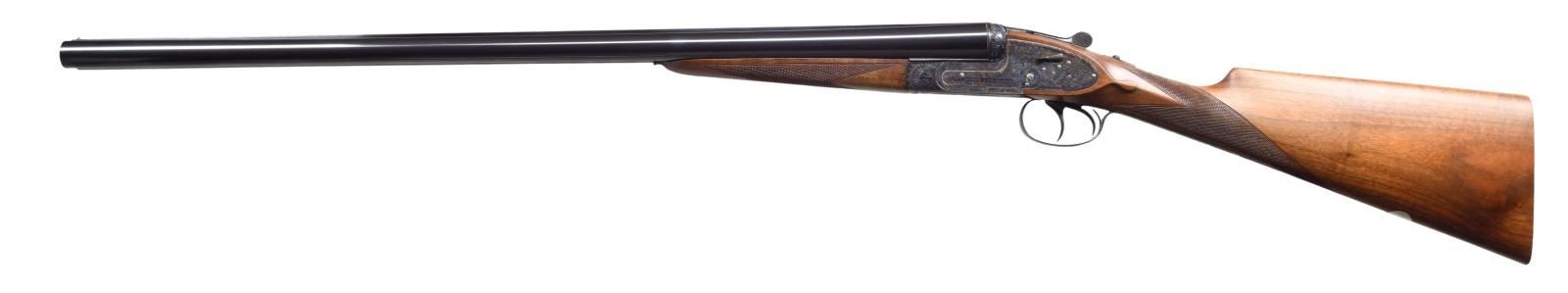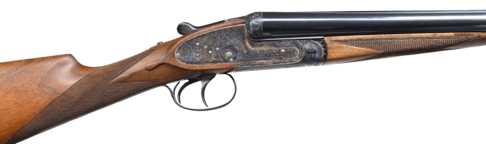Cal. 12 ga. 3" chambers. S# 602182. Bbls. 28" w/ finely matted solid rib & steel bead. Aftermarket Briley interchangeable chokes. Set of 5 tubes & wrench included. Case colored action w/ hand detachable locks, cocking indicators having double underlug locking & bushed firing pins. Full coverage arabesque scroll machine engraving. Selective ejectors. Double triggers, front trigger is hinged. Splinter forearm & straight grip walnut stock w/ hand checkering. LOP: 14 1/8" to checkered butt. DAC: 1 1/2". DAH: 2 1/2". Stock has approx. 1/8" cast off. Bore diameter: R .723 L .723. Minimum wall thickness: R .034 L .031. WEIGHT: 7 lbs, 4.2 oz. Mfg. 1992. Bbls. are import marked "Armes de Chasse". UNATTACHED ACCESSORIES: spare Briley chokes & wrench. Leather covered hand protector for bbl. 2 chrome finished snap caps. CONDITION: near excellent over 98% blue & case colored finish. Very good original wood finish. Bright bores have some plastic fowling forward of the chambers. (24-1439/DS). CURIO. $2,500-3,500.
