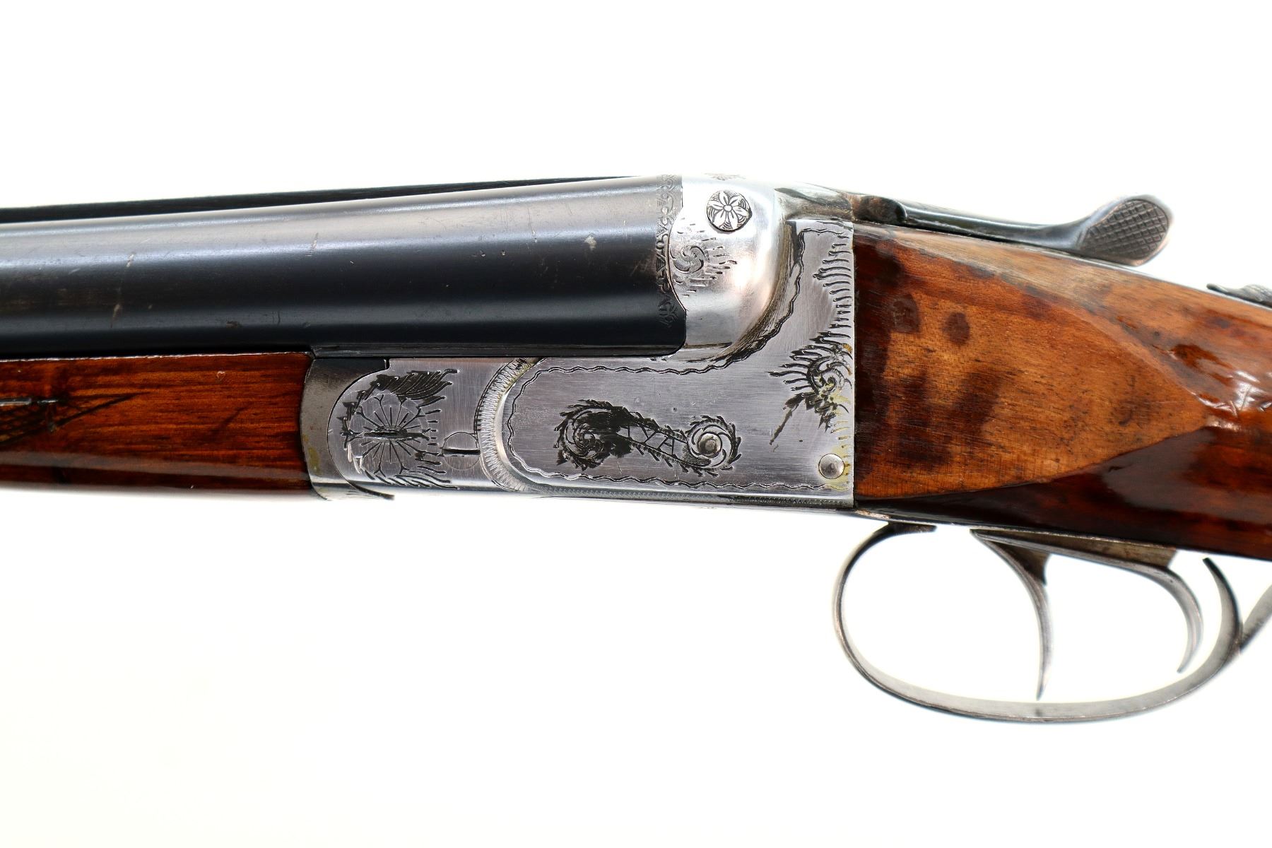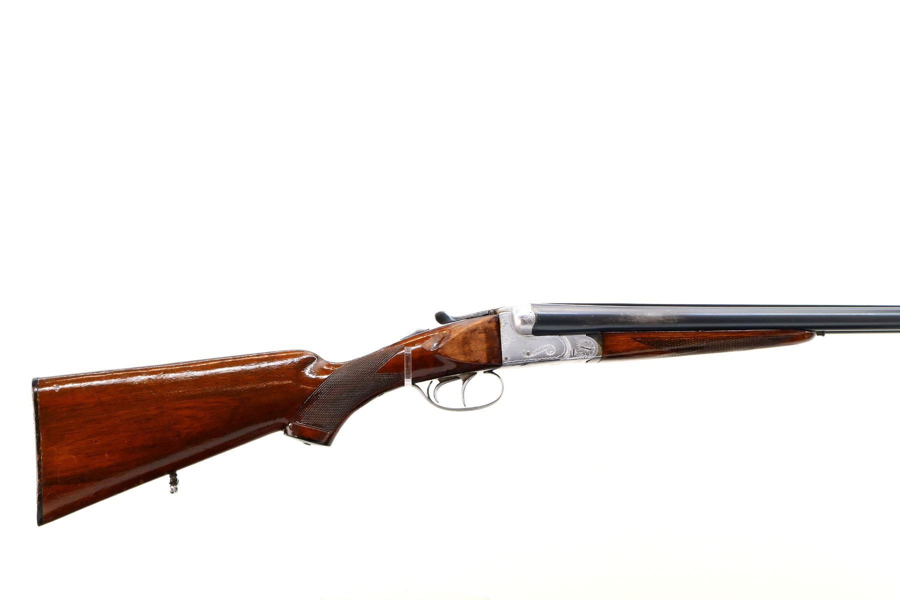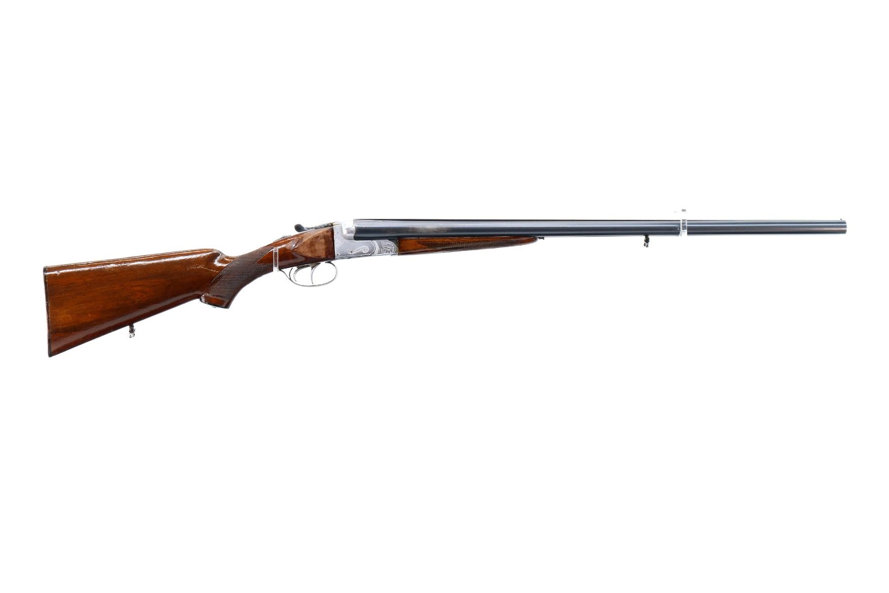 Main Description: Brass bead, blued barrels with solid rib dented on left side, engraved silver receiver, automatic safety, extractor, double triggers. Two piece refinished wood stocks, checkered forearm and pistol grip, grooved black polymer butt plate, grip cap, sling swivels.