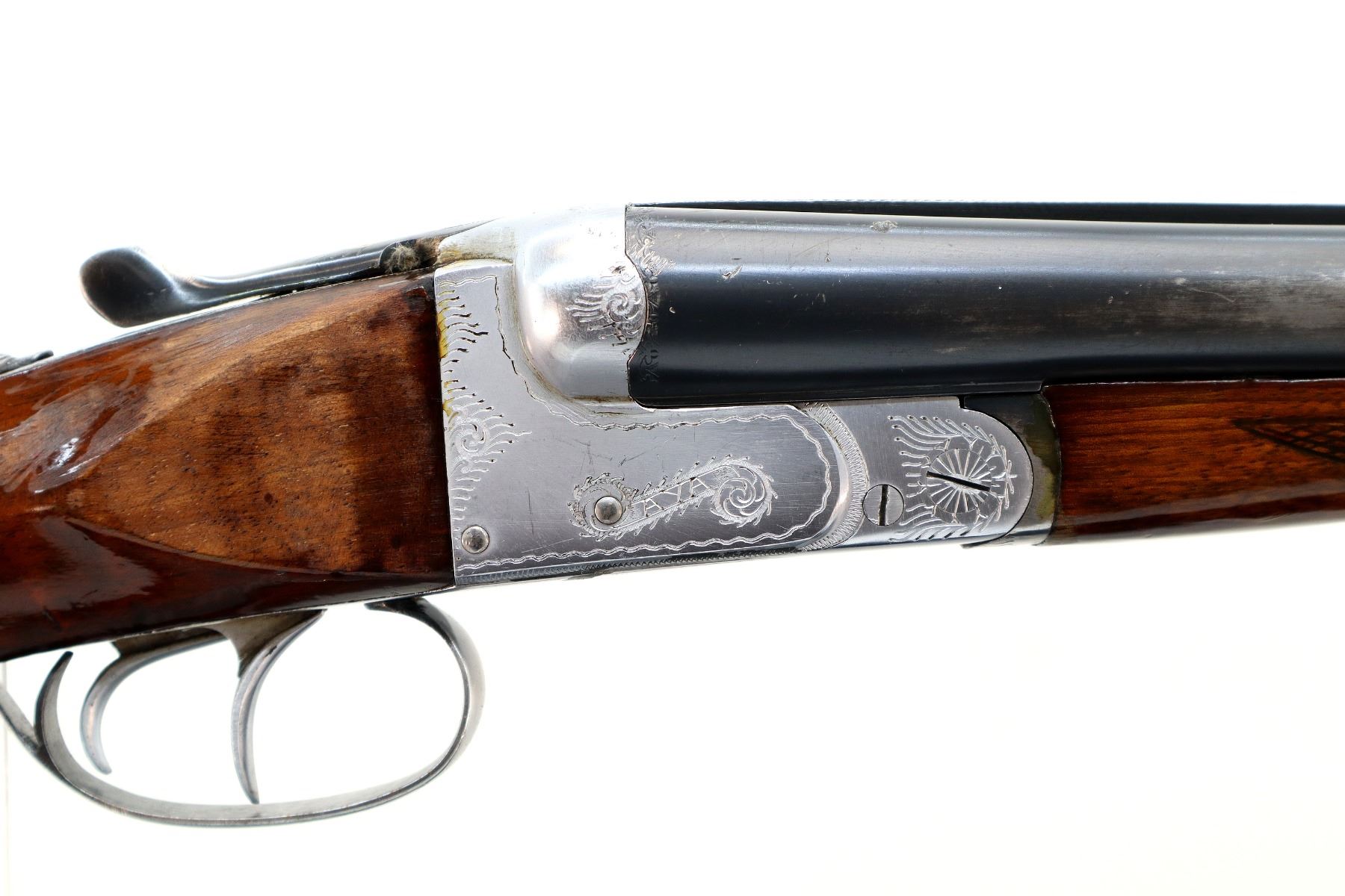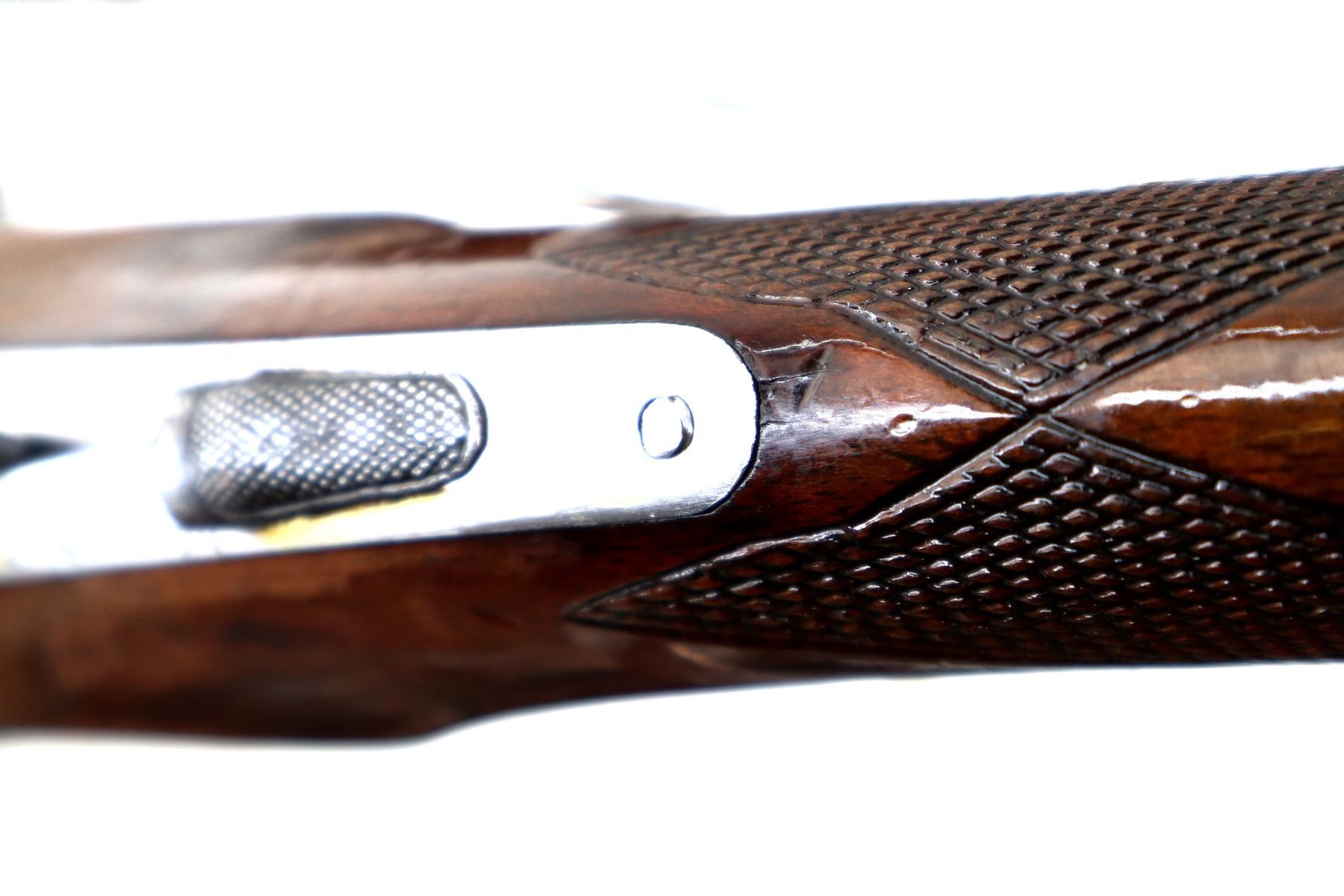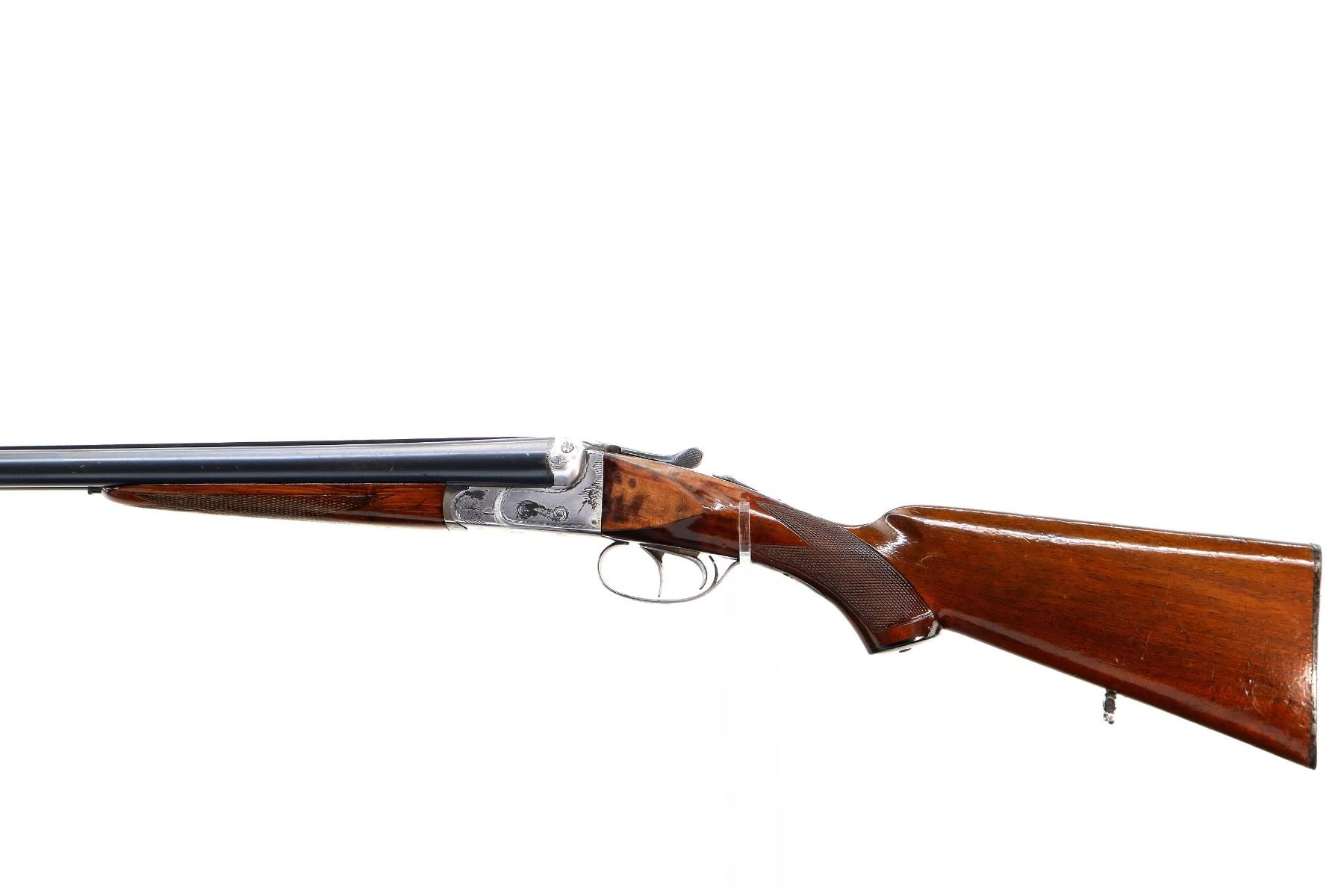Main Description: Brass bead, blued barrels with solid rib dented on left side, engraved silver receiver, automatic safety, extractor, double triggers. Two piece refinished wood stocks, checkered forearm and pistol grip, grooved black polymer butt plate, grip cap, sling swivels.