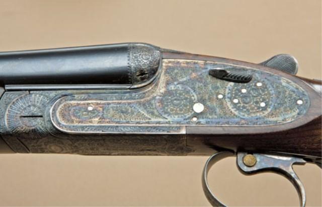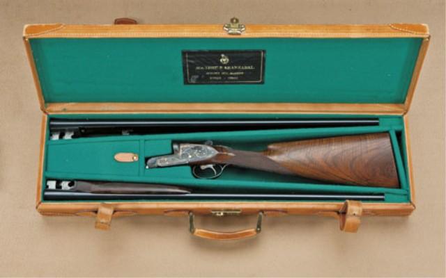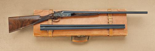 AYA double-barrel 20ga sidelock shotgun, two-barrel set, model NR1, showing hand detachable locks, single select trigger, auto ejectors, English style straight stock, checkered butt, beavertail forend, finely scroll and floral engraved in case, serial #435775, made about 1974. Barrel #1 measures 28”, is choked Cylinder and Cylinder. Barrel #2 is 28” and choked Cylinder and Full. The condition is fine to excellent showing just some slight use, 98-99% plus. The stock measures 15-1/8” from the trigger to the end of the checkered wood. Stocks show a few minor scratches, bumps, and normal use. Est: $2,500 - $4,000