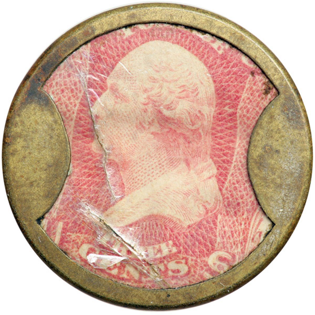 "AYER'S SARSAPARILLA" EP-34A, HB-30, S-15a, 3¢ Medium AYER'S, Plain frame. . Fr-EP-34A. The case on this AYER'S piece is among the nicer we've seen, with original and problem-free surfaces. Ample silvering remains on the back. The mica is cracked and crazed at the bottom and left sides, but the balance retains decent clarity. The stamp is an attractive reddish-pink color with no apparent flaws. Extremely Fine.