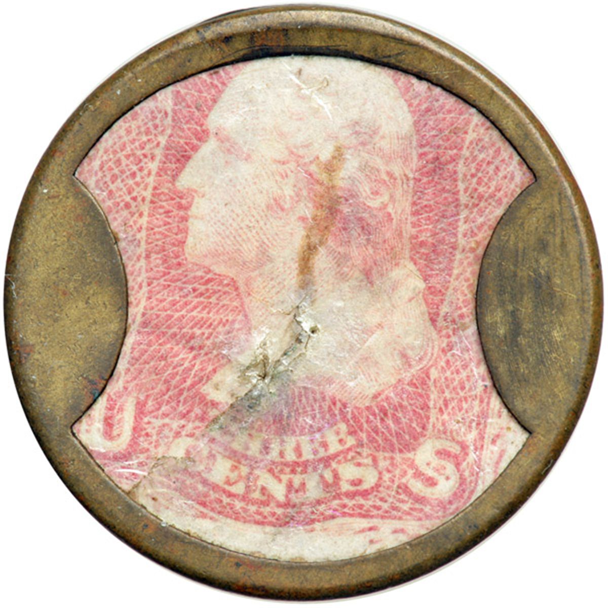 "AYER'S SARSAPARILLA" EP-34B, HB-32, S-15b, 3¢ Large AYER'S, Plain frame. . Fr-EP-34B. In Fred Reed's reference, he estimates the survival of this variety at about 41-50 pieces. This one has a case that is a very attractive olive-brown, is unopened and completely original, and is problem-free save for a minor flaw on the reverse at 12 o'clock which was caused by improper assembly. The mica displays moderate crazing and a crack, which caused a minor stain on the stamp. Very Fine.