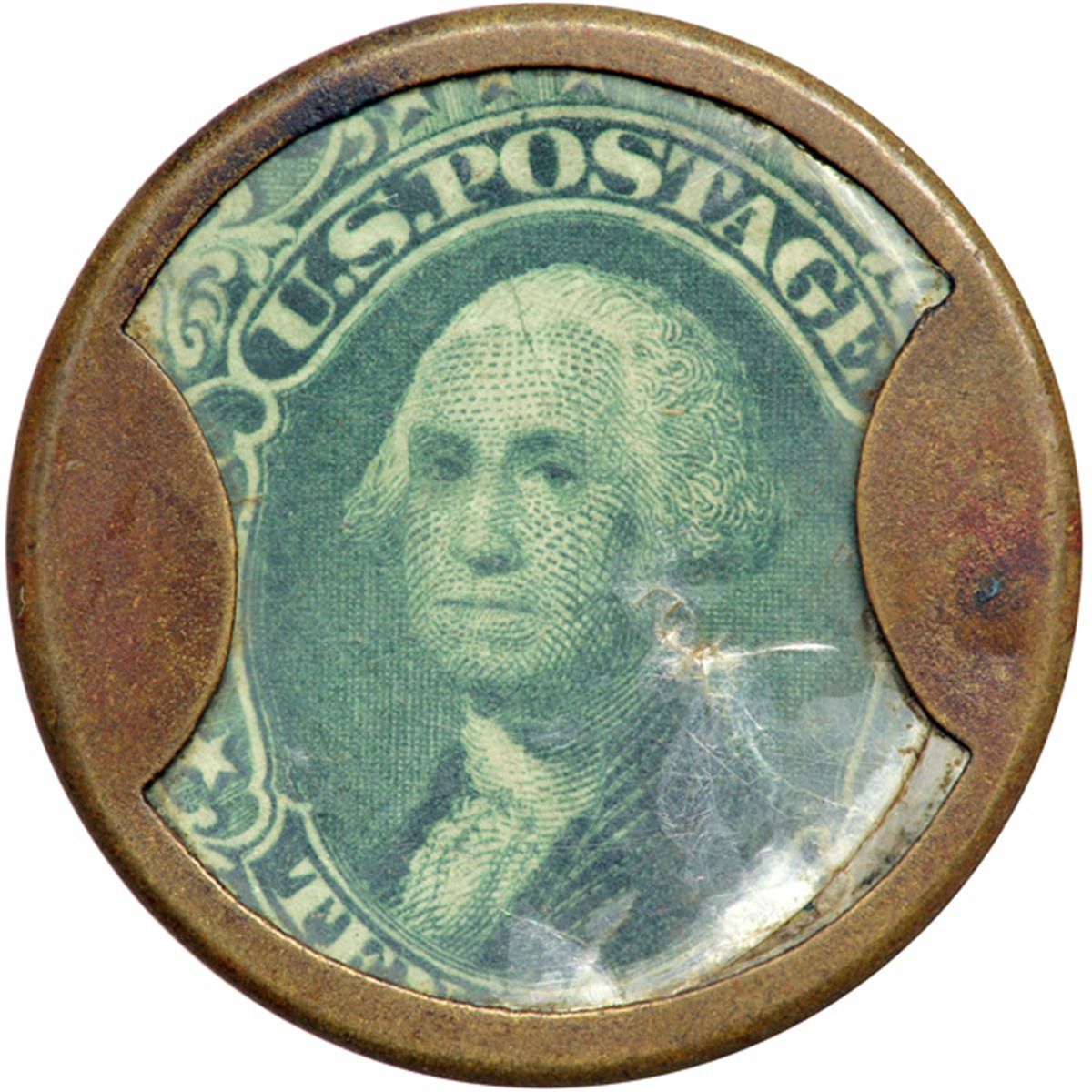 "AYER'S SARSAPARILLA" EP-98A, HB-36, S-17, 10¢ Medium "AYER'S", Plain frame. . Fr-EP-98A. A second very attractive example, the case just as nice or nicer than the previous piece. It is original and free of any signs of tampering. The mica displays more crazing than the last, with some very minor cracking present as well. The stamp is very nice overall with good color and brightness, although not well centered. Extremely Fine.