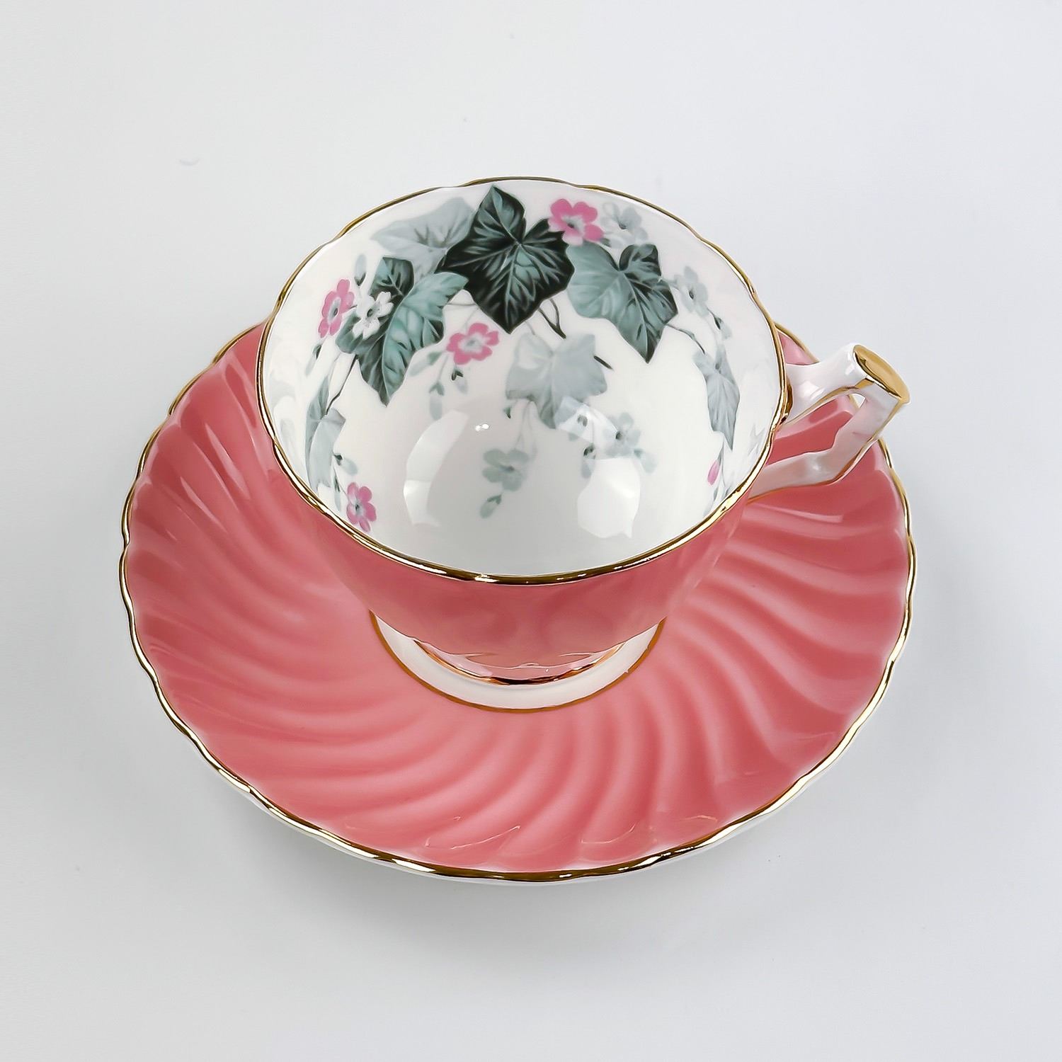 #8895 - VINTAGE AYNSLEY PINK TEA CUP AND SAUCER SET - FLORAL PINK FLOWERS WITH GREEN LEAF LEAVES PATTERN AND GOLD TRIM. MADE IN ENGLAND BONE CHINA - REGD. NO. 765788 - CROWN AYNSLEY ENGLAND BACKSTAMP.