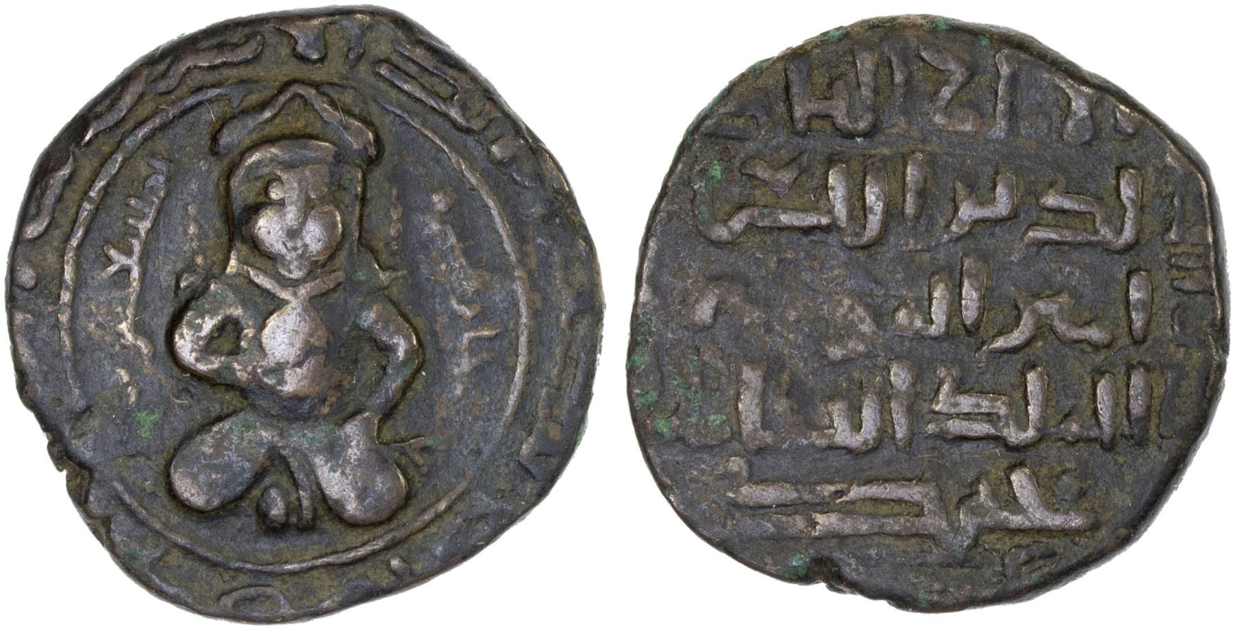 AYYUBID: al-Ashraf Musa, 1210-1220, AE dirham (6.94g), Sinjar, AH615, A-859.2, B-853, seated figure, holding orb, VF.