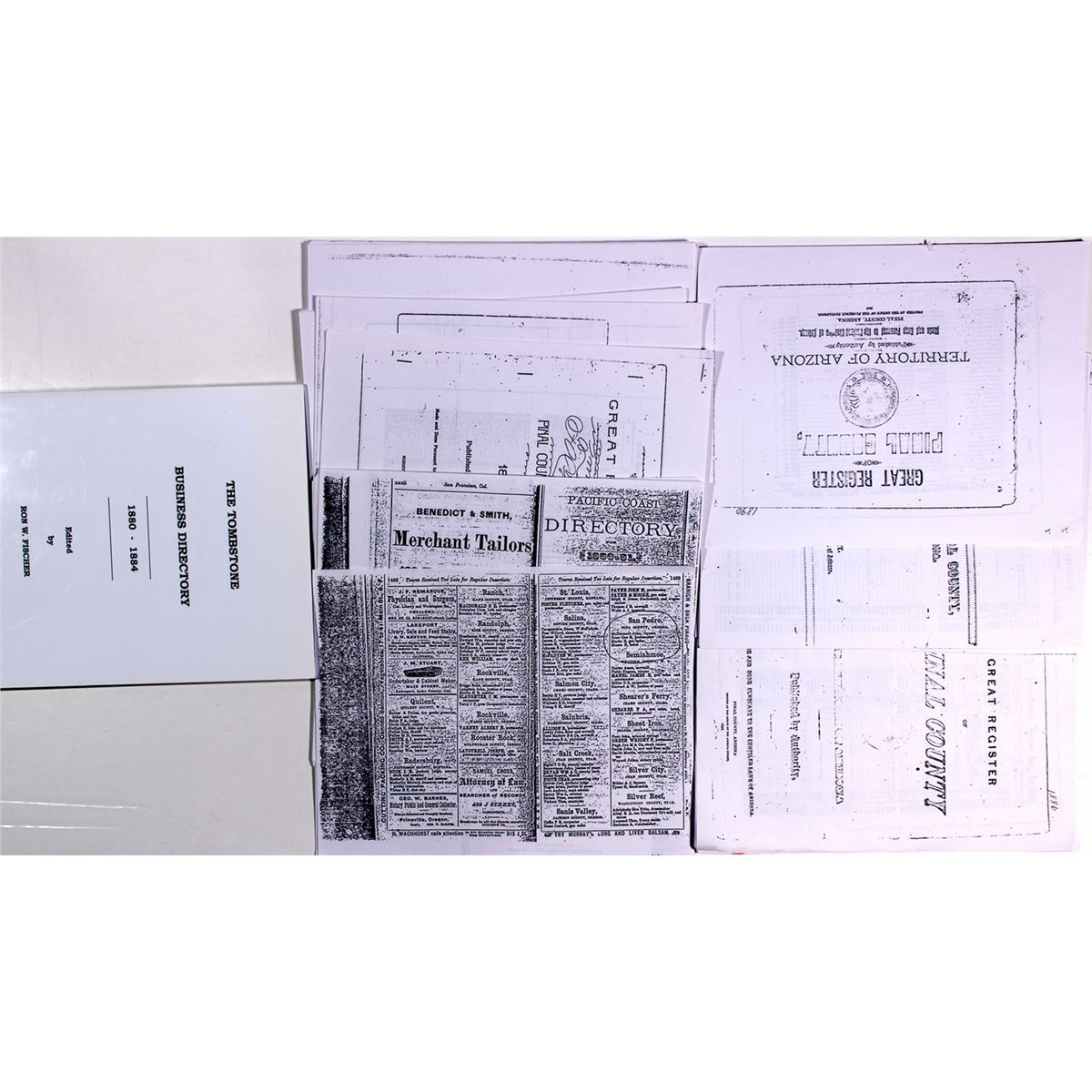 Lot of 4. 1) Fischer, Ron W., Ed. The Tombstone Business Directory: 1880-1884. Facsimile Edition (2002) of the full Tombstone, AZ directories. Shows many individual advertisements for businesses operating in Tombstone during this time including soda works, hotels, stables, wagon makers and blacksmiths. In October of 1880 there ran a "Grand Concert" at Gird's Building at Fourth and Fremont [Martin, Douglas D. Tombstone Epitaph, p. 43]. The area of Fourth Street and Fremont also housed other businesses including a barbershop, notary, and the Union News Depot that sold stationery, cigars, and tobacco. Just up the street, Mac's Restaurant and Chop House was run by James McGrath [from the directory]. 2) Arizona Business Directory and Gazetteer photocopied and loose leaf. Includes the Arizona Territory County, City, and Town Officers with additional listings of mining districts and associated superintendents (with appendix.) 3) Pacific Coast Directory for Arizona Territory, 1880-1881. Photocopied loose leaf facsimile. The directory listed over 35,000 names in the Western states and territories, though only Arizona is included here. The introduction to the Arizona section states that the territory mountains "team[ed] with minerals, [though] very few had the courage to face the trials incident to a settlement there." Also includes Arizona sections from McKenney Directory Co. From San Francisco, CA and the Arizona section of the Mercantile Guide Business Directory, 1904 Ed. The 1905 City Directory for Gallup, NM is also included. All loose leaf held in a yellow paper envelope. 4) Great Register of Pinal County (1886-1911) photocopied facsimiles (though a few years are missing.) Initial printing of the Register was completed at the Office of the Arizona Citizen. Lists Country of Nativity and whether or not naturalized. Pinal County was formed in 1875. Pinal means "deer" in the Apache language. The Apache of the area were called "Pinalleros" by the Spanish [Barnes, Will C., Arizona Place Names, 1988]. Staple bound and in a yellow paper envelope. - Vinegar Collection