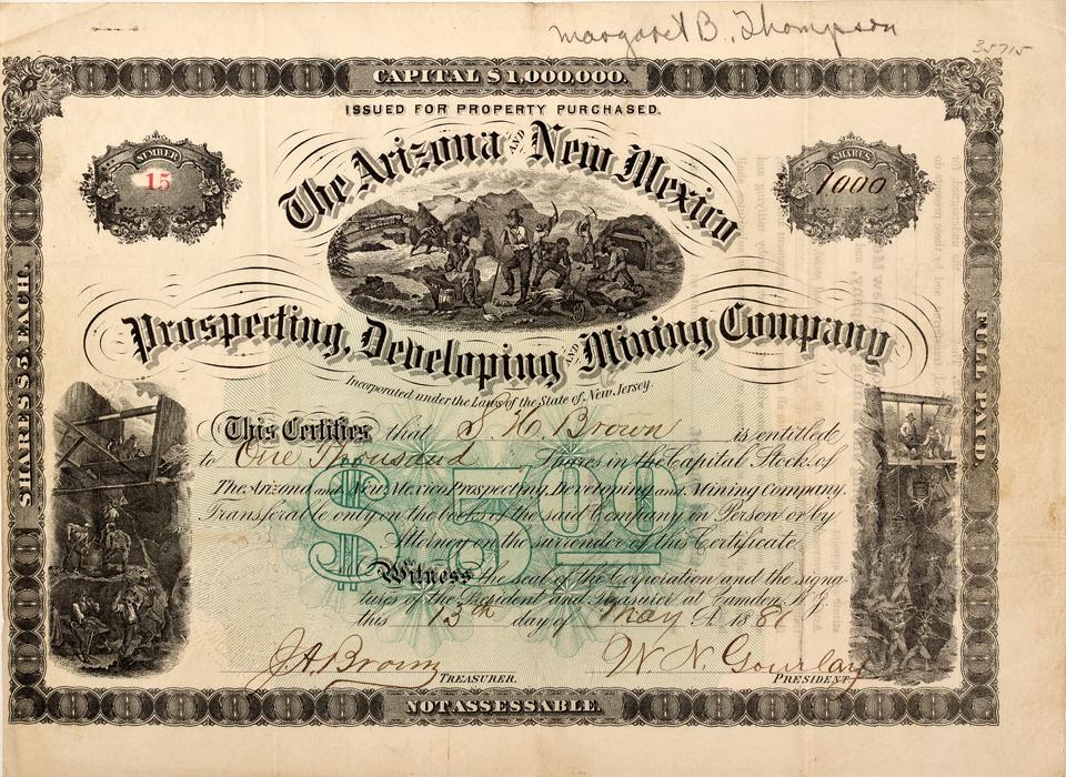 Incorporated in New Jersey in 1881. Cert. #15 issued to S.H. Brown for 1000 shares. Signed by W. N. Gourlay, president, and J.A. Brounz, treasurer. Three mining scene vignettes at left, center and right. Black border and print with green under print ($5.00) on crème paper. U/C. No printer noted. Datelined Camden, New Jersey. 8 ½ x 11 ½.”